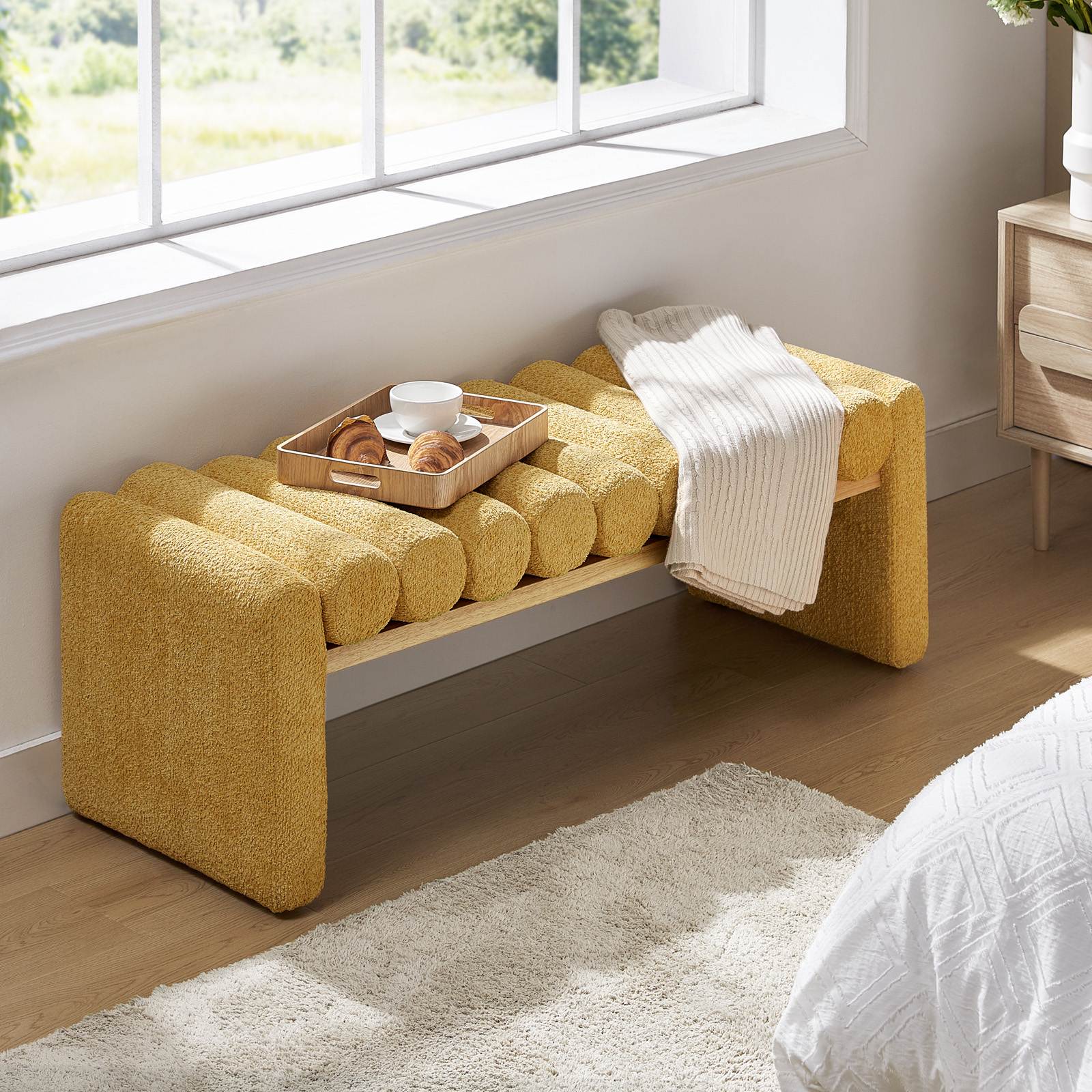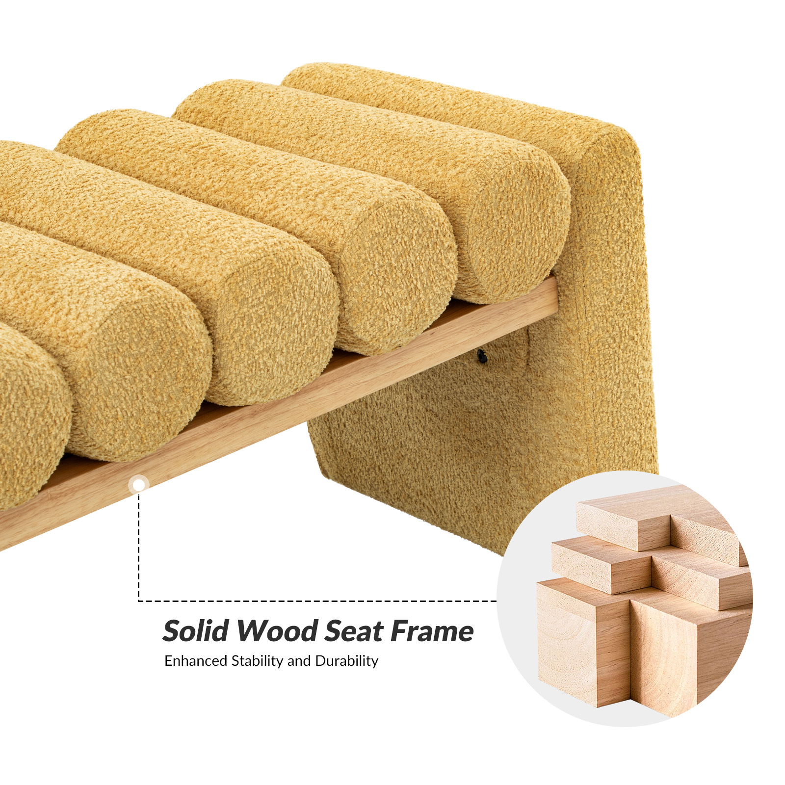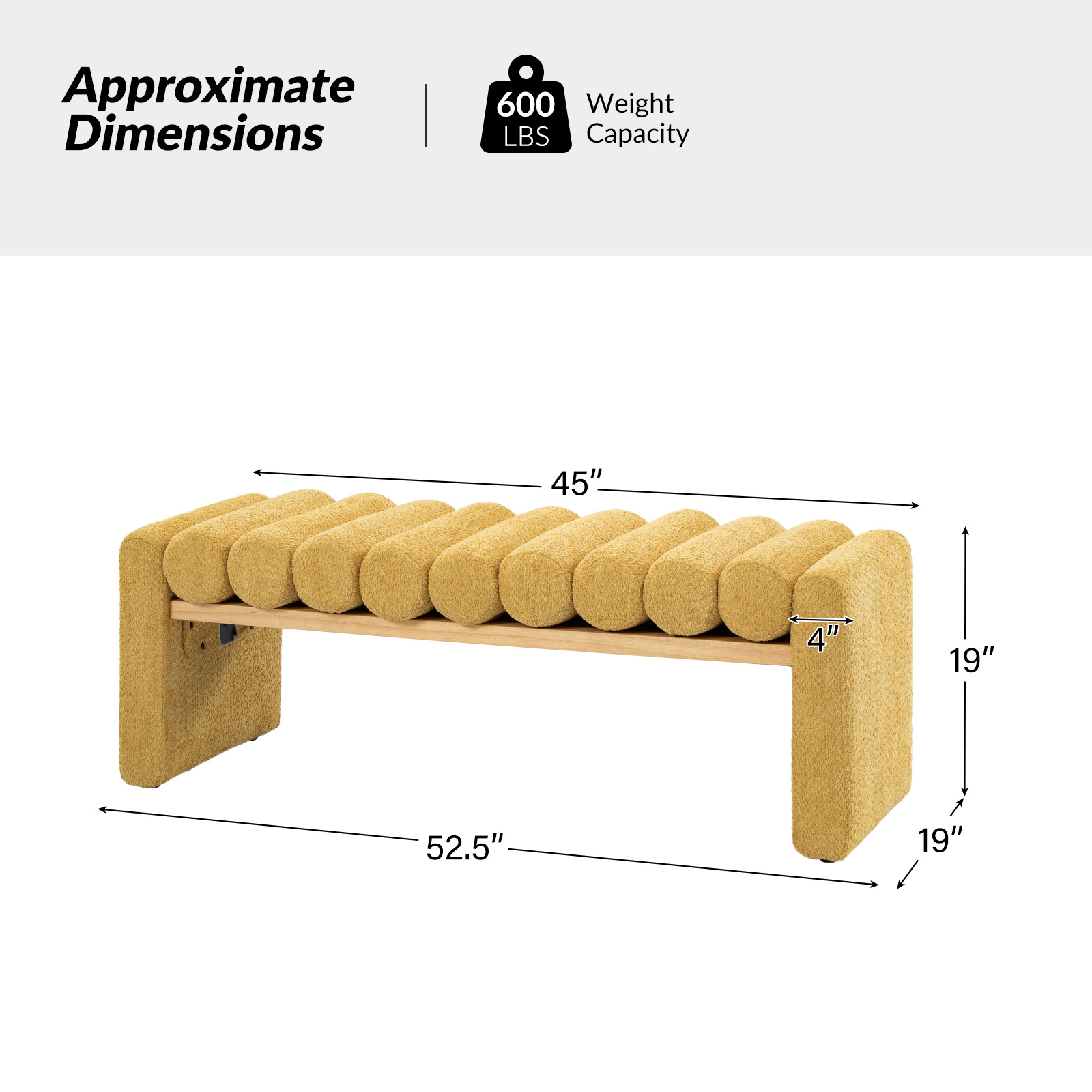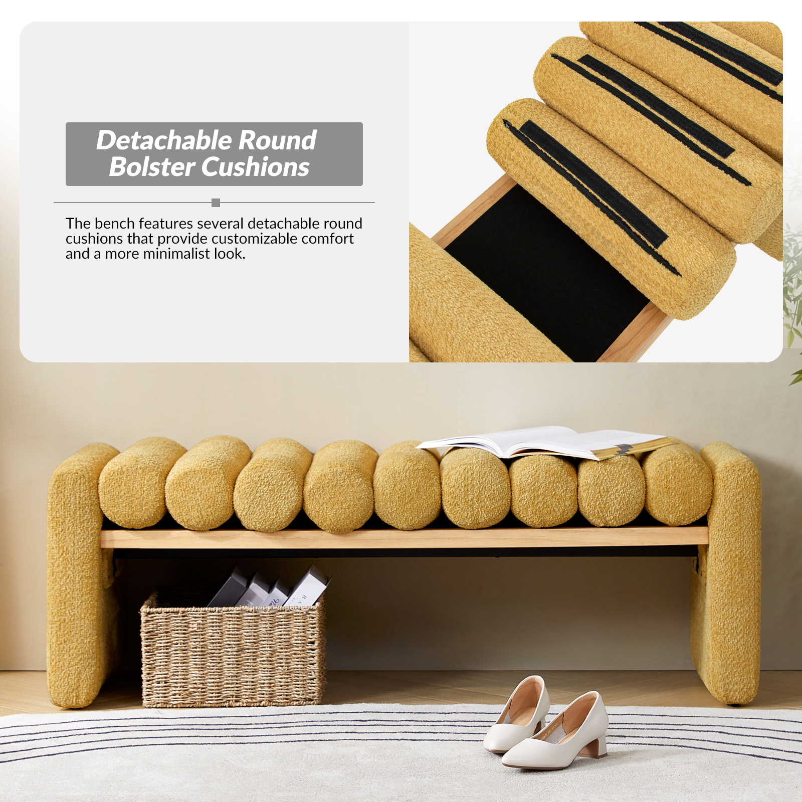 – Elevate your home with this modern bench, a fusion of minimalist design and practical use. This bench features a robust solid wood seat frame, highlighting the wood’s natural grain and ensuring lasting durability. The unique H-shaped design provides both visual interest and structural support. Enjoy customizable comfort with removable round bolster cushions. Perfect for entryways, living rooms, or bedrooms, this bench provides comfortable seating and a stylish accent, blending seamlessly into modern interiors.
