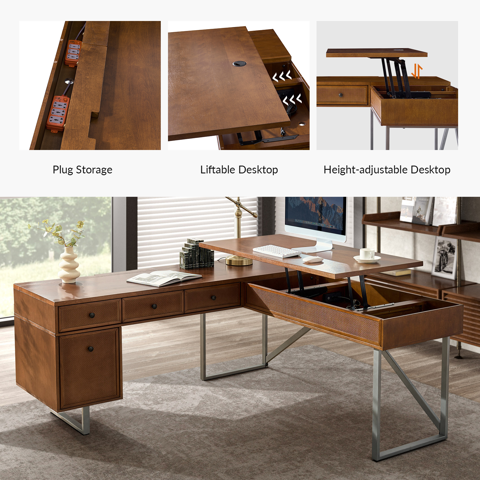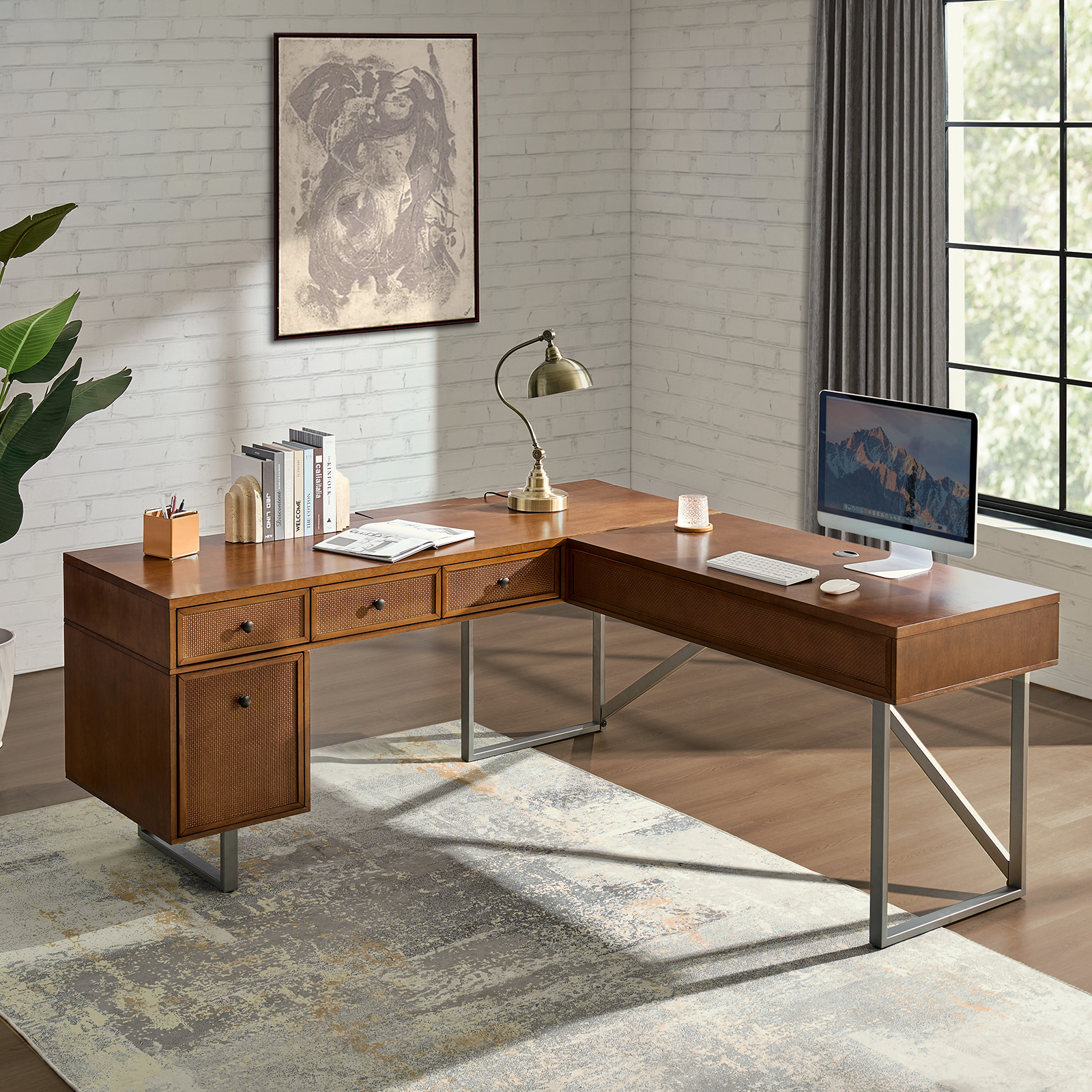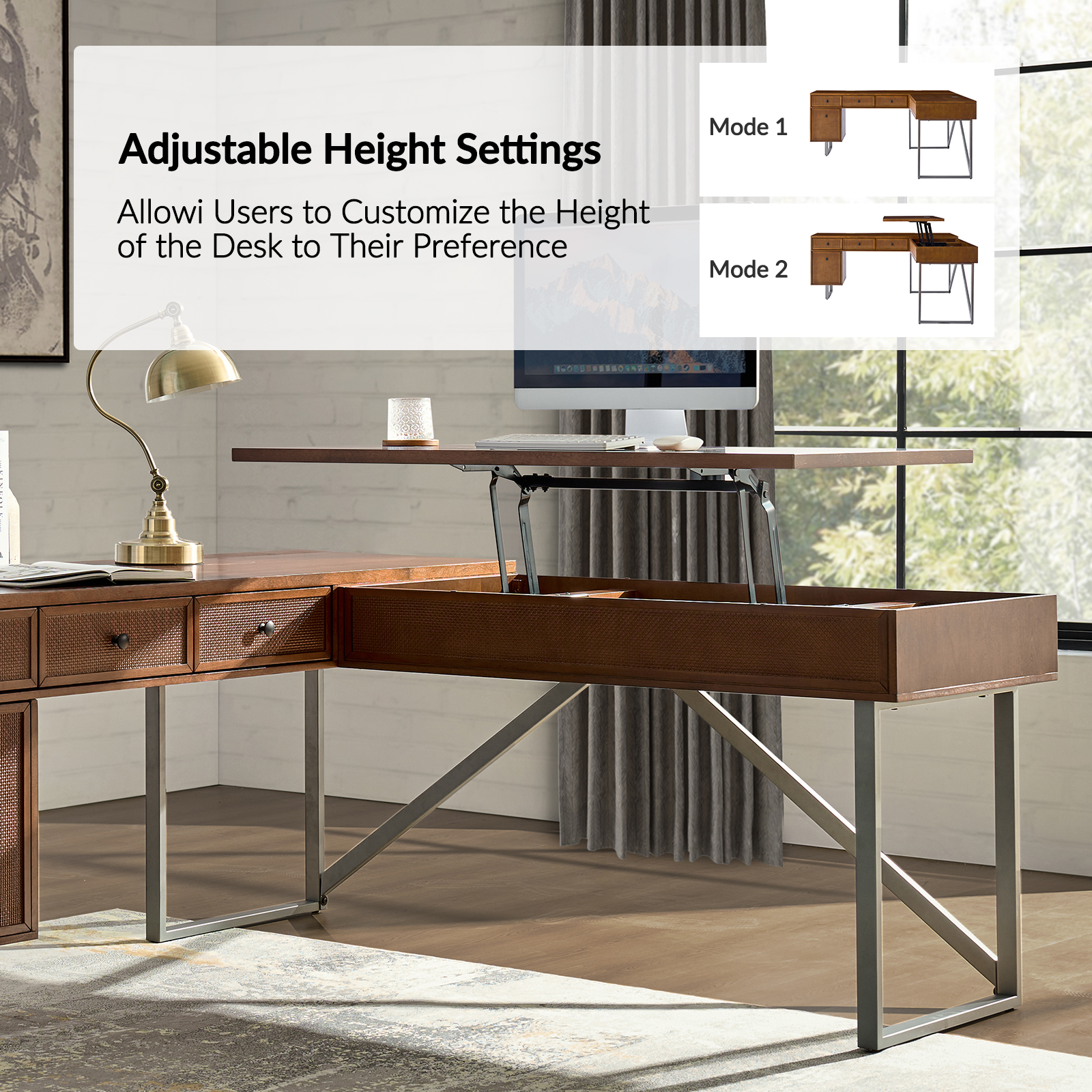 The Alfons Walnut L-Shape Sit Stand Industrial Desk is an innovative addition to any workspace, blending ergonomic design with mid-century modern style. This desk offers the flexibility of a standing desk with an easy-to-use height adjustment system. The L-shape provides ample workspace, while features like a rattan-finished file drawer and integrated cable management enhance both functionality and aesthetics.