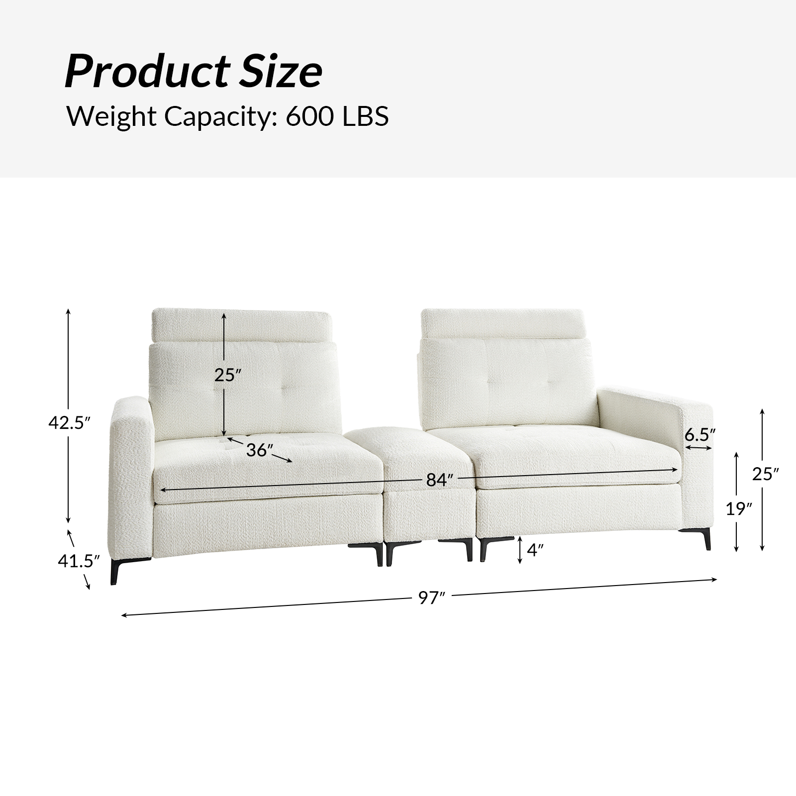 - Dimensions (WxDxH): 97 x 41.5 x 42.5 inches