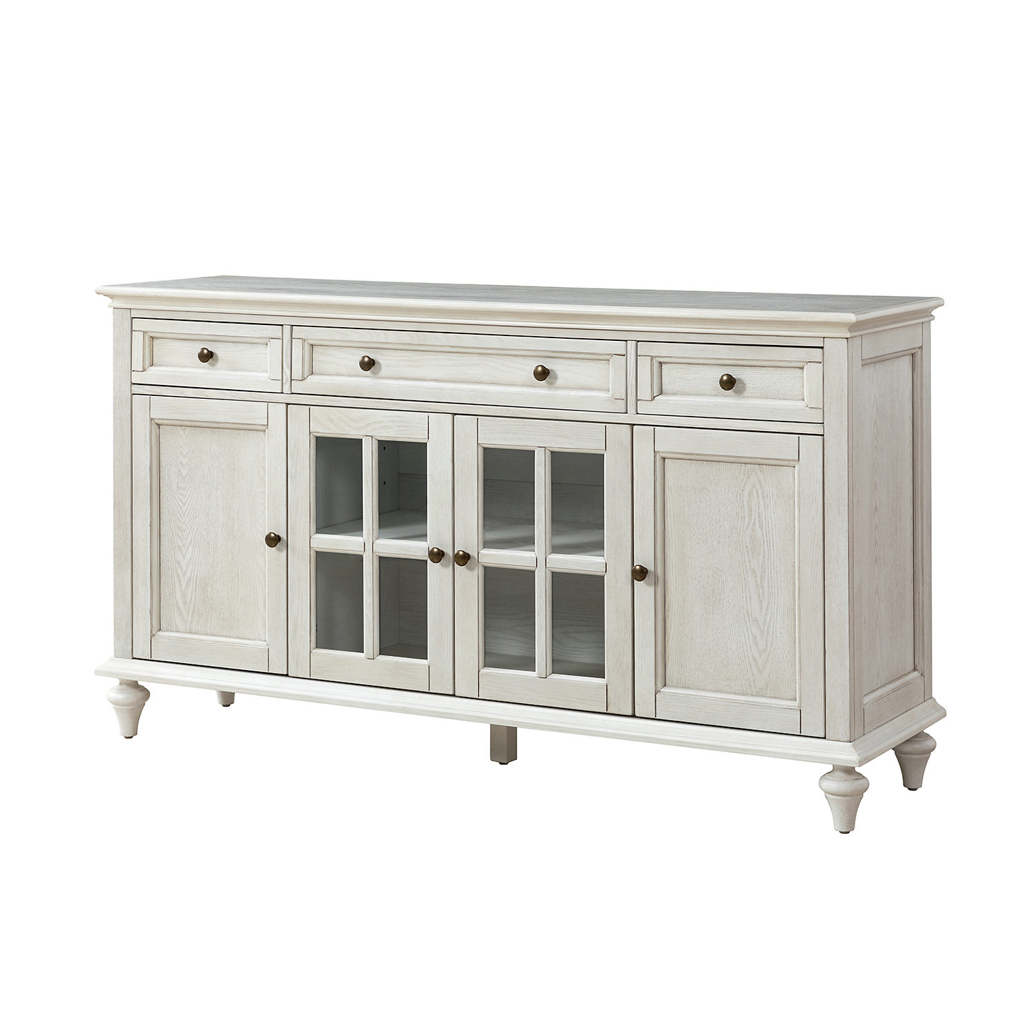 The Alvise White 3-Drawer Solid Wood 58-Inch Storage Sideboard brings a touch of classic elegance to any room. With its clean white finish and traditional design, this sideboard not only enhances your décor but also provides ample storage space.