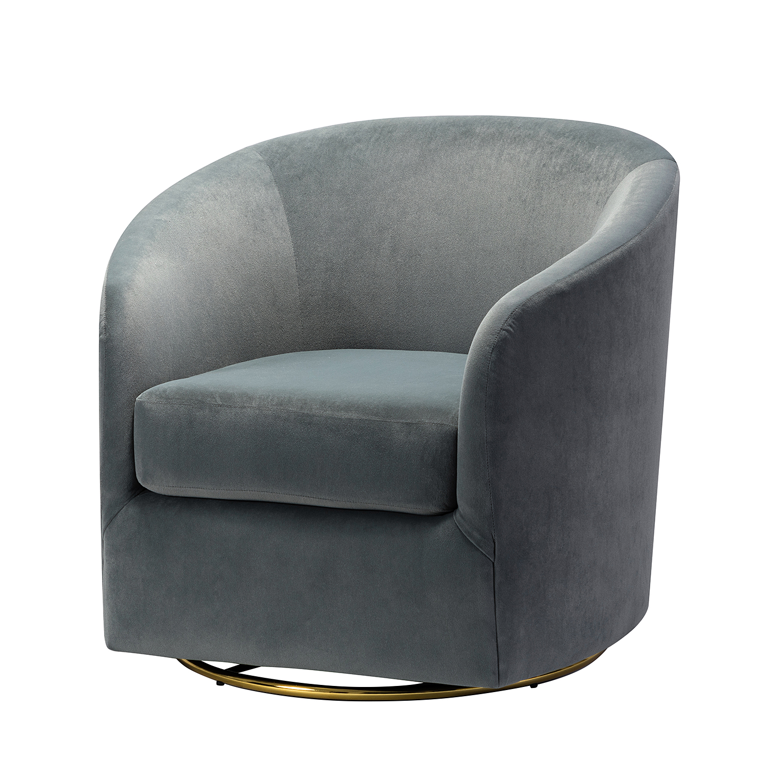 This velvet swivel accent chair adds style and comfort to your man cave. The gold metal swivel base lets you turn easily. The chair has a barrel shape and a solid wood frame. It is filled with medium-density foam and s-springs for comfort. The velvet fabric is soft to the touch. The grey color will match most rooms. Use it in your living room or home office. It’s a great place to relax or plan your next big adventure. Some assembly is required. The overall dimensions are 31.5″ (W) x 30″ (D) x 29″ (H). The seat dimensions are 18.5″ (W) x 22″ (D) x 17″ (H). The chair weighs 41 lbs.