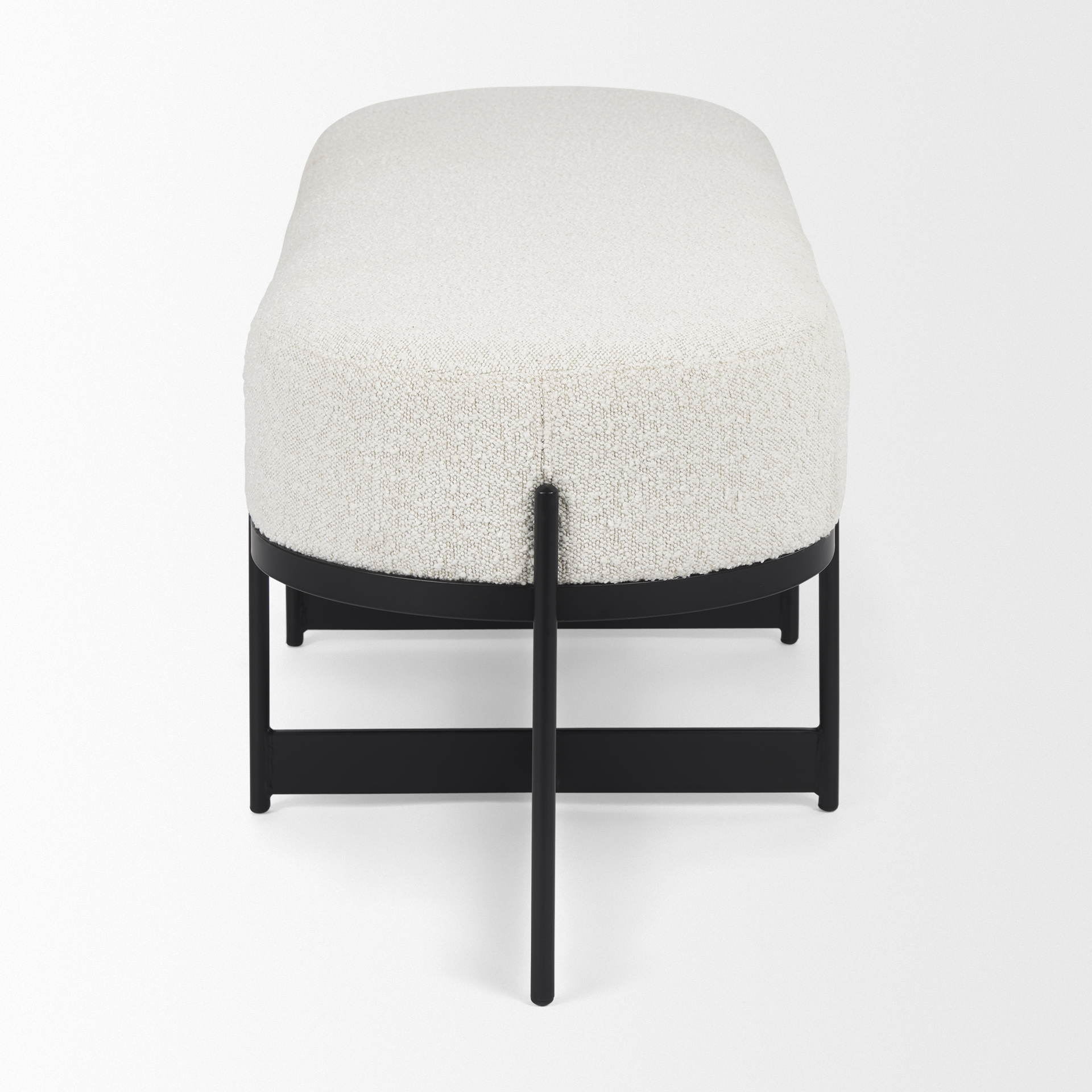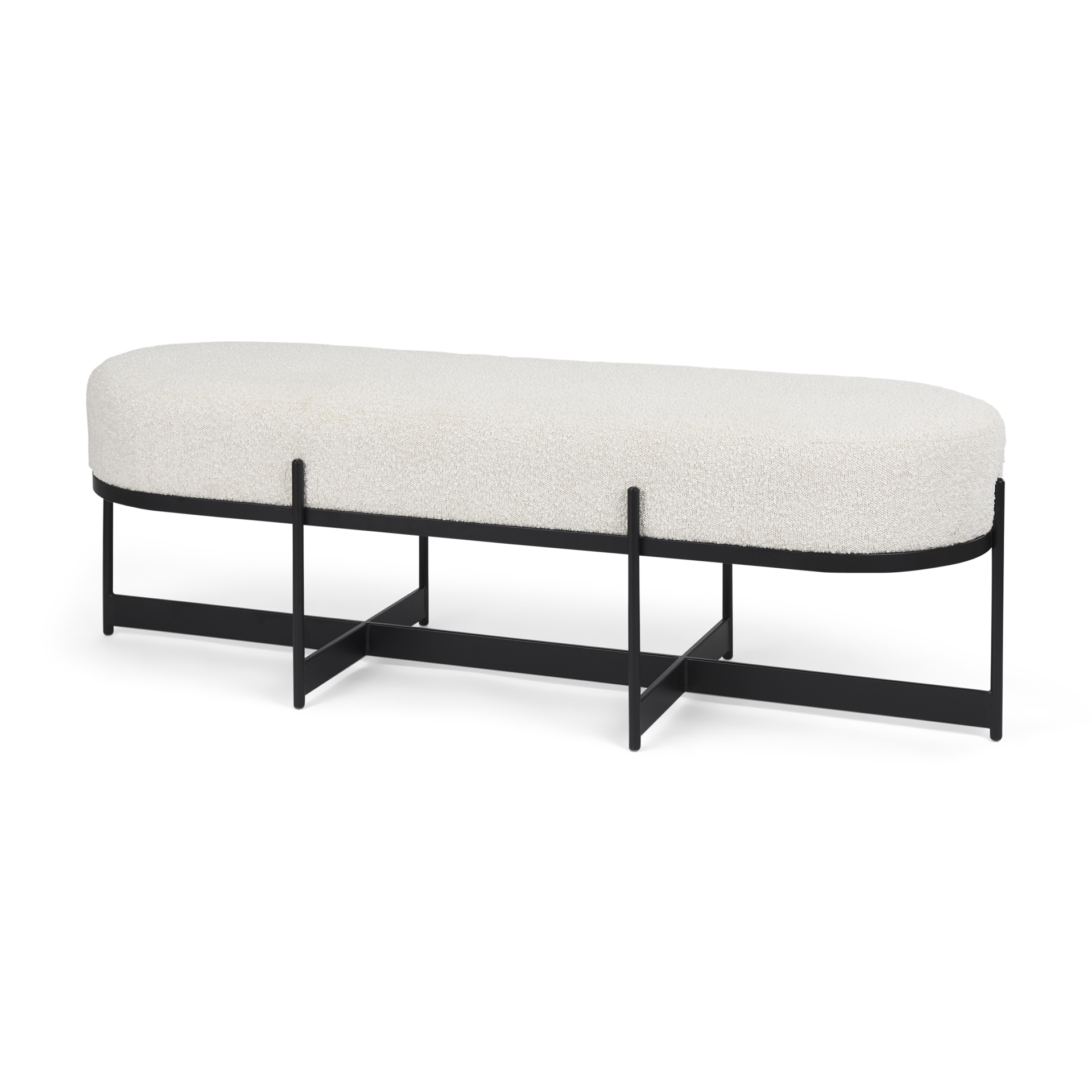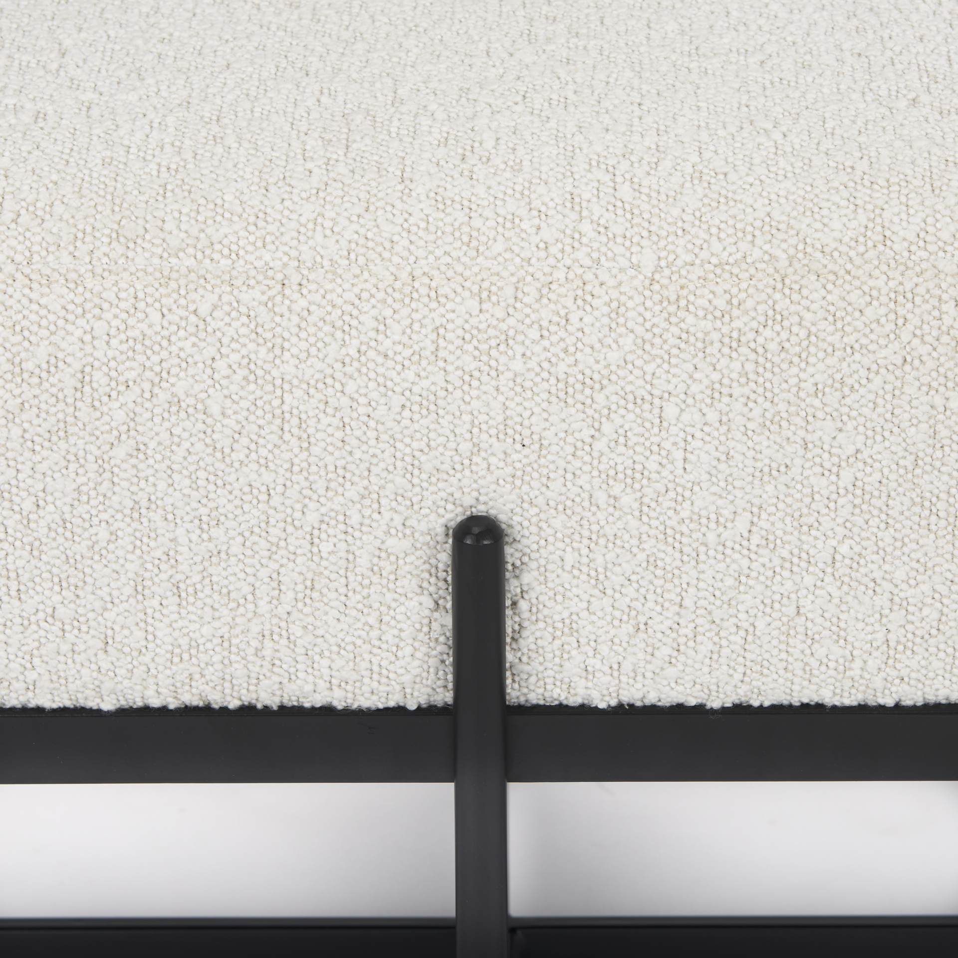 This upholstered bench is a MUST-HAVE! Indulgent bouclé fabric meets a sturdy iron frame, creating the perfect piece for your modern home or office. The bench stylishly combines the soft texture of creamy bouclé with the smooth, matte black finish of a powder-coated iron base. Strong yet elegant, this ottoman oozes contemporary appeal!