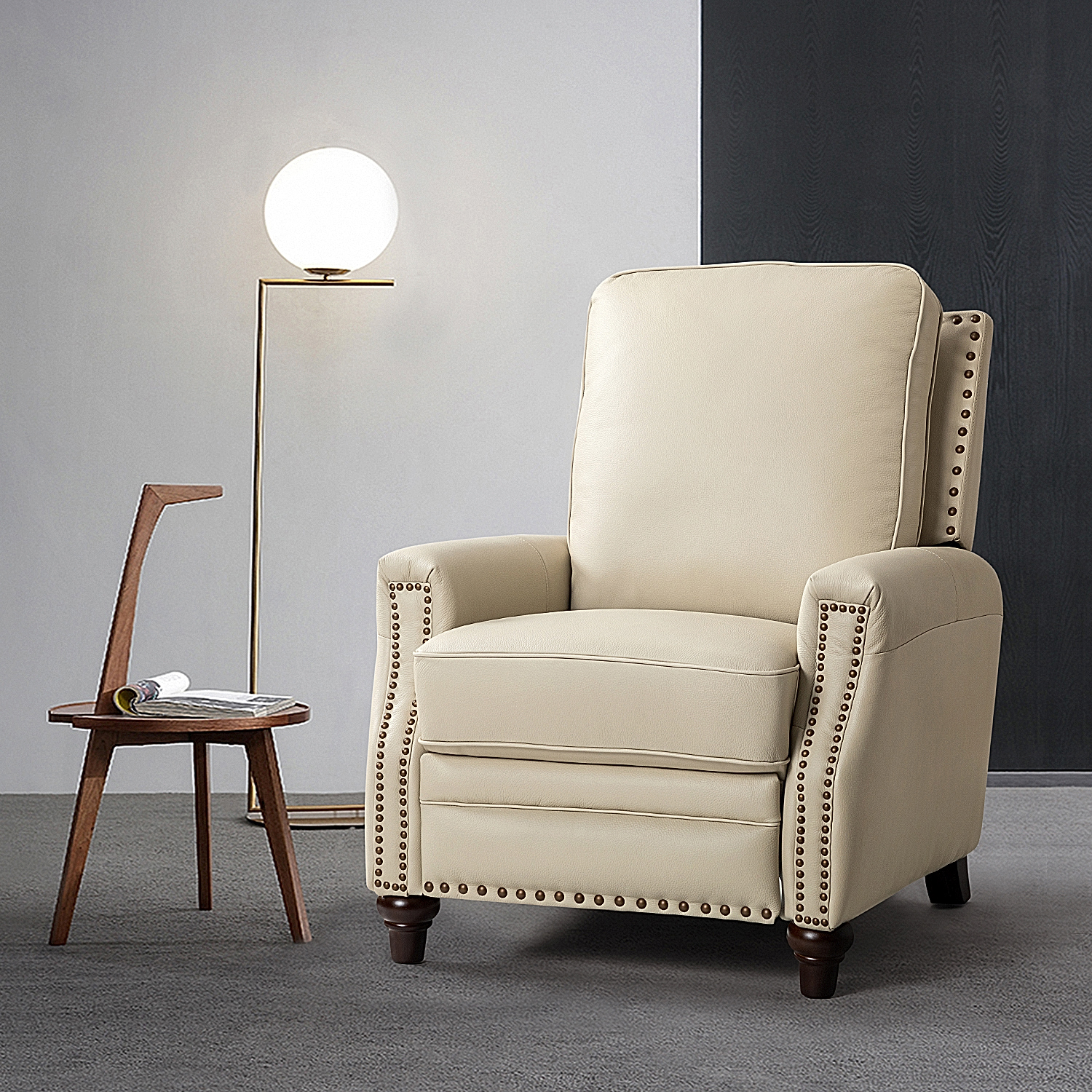 Enjoy comfortable seating and back support for long-term sitting, TV viewing, or a relaxed recline. Simply push back to recline – no levers or buttons needed! Glam nailhead trim embellishes the back and outlines the shape of the arms and the bottom of the footrest, lending a rich and whimsical accent to your space.