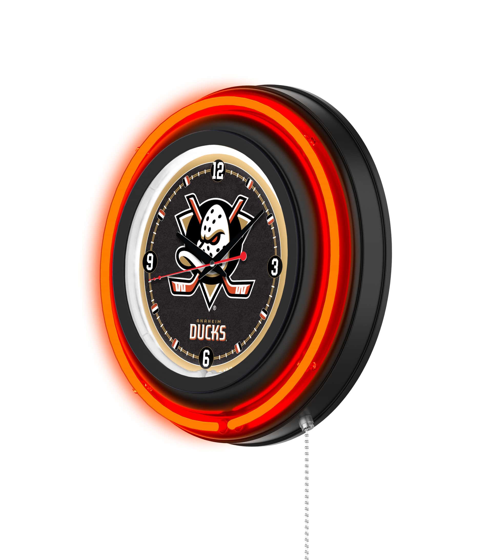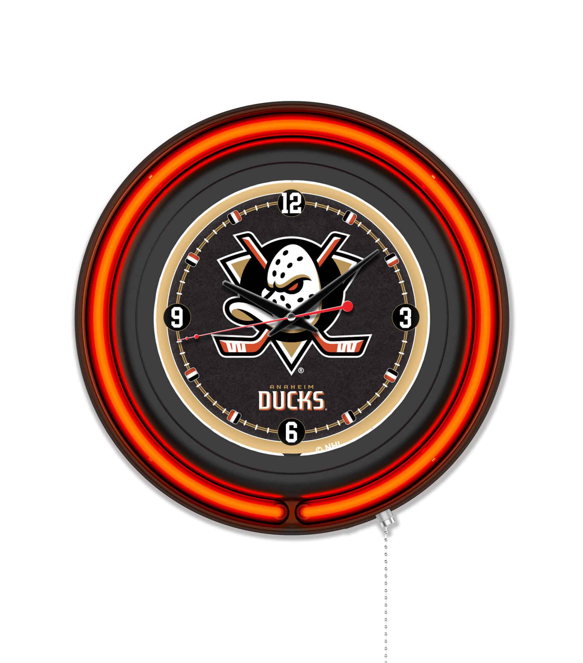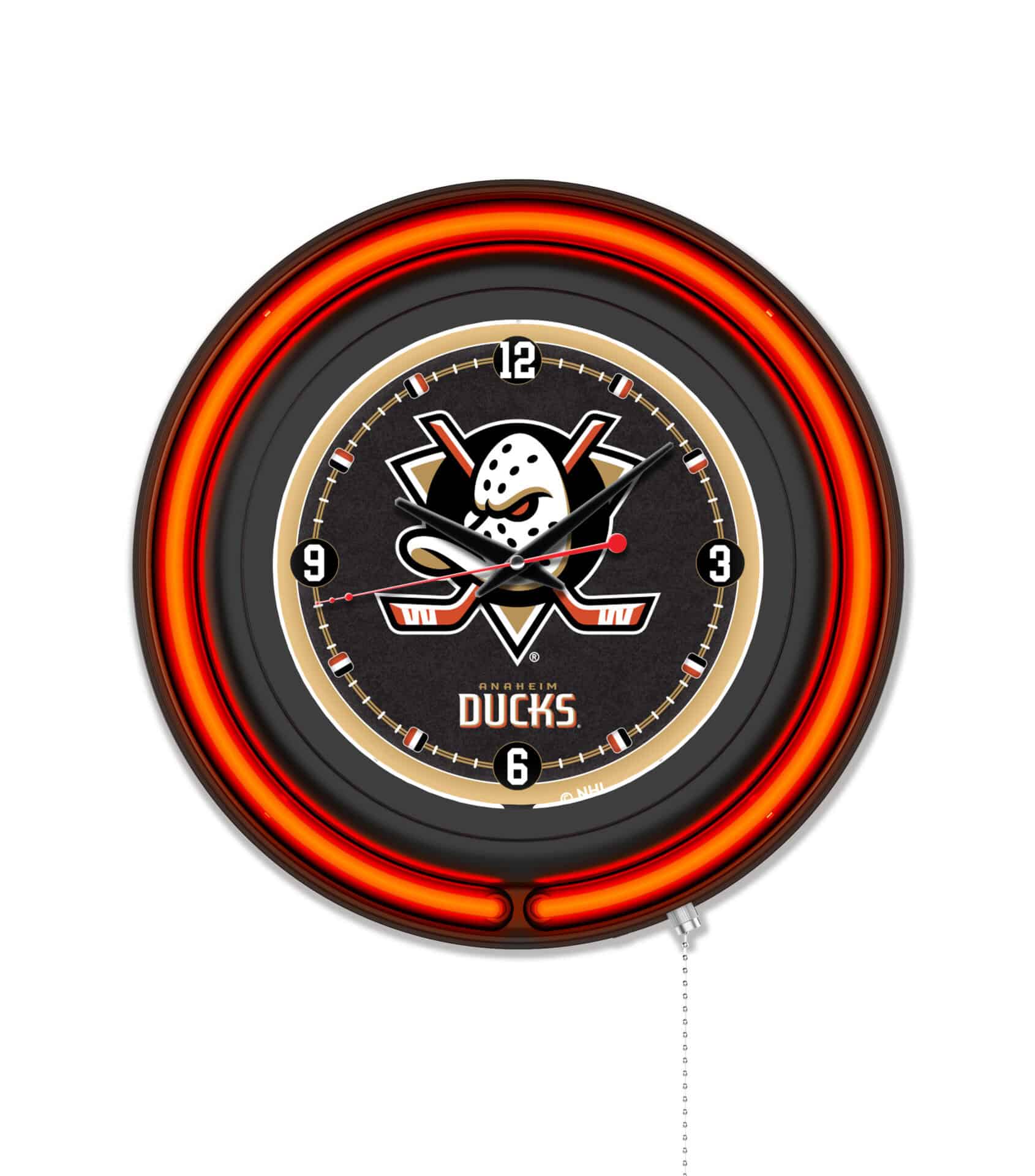 The Anaheim Ducks 15-Inch Neon Logo Clock in Black is the ultimate addition to any sports fan’s man cave. This striking clock features a sleek black casing and vibrant neon accents that beautifully illuminate the custom printed clock face. With its brilliant white inner neon ring, this clock not only keeps accurate time but also showcases your team pride in a stylish way. The easy-to-use pull chain allows you to turn the neon lights on and off effortlessly, making it a perfect fit for any setting.