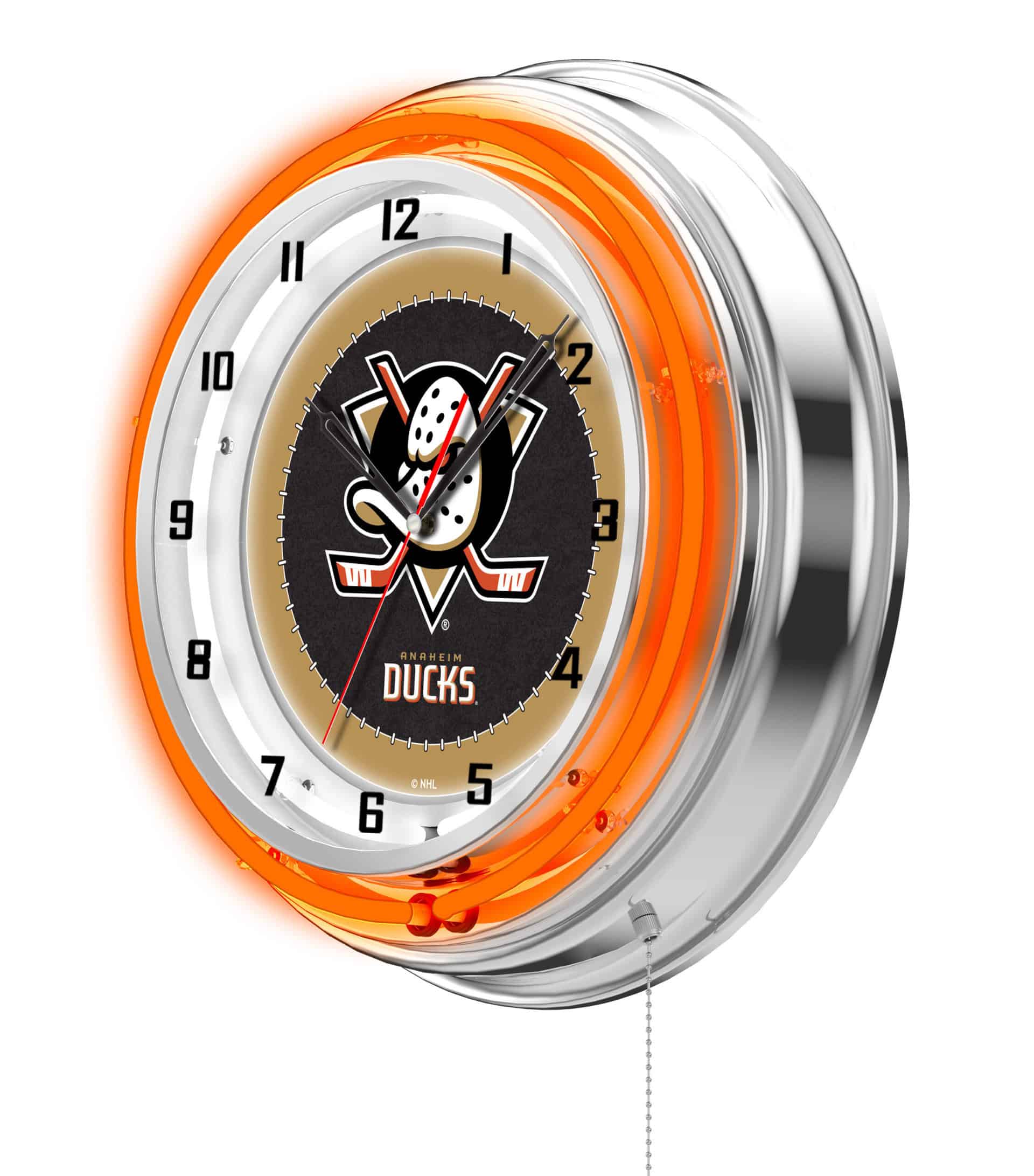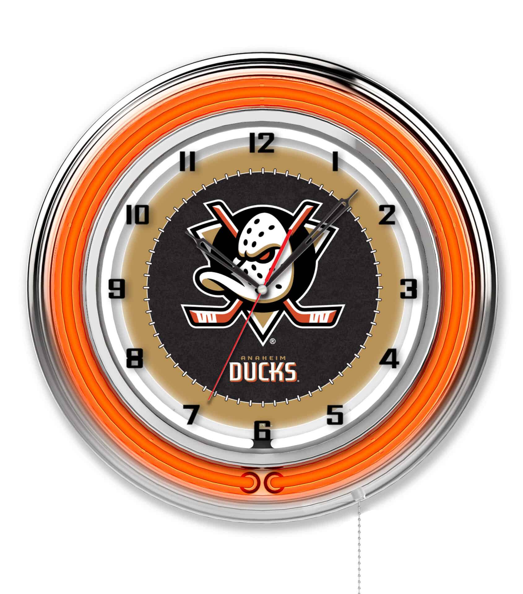 The Anaheim Ducks 19-Inch Neon Logo Clock in Chrome is a stunning addition to any sports fan’s collection. With its vibrant neon rings and sleek chrome casing, this clock not only keeps time but also showcases your team pride in style. The clock features a custom printed face illuminated by a brilliant white inner neon ring, making it a perfect centerpiece for your man cave or game room. Easily turn the neon lights on and off with a pull chain, and enjoy the accurate quartz movement powered by a standard AA battery. This clock is an ideal gift for sports enthusiasts or a fantastic treat for yourself.