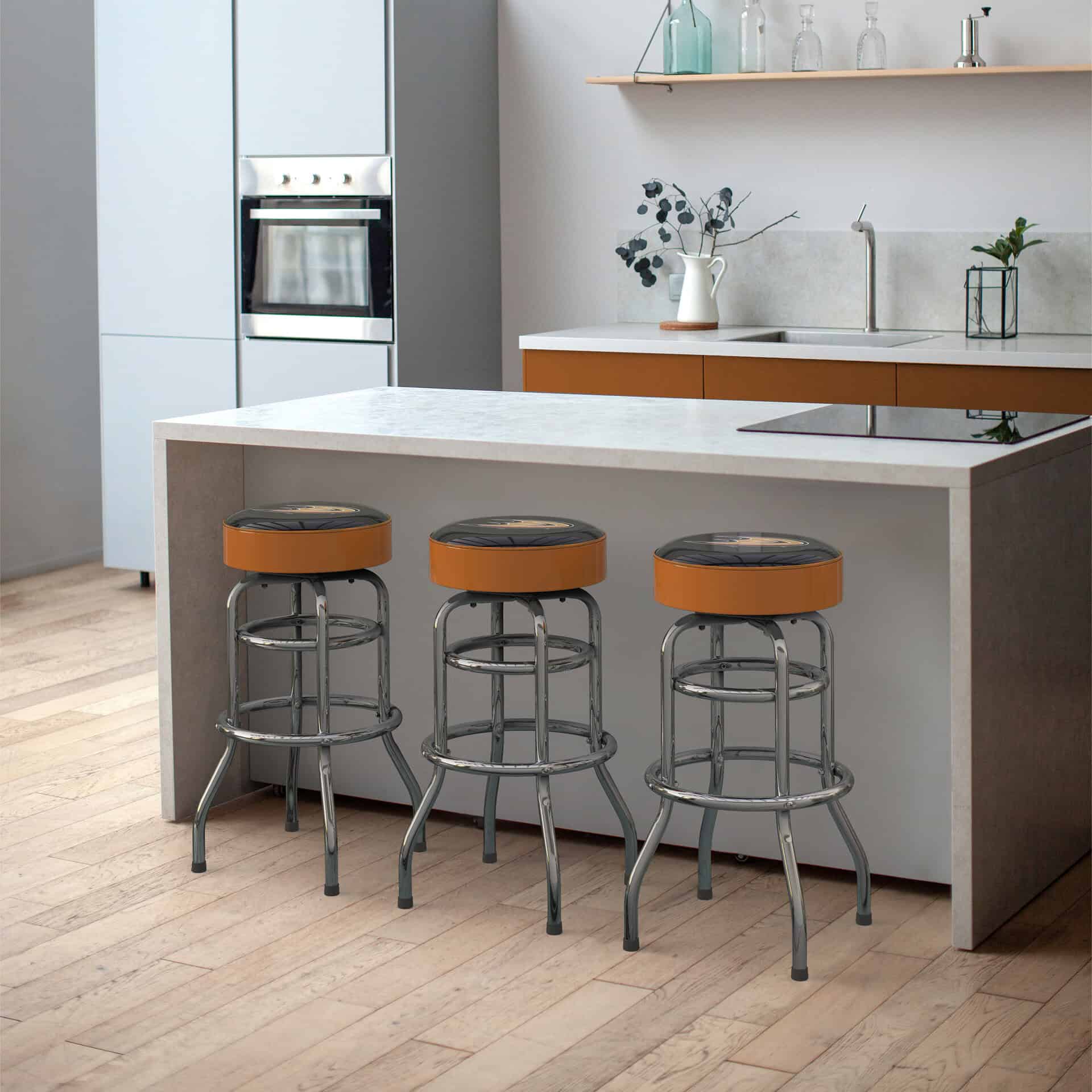 Enhance your fan cave with this commercial-grade bar stool, meticulously crafted to showcase your team pride for years to come. This bar stool combines robust construction with vibrant team colors and logos, ensuring lasting durability and style. The reverse-printed vinyl seat guarantees that your team’s emblem remains pristine, resisting scratches and wear.
