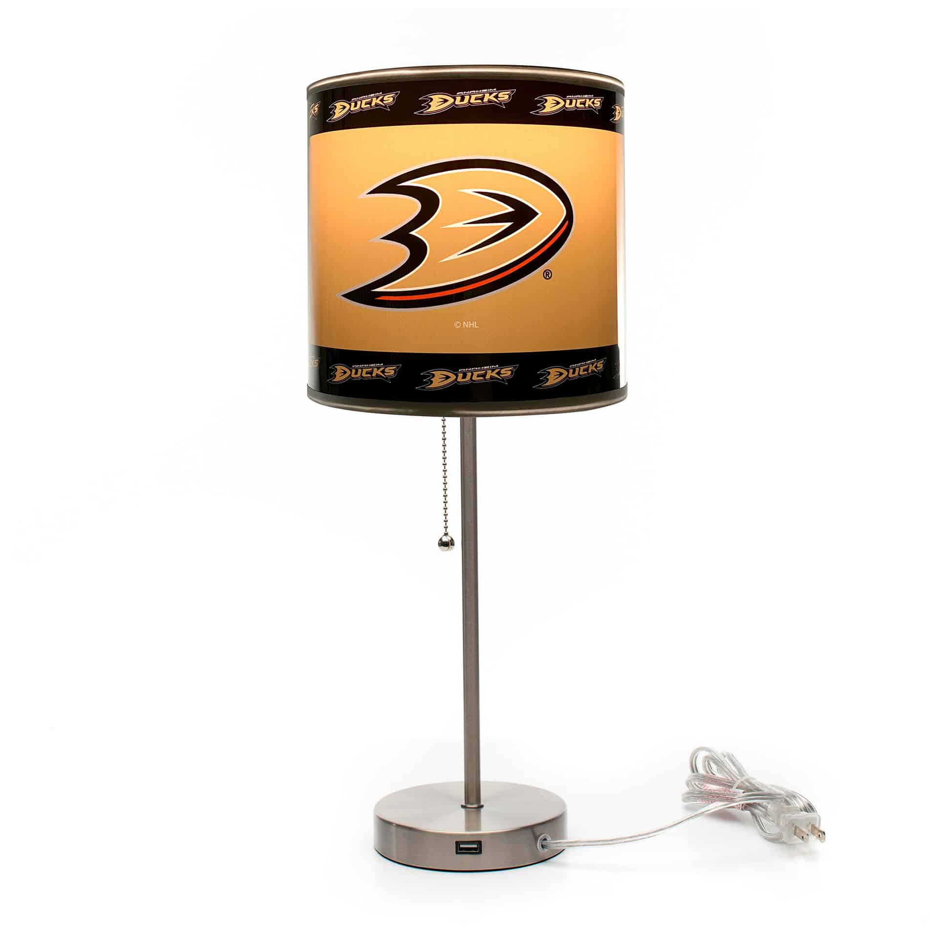 Light up your space and show off your Anaheim Ducks pride with this sleek chrome lamp! Featuring a USB charging station, this lamp is perfect for any room in your house or office. The lamp comes complete with a clear vinyl lamp shade and a printed insert showcasing your favorite team. Want to change up the look? Simply buy a new stand-alone insert from our assortment of designs for a fast and affordable room refresh!