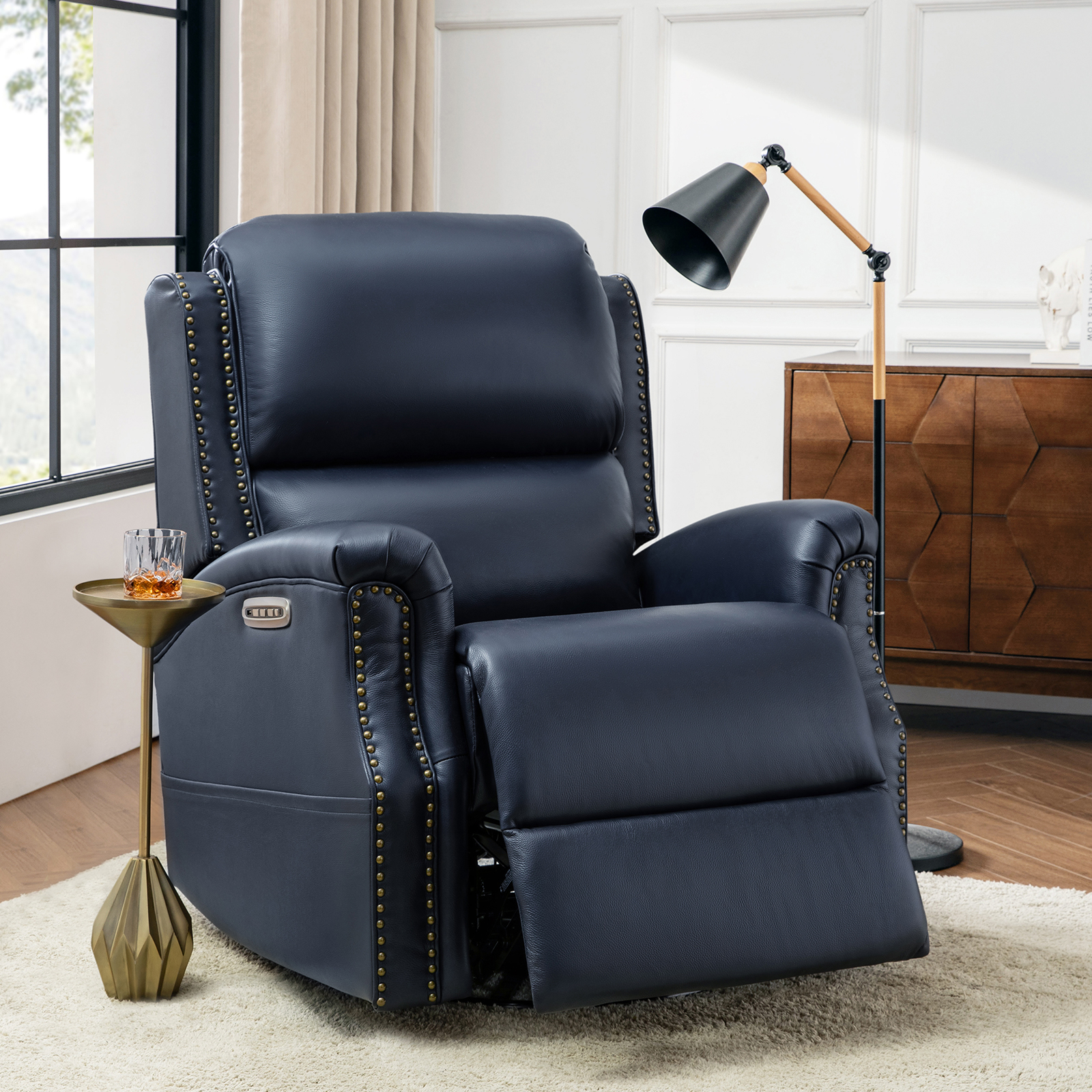 Get ready to experience the pinnacle of relaxation with the Andreas Navy Leather Power Rocking Swivel Recliner! This traditional recliner is upholstered in genuine leather on all contact surfaces for maximum comfort and durability. Enjoy the smooth rocking and swiveling function, perfect for unwinding after a long day. Stay connected with the built-in USB port, and customize your comfort with the electric backrest and leg rest that operate in sync.