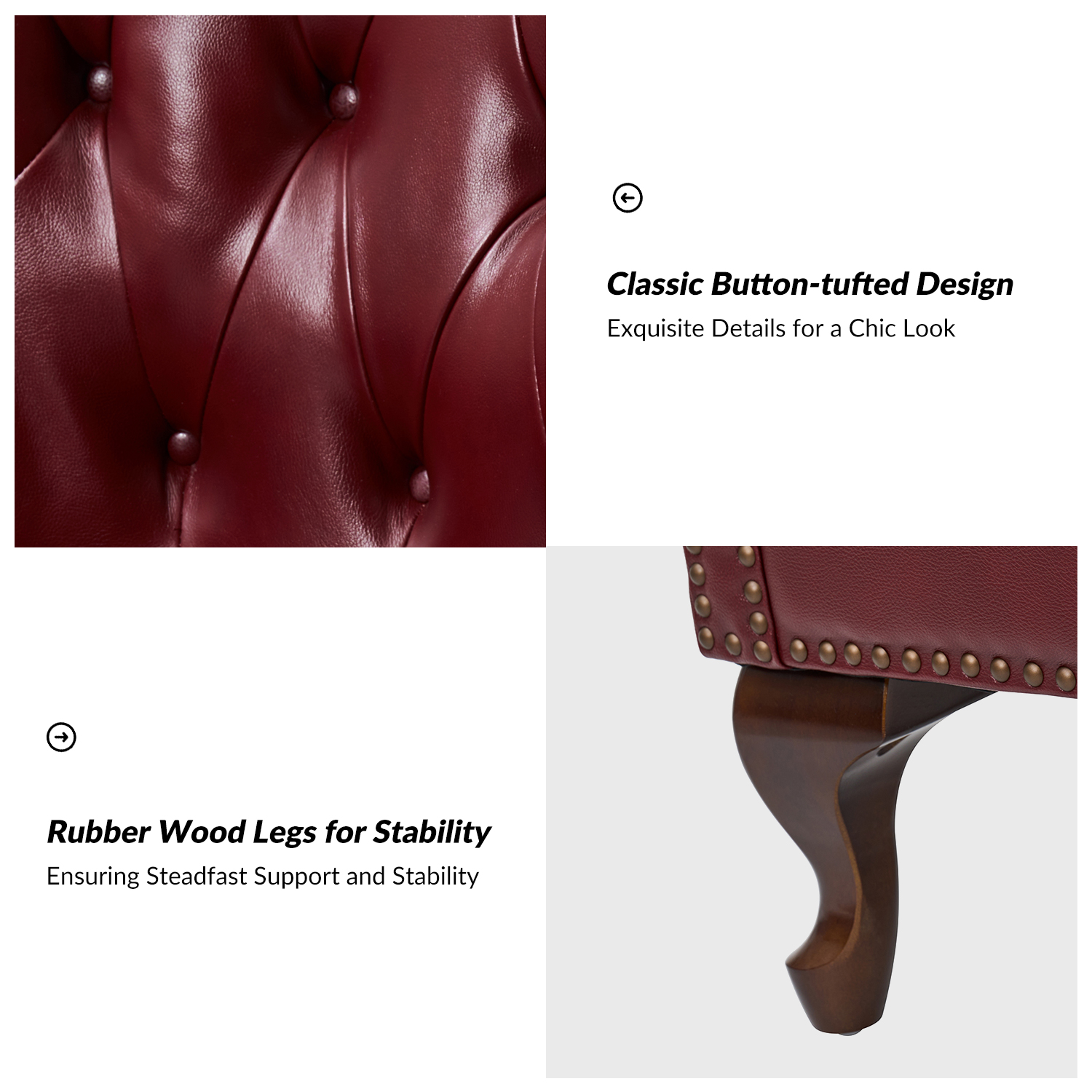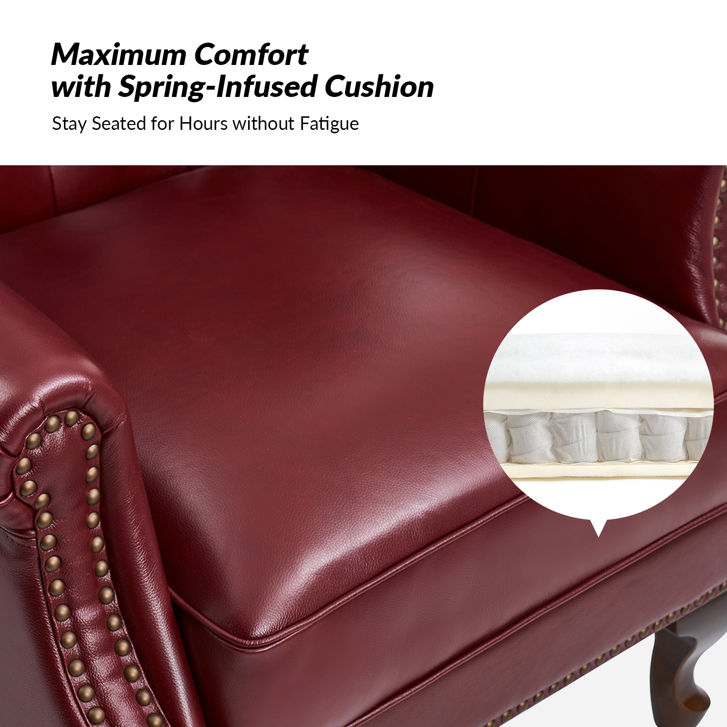 The Anthony Burgundy Genuine Leather Wingback Armchair is a timeless piece designed for traditional settings. It features solid wood legs, rolled arms, and a distinctive winged back, exuding vintage flair and making it a captivating centerpiece in any room. Wrapped in plush, foam-filled genuine leather, this armchair offers both luxury and warmth. The button-tufted detailing and nailhead trim along the arms showcase exquisite craftsmanship.