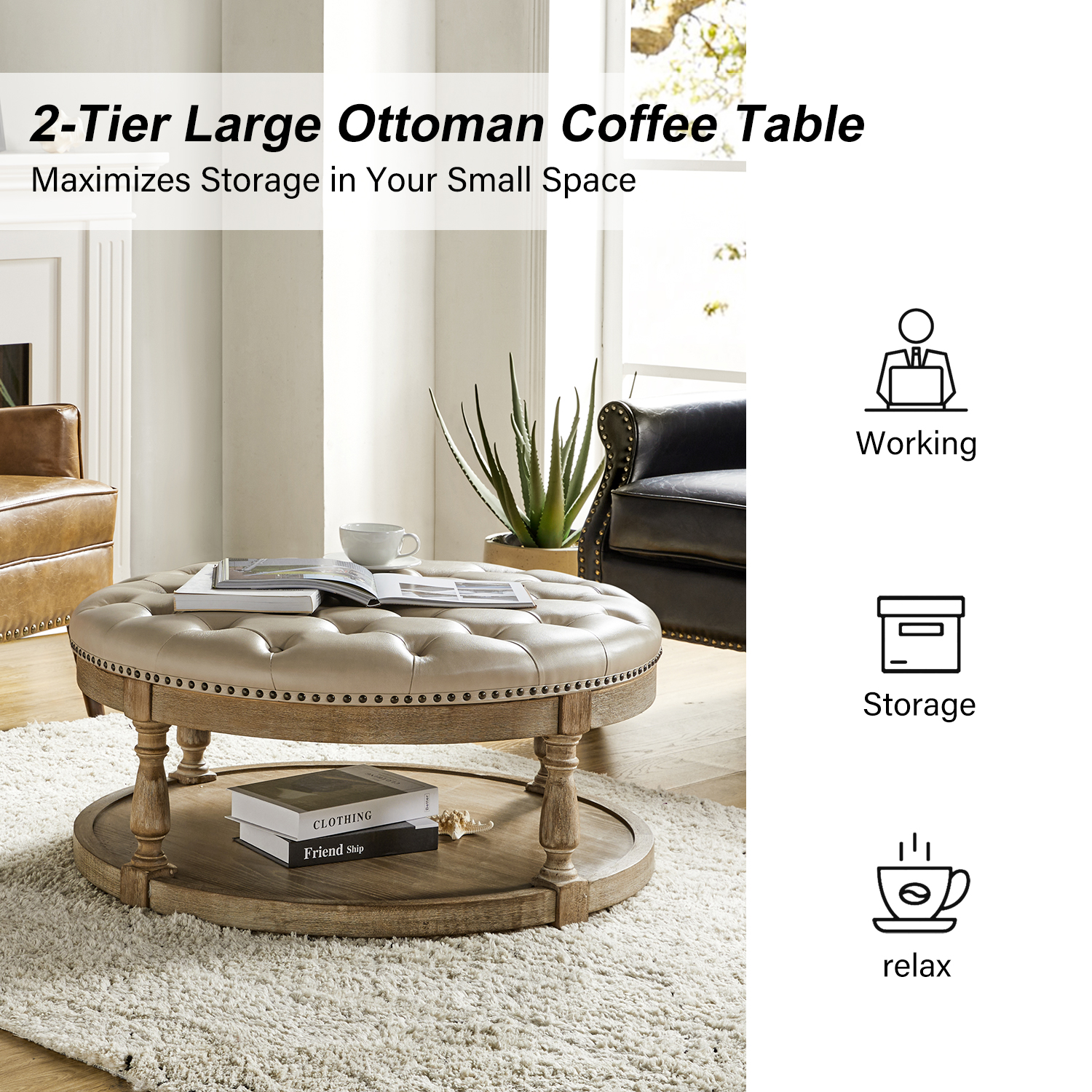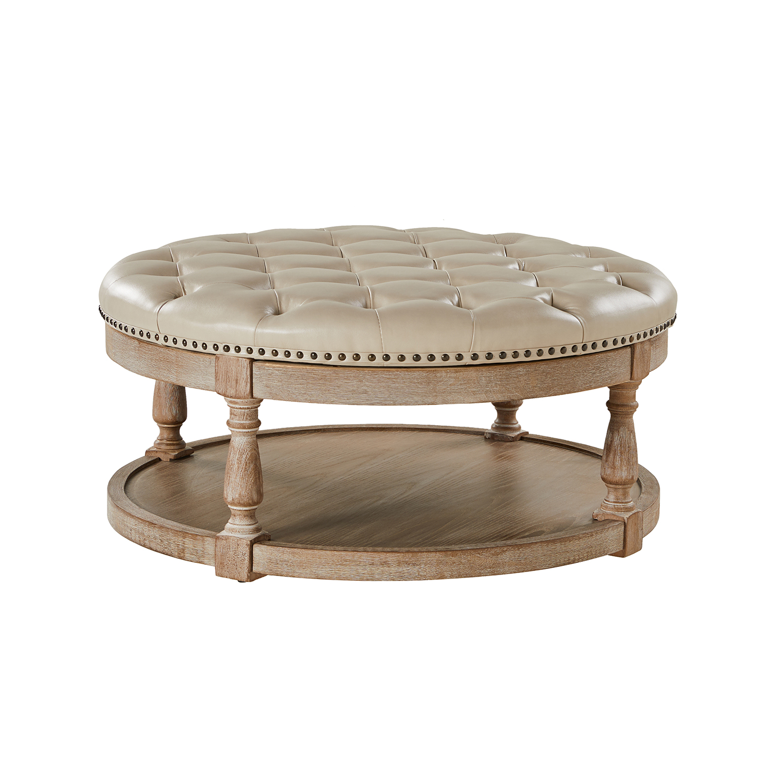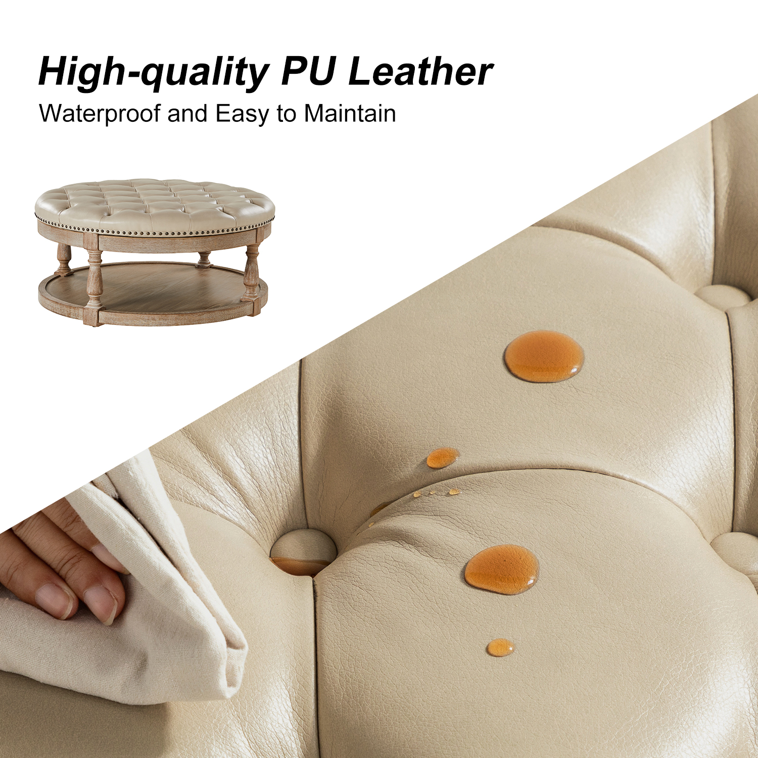 Add glamour to your home with the Antonia Beige Vegan Leather Round Cocktail Ottoman with Storage. This ottoman blends farmhouse charm with traditional style, making it a versatile addition to any living space. Whether you need a spare seat, a comfortable footrest, or a stylish coffee table alternative, this round cocktail ottoman is sure to be a favorite.