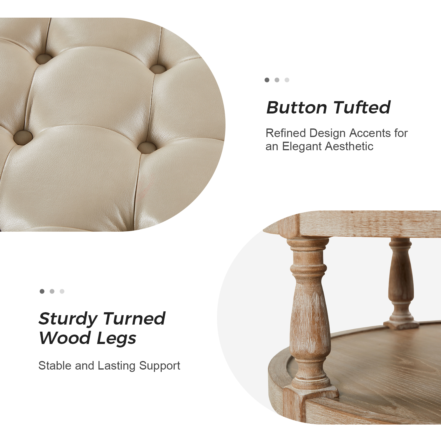 - Visual Appeal: Button-tufted seat, nailhead trim, and spindle-shaped legs create an attractive focal point.