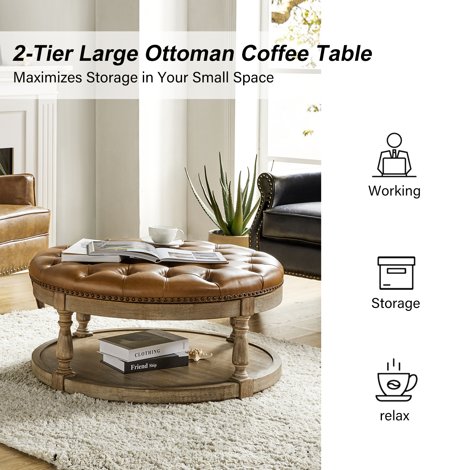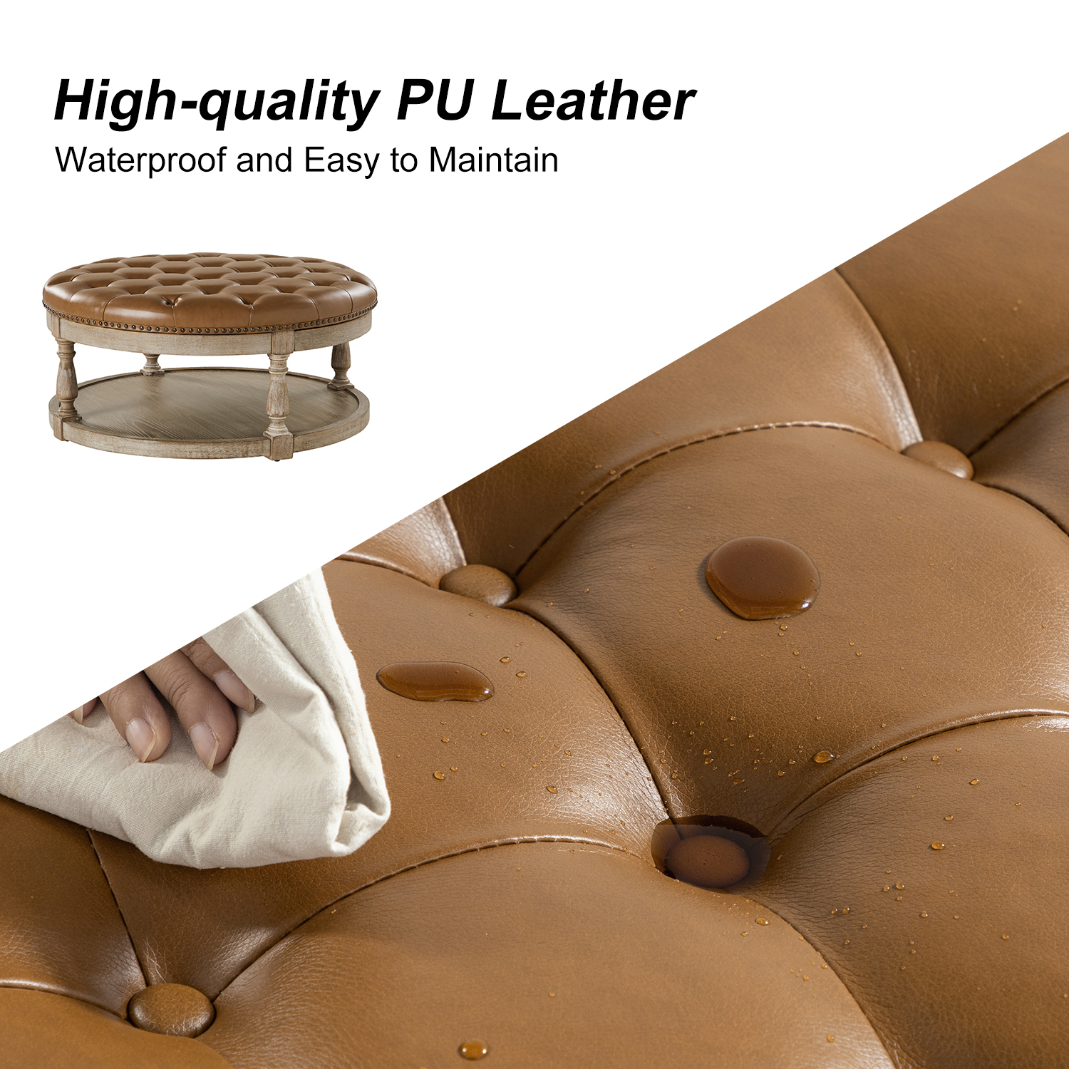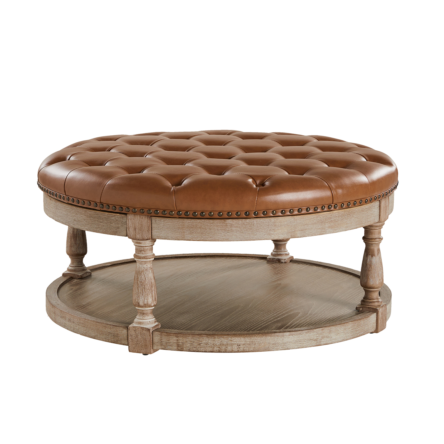 Add a touch of traditional glamour to your home with the Antonia Camel Vegan Leather Tufted Spindle Leg Ottoman. This versatile piece seamlessly blends farmhouse charm with classic design, making it a welcome addition to any living space. Whether used as a comfortable footrest, an impromptu seat, or a stylish coffee table alternative, this round ottoman is sure to become a favorite.