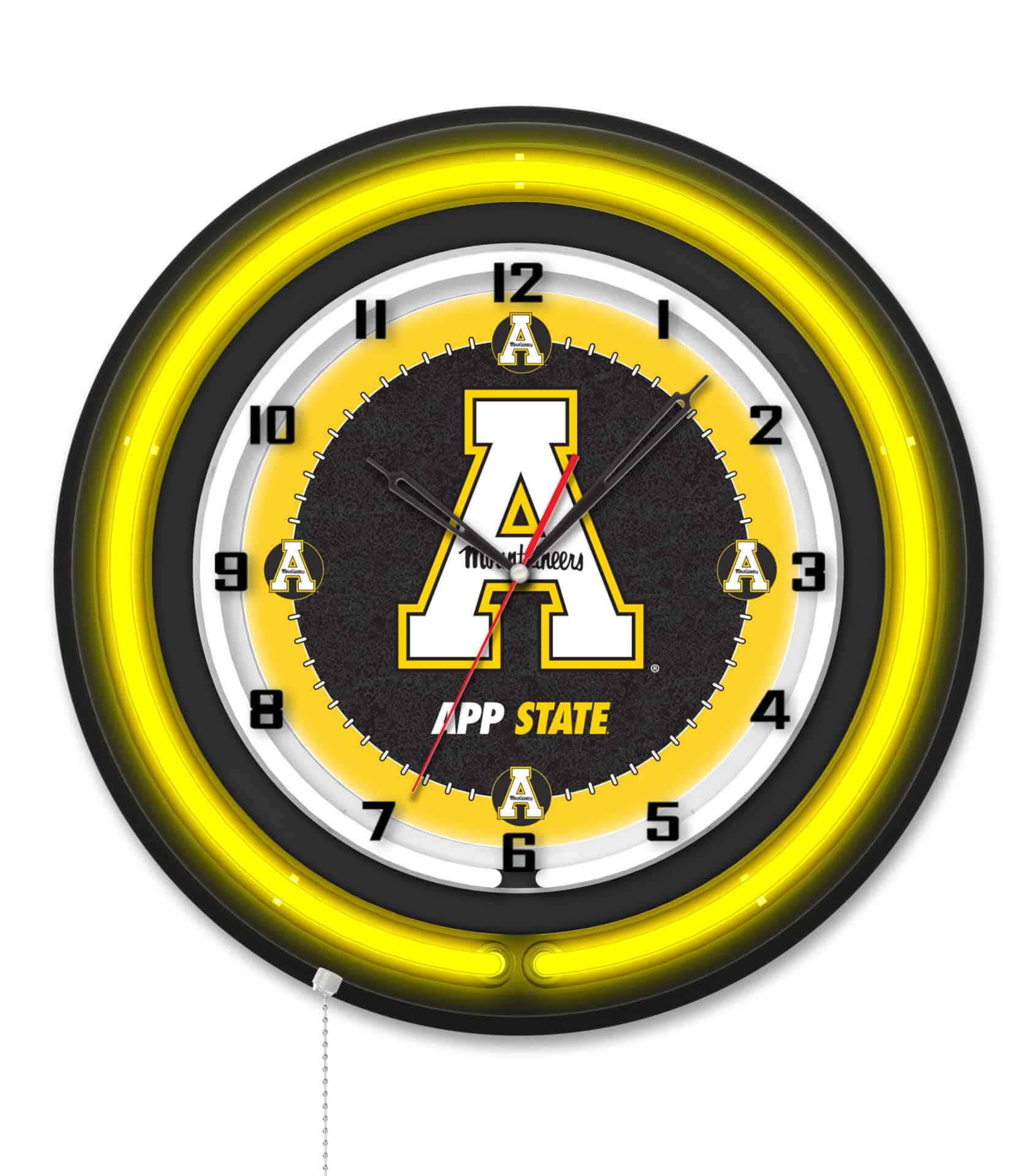 The Appalachian State University 19-Inch Neon Logo Clock in Black is the perfect addition to any man cave, showcasing your school pride with its vibrant design. This clock features a sleek black casing and a neon outer ring in team colors, illuminating the custom printed clock face with a brilliant white inner neon ring. The neon rings are easily operated with a pull chain, allowing for convenient on/off functionality. Powered by a UL Listed transformer, this clock operates off a standard 120V outlet, while accurate quartz movement ensures precise timekeeping with a single AA battery (not included). Whether for a recent graduate, a sports fan, or yourself, this clock combines style and functionality.