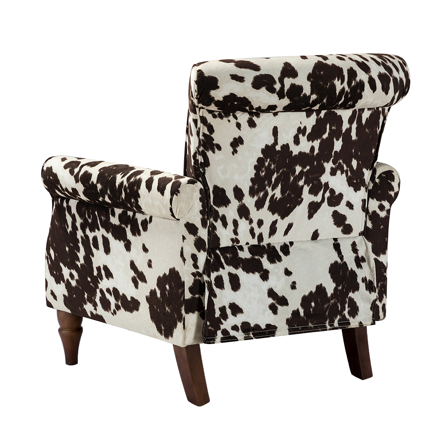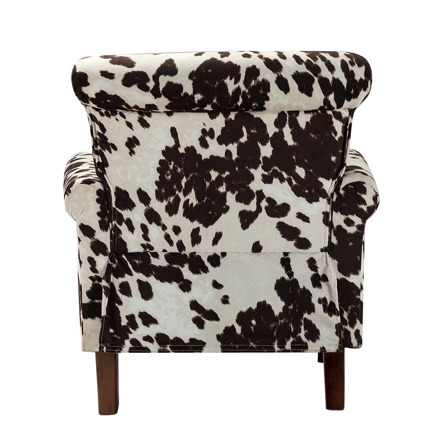 This charming accent armchair is designed to be a focal point in any room. It blends traditional details with contemporary aesthetics, making it a versatile addition to your home. With its classic rolled arms, delicate nailhead trim, and eye-catching cowhide pattern, this chair is sure to impress. The sturdy wood frame and comfortable foam filling ensure both durability and comfort, making it the perfect spot to relax and unwind.