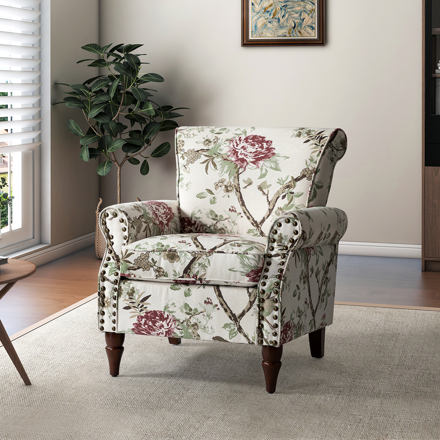 This charming accent armchair is designed to be a shining focal point in any room! Gathering all fashion elements in one piece, it’s sure to wow with integrated traditional details and contemporary aesthetics. Classic rolled arms, a delicate nailhead trim, and a stunning floral pattern work together to make an impressive statement. The beautifully carved solid wood legs support a sturdy wooden frame, ensuring reliable durability and high quality. Plus, with comfortable foam filling, textured polyester upholstery, and built-in pocket springs, seating is a dream! This practical work of art boasts unique glamour, adding character to any home.