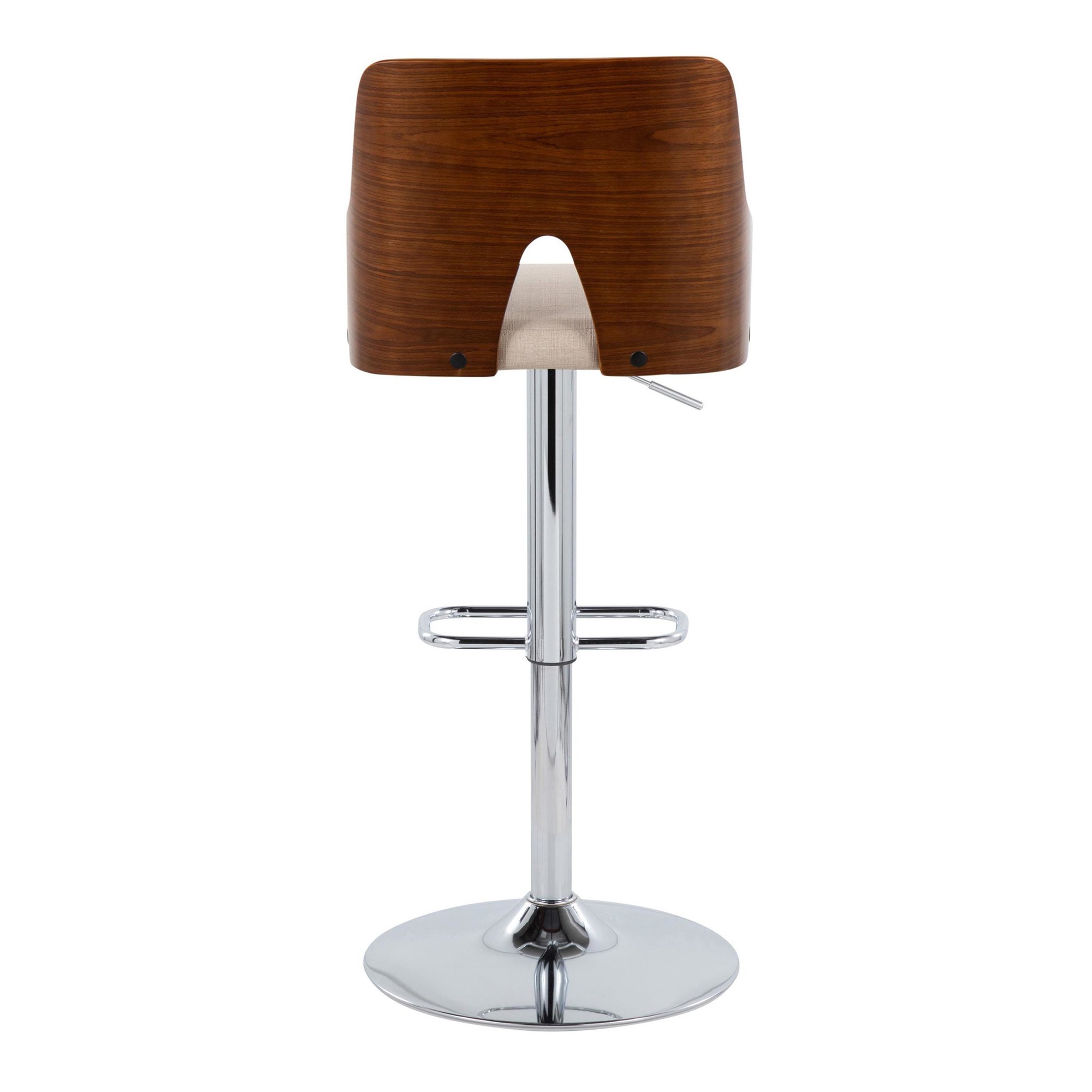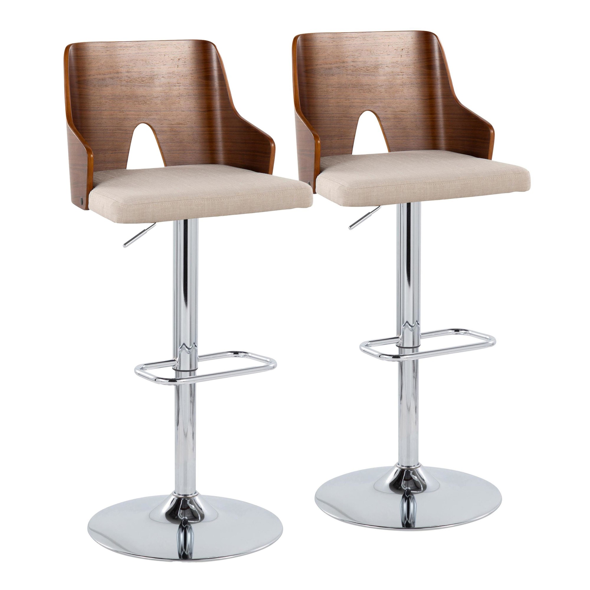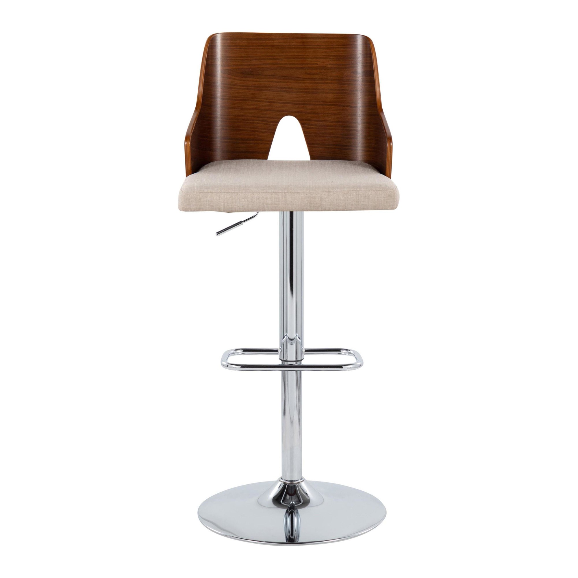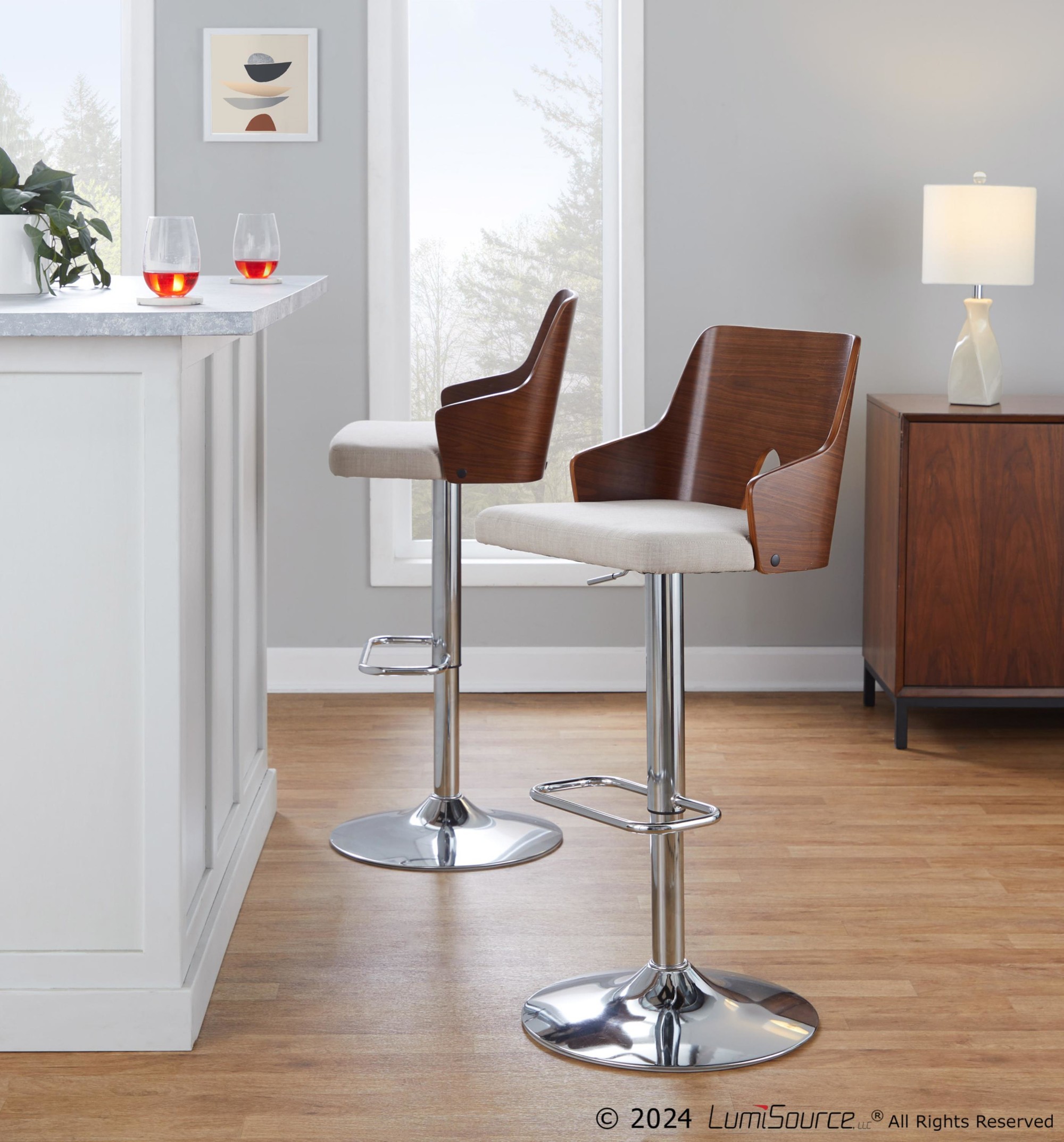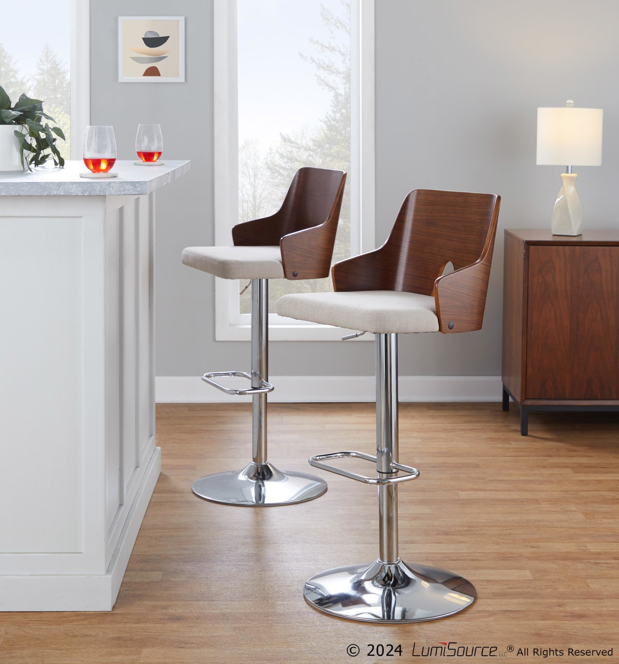 The Ariana Adjustable Barstool features a playful and refined design. With its unique wood backrest and upholstered seat, this mid-century-inspired bar stool adds sophistication to any space. Enjoy adjustable height, a 360-degree swivel, and a sturdy chrome base. Sold in pairs.
