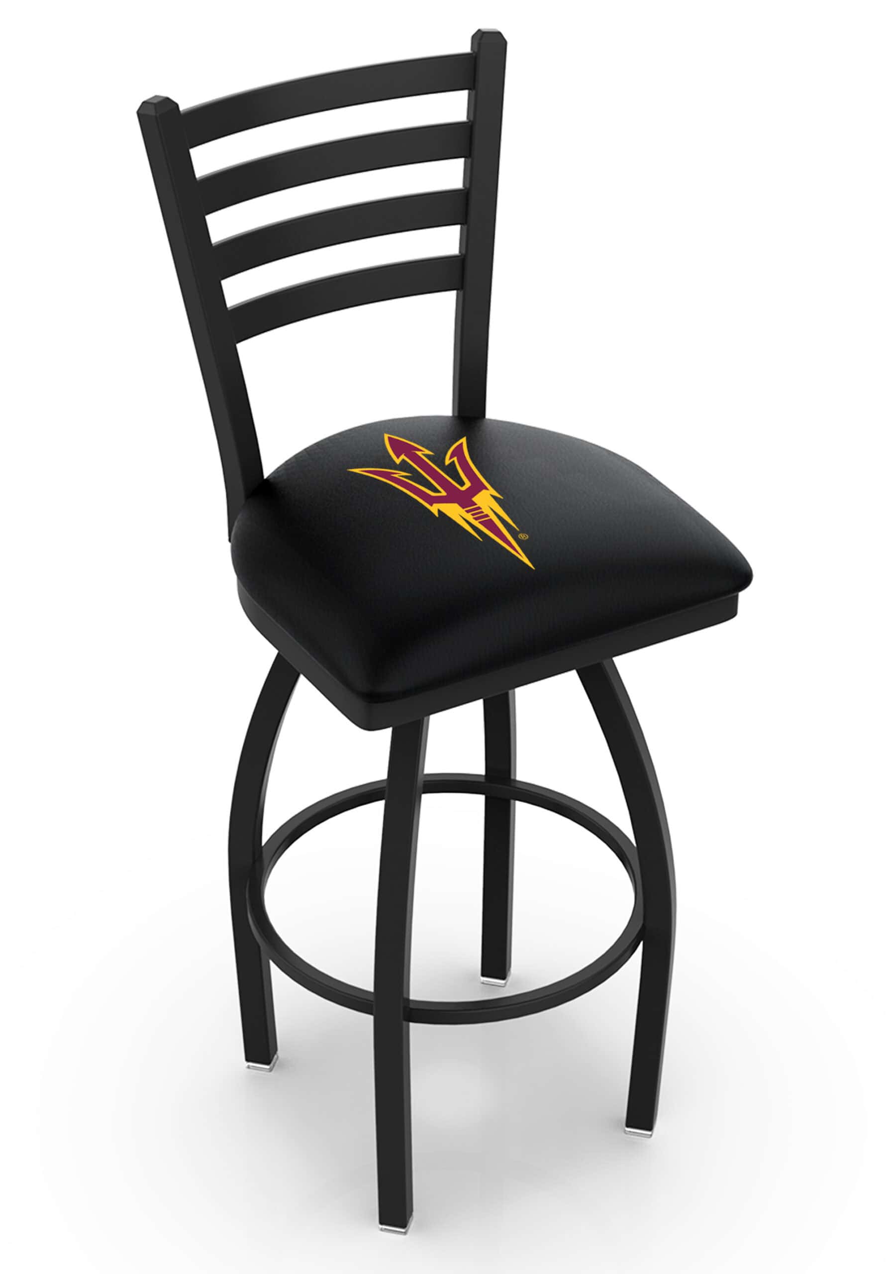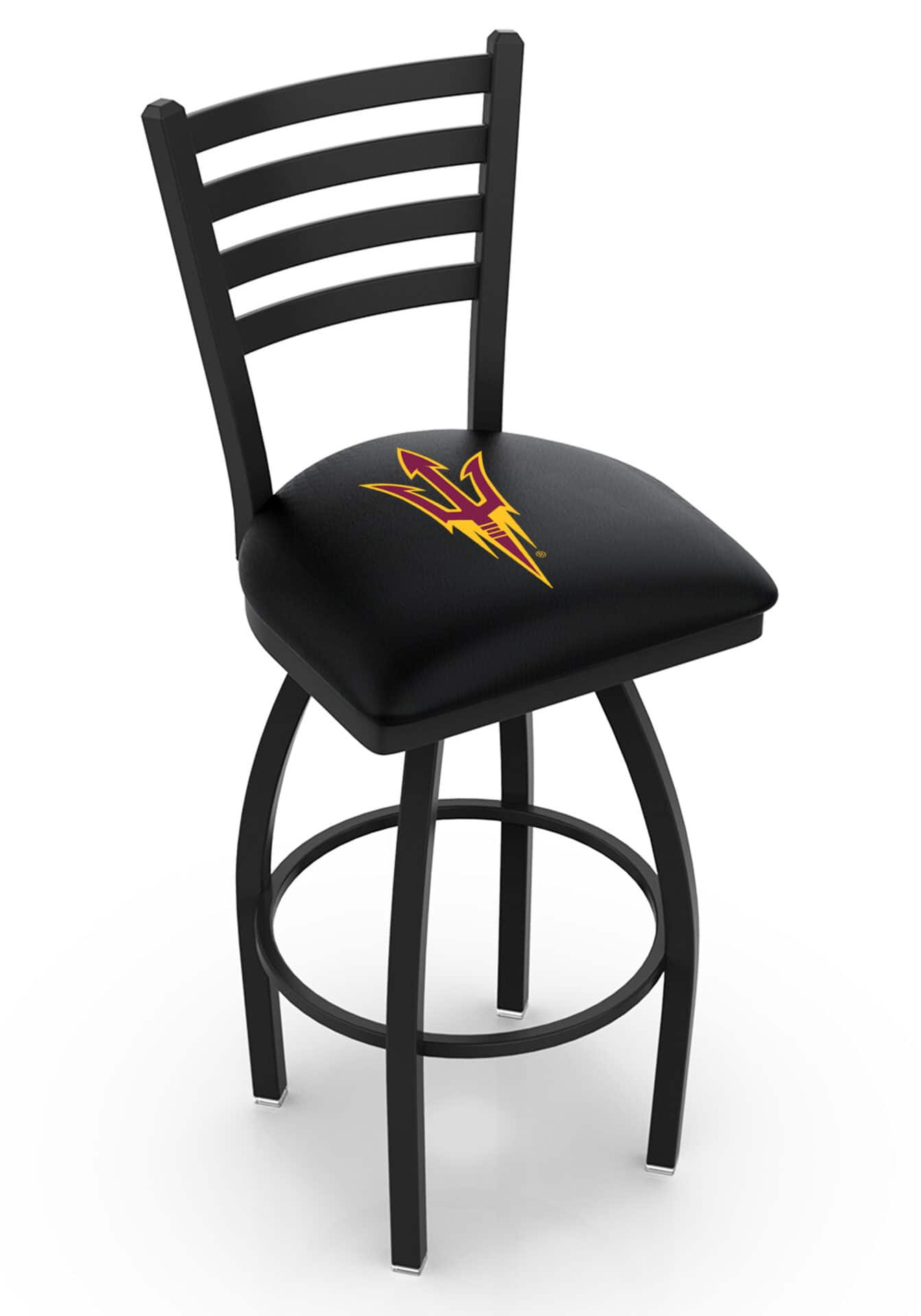 The Arizona State University 25-Inch Swivel Counter Stool with a Black Wrinkle Finish and Ladder Back is the perfect addition to your bar, game room, or man cave. Featuring the officially licensed Pitchfork logo, this stool combines style, durability, and comfort. Its heavy-duty steel frame ensures long-lasting strength, while the 2.5-inch cushion seat provides exceptional comfort. The meticulously crafted logo is applied using a state-of-the-art UV vinyl ink process, guaranteeing a sharp, clear, and durable image that showcases your school pride.