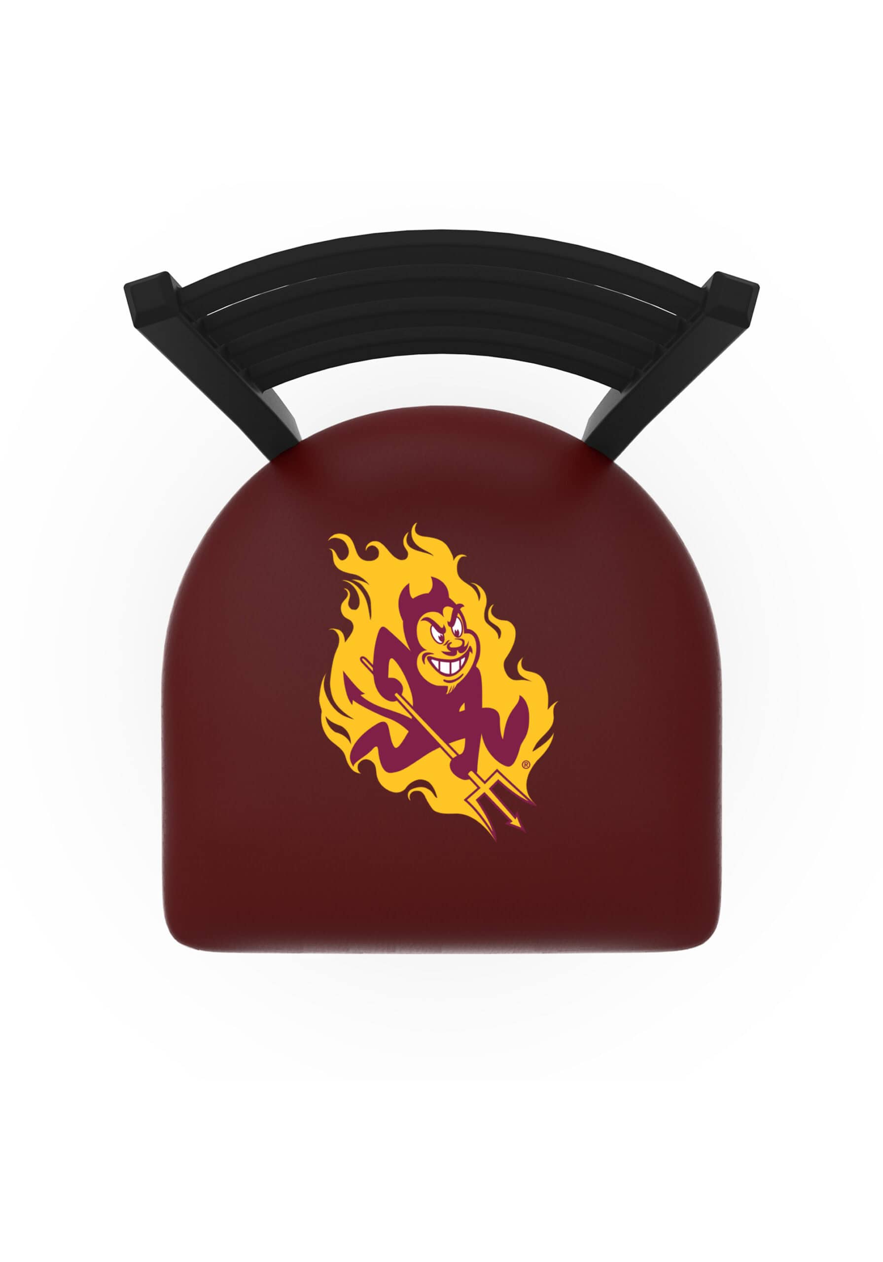 Elevate your bar, game room, or man cave with the Arizona State University 25-Inch Swivel Counter Stool. This officially licensed counter stool features a sophisticated ladder back design that combines comfort with style. Its durable construction and premium materials ensure long-lasting support and aesthetic appeal. The stool boasts a sharp and clear reproduction of the Sparky logo, achieved through a state-of-the-art UV vinyl ink printing process. With a sleek black wrinkle powder-coated steel frame and a plush 2.5-inch cushion seat, this stool is the perfect addition for dedicated Arizona State University fans.