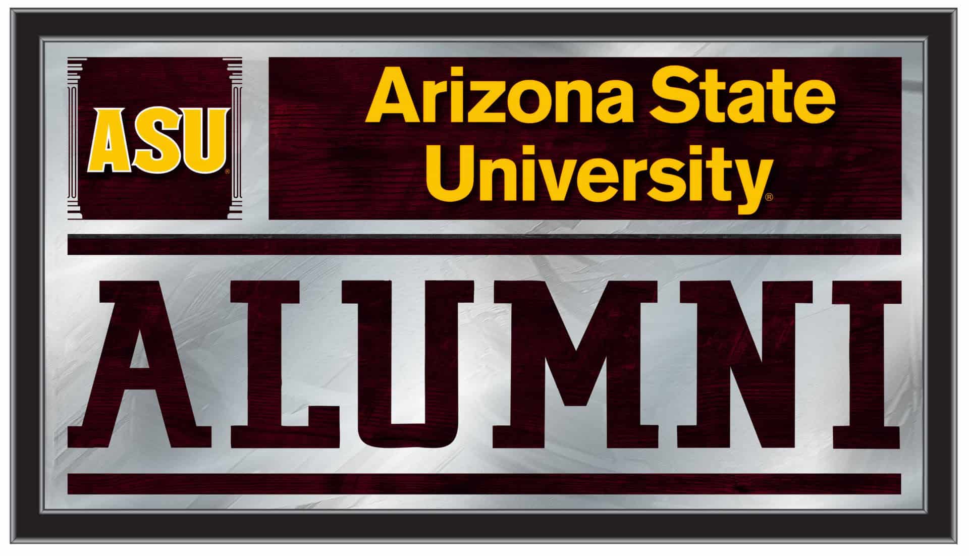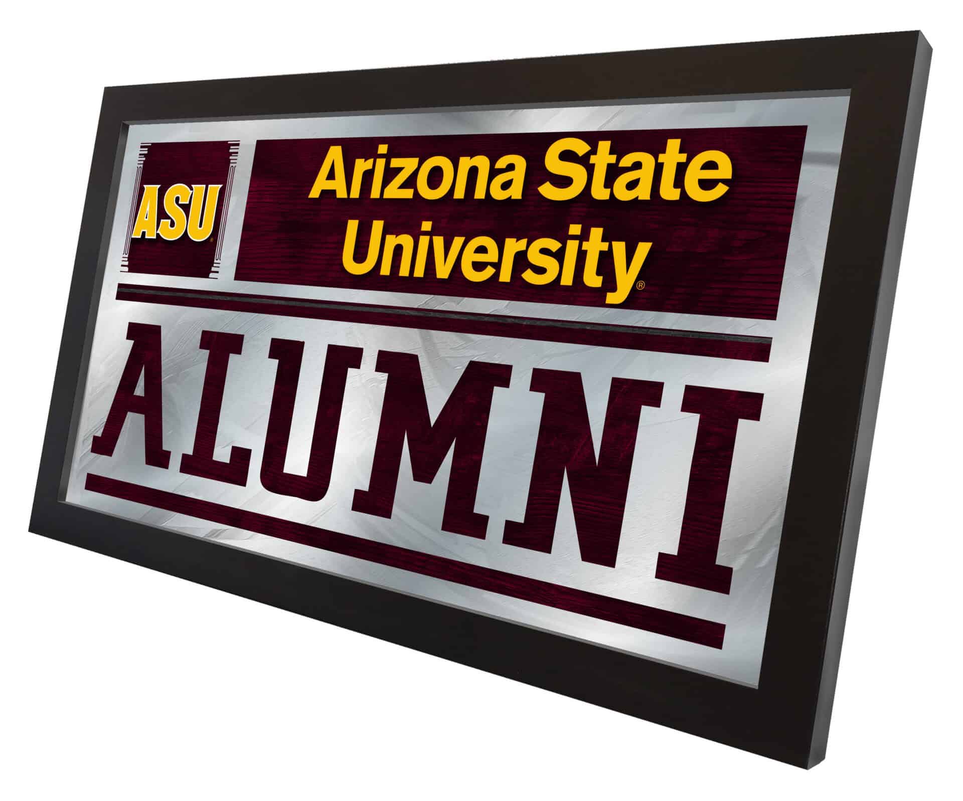 Show your school pride with the Arizona State University 26×15 Alumni Wall Mirror. This mirror features a simple yet elegant design that showcases vibrant school colors through the 1/8″ thick glass, beautifully highlighted by mirrored accents. The mirror is framed with a sleek black, 1 1/4″ wrapped wood frame, complete with saw tooth hangers for easy installation. At 26″ in height and 15″ in width, it is perfect for your office, garage, or any room in your home. Whether as a gift for a recent graduate or for personal use, this mirror is a wonderful addition to any space.