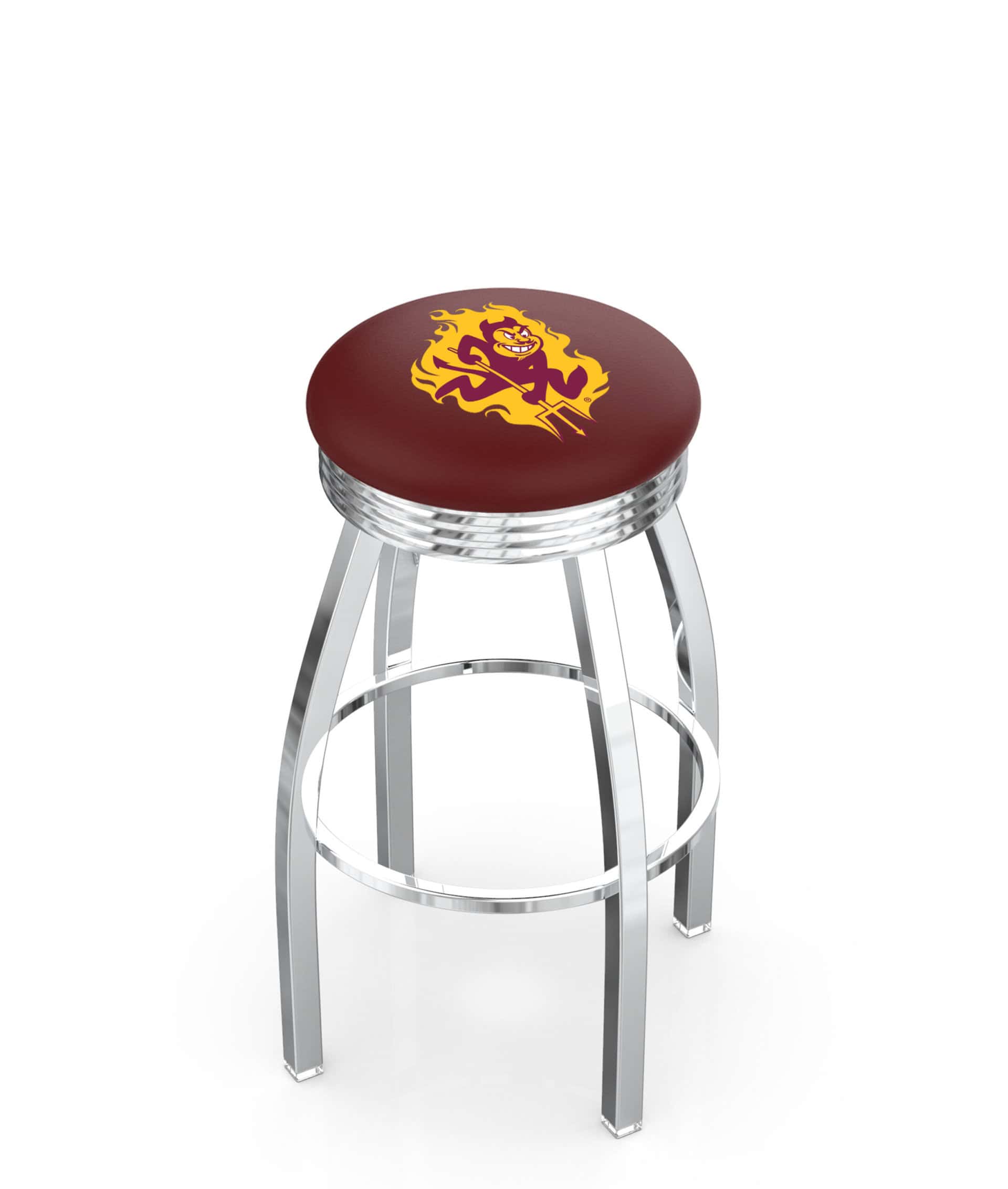 Show off your school pride with this stylish and durable 30-inch swivel backless bar stool. Designed for comfort and longevity, this stool features a robust chrome finish, a single-ring base, and a thick cushion seat with a vibrant Sparky logo. Its modern design and high-quality materials make it a perfect addition to your bar, game room, or man cave.