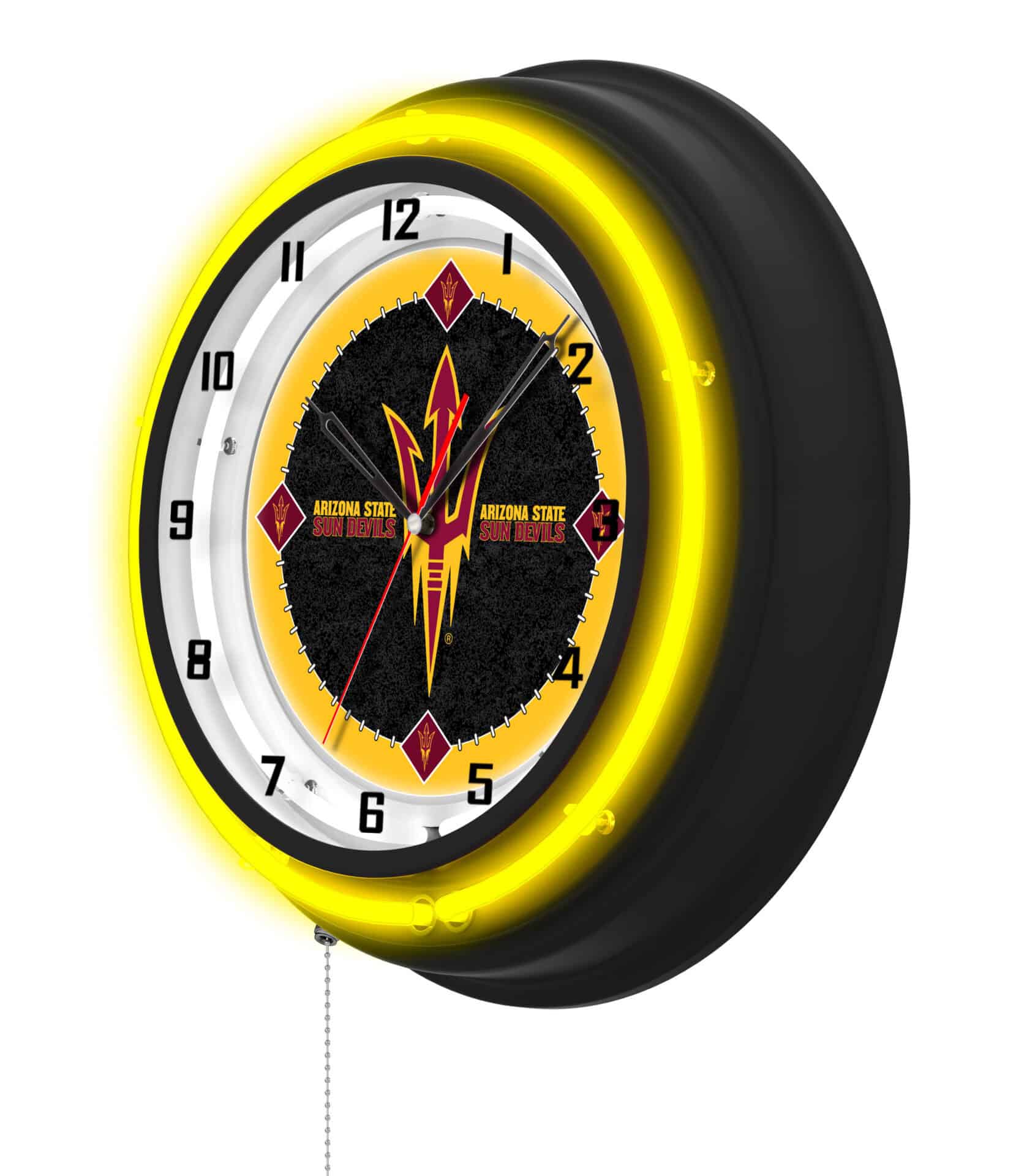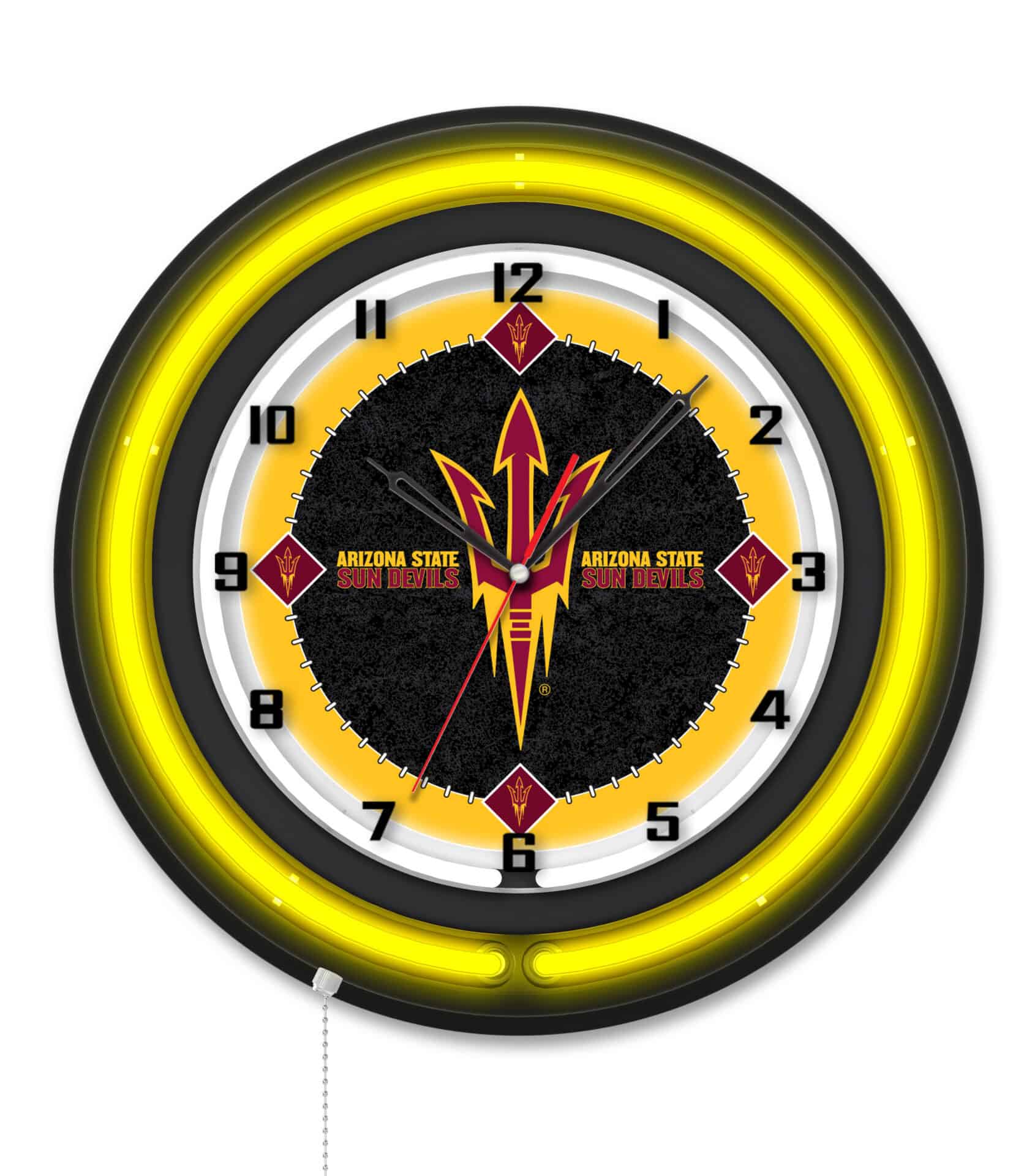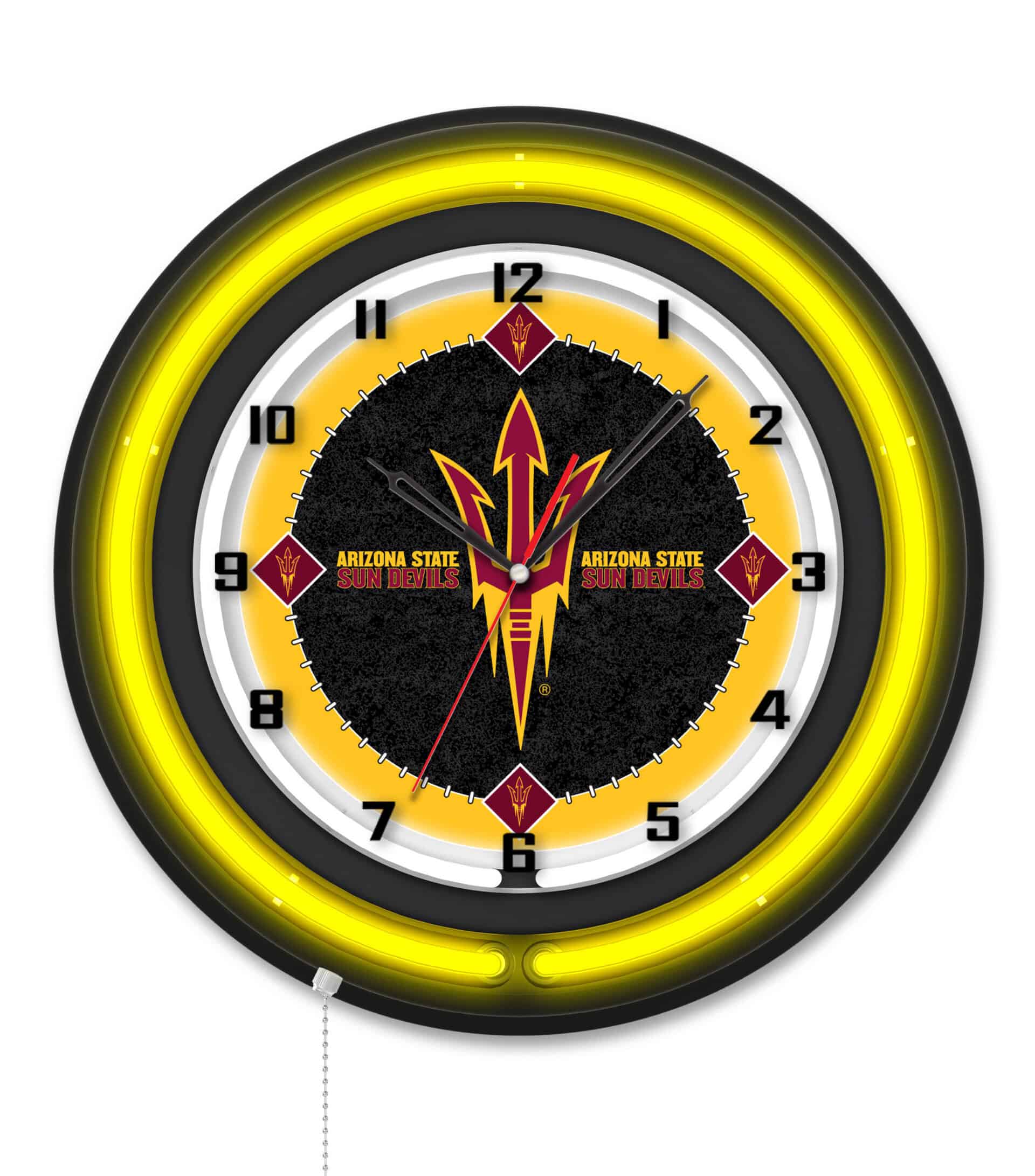 The “Arizona State University (Pitchfork) 19-Inch Neon Logo Clock in Black” is an eye-catching piece that showcases school pride while adding a vibrant touch to any space. Featuring a sleek black casing, this clock is illuminated by a brilliant white inner neon ring and a team color-specific outer ring, enhancing the custom printed clock face. The neon rings can be easily turned on and off with a convenient pull chain located at the bottom of the clock. Powered by a UL Listed transformer that connects to a standard 120V outlet, this clock combines style with functionality. Its accurate quartz movement ensures precise timekeeping and operates on a single AA battery (not included). It’s the perfect gift for sports fans, recent graduates, or anyone looking to add a unique decor piece to their collection.