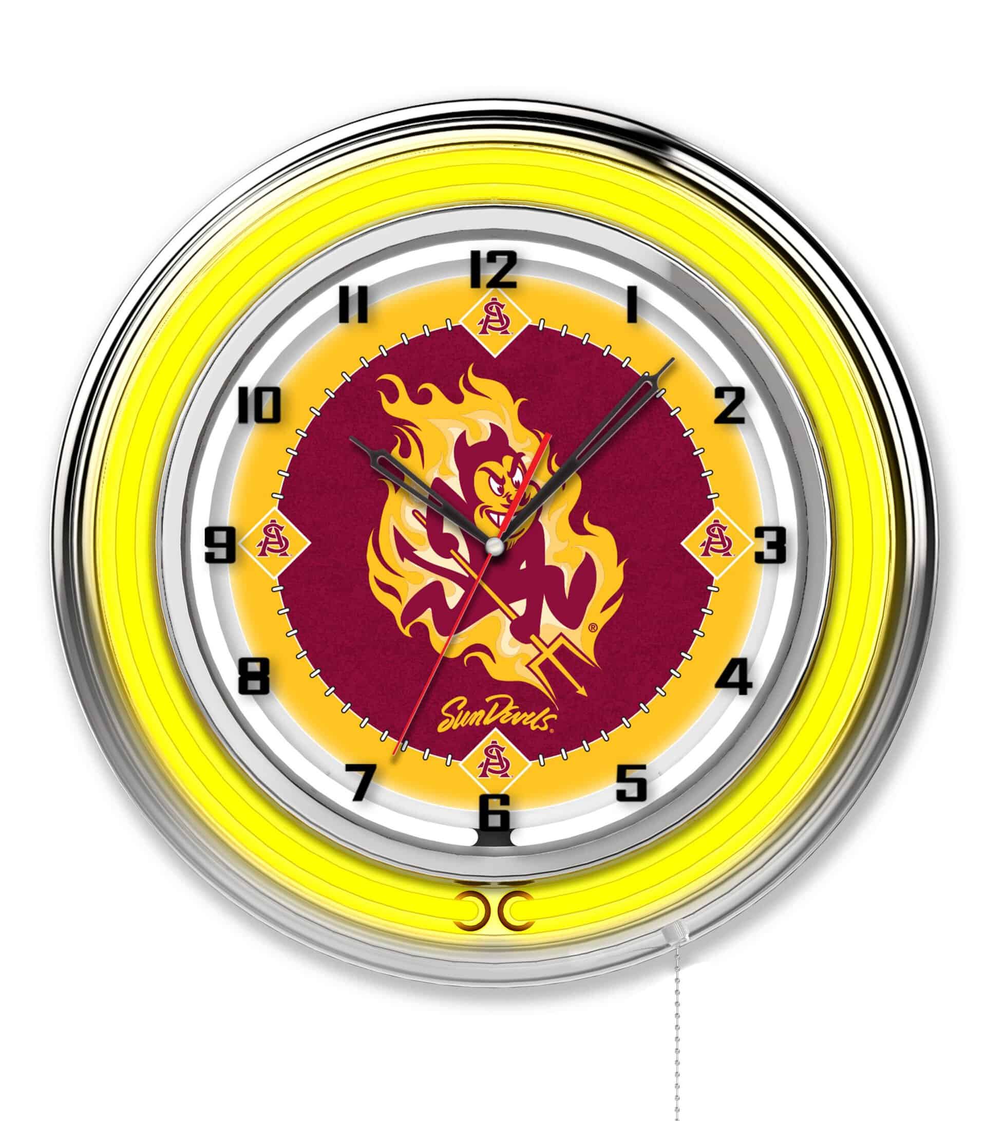 The Arizona State University (Sparky) 19-Inch Neon Logo Clock in Chrome is a vibrant and stylish way to showcase your school pride. Featuring a stunning chrome casing, this clock is designed with a team color-specific neon outer ring that beautifully enhances the custom printed clock face, illuminated by a brilliant white inner neon ring. The neon rings can be effortlessly turned on and off with a pull chain located at the bottom of the clock. Powered by a UL listed transformer, it operates on a standard 120V outlet, while the accurate quartz movement ensures precise timekeeping with a single AA battery (not included). This eye-catching clock is perfect for any sports superfan, recent graduate, or as a unique addition to your own space.