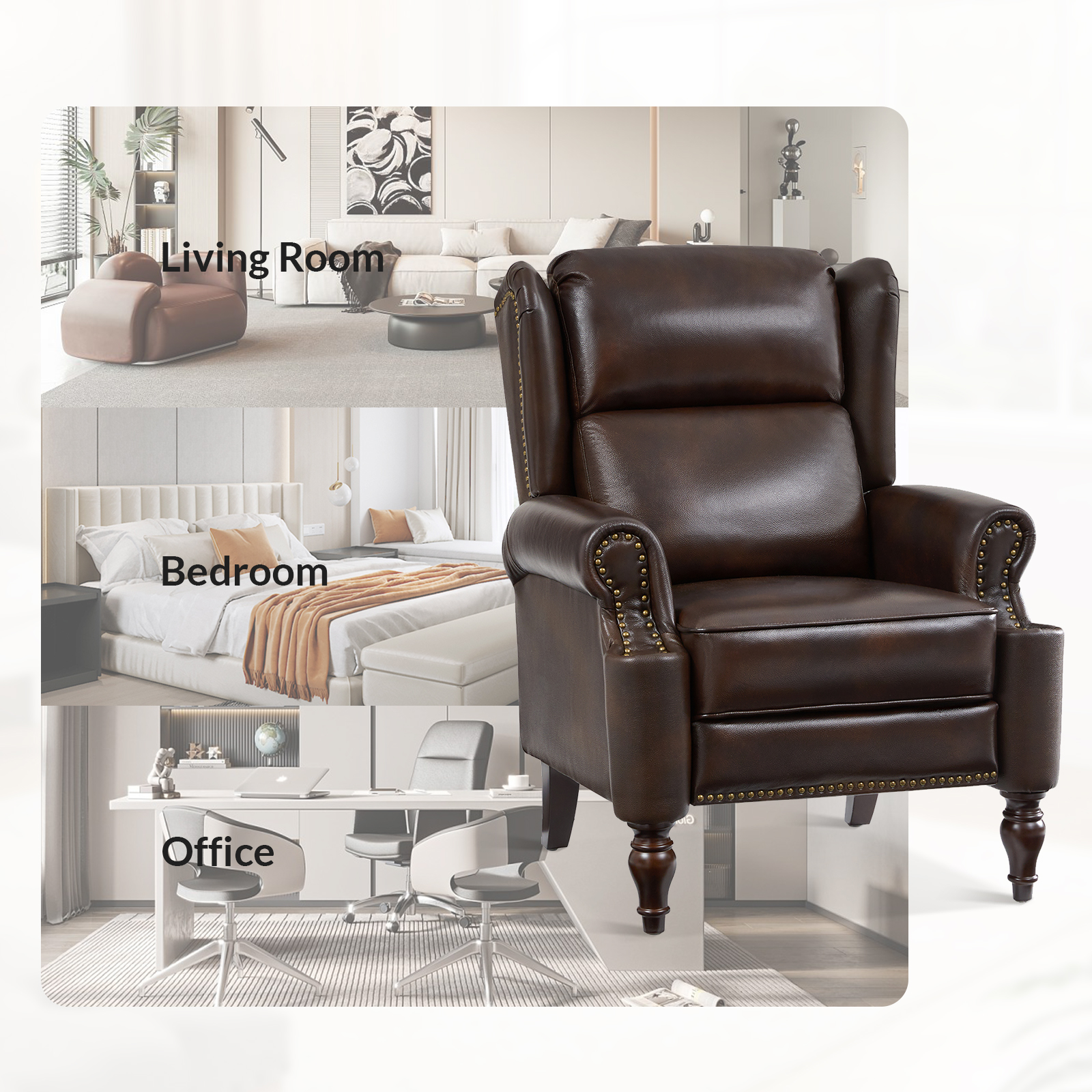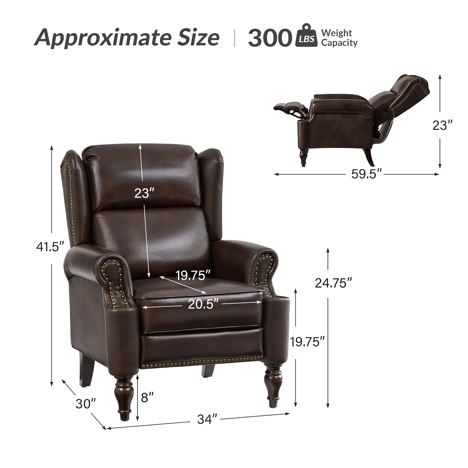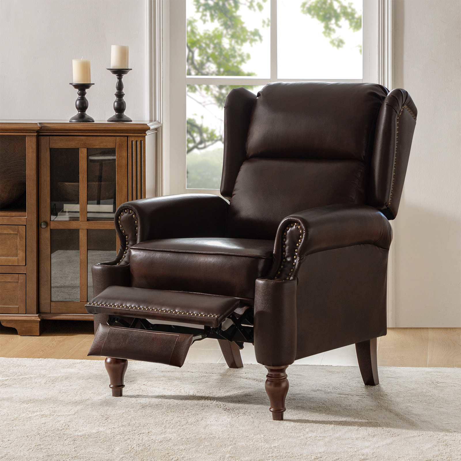 Sink into classic comfort with the Arnold Espresso Leather Wingback Manual Recliner! This recliner blends traditional style with modern functionality, making it the perfect addition to any living space. Enjoy the luxurious feel of genuine leather, the support of a wingback design, and the added elegance of nailhead trim.