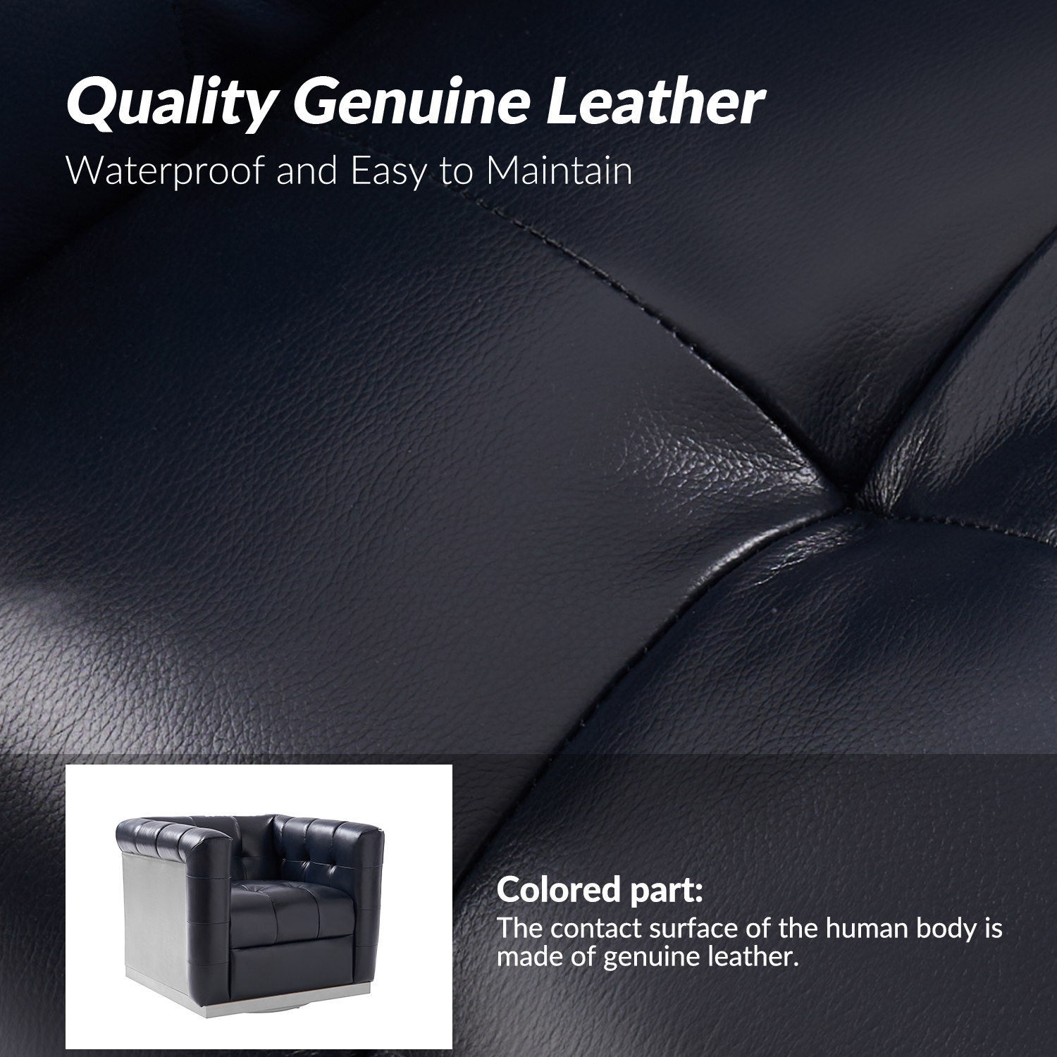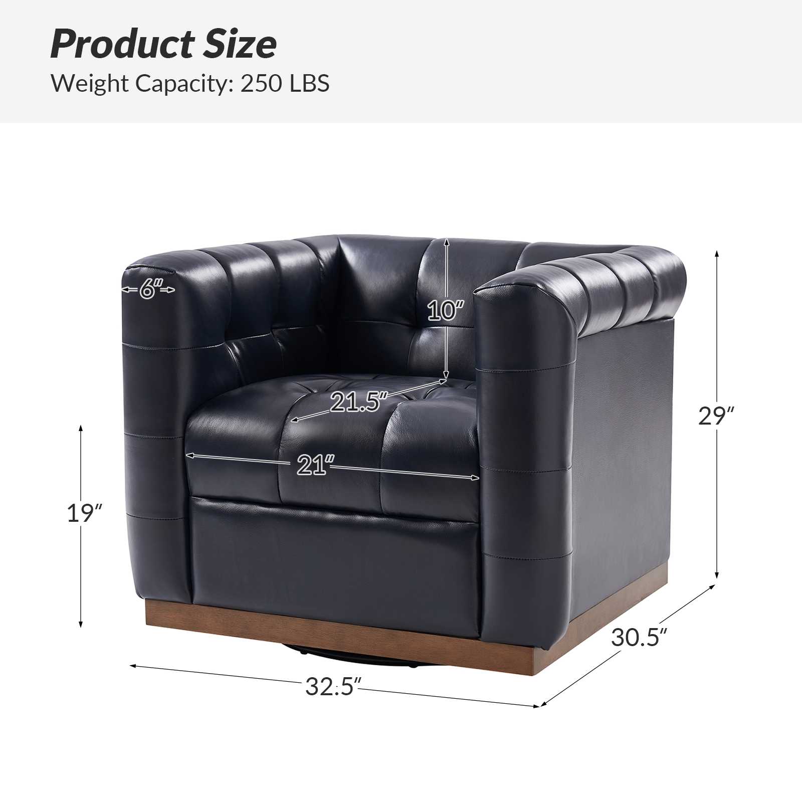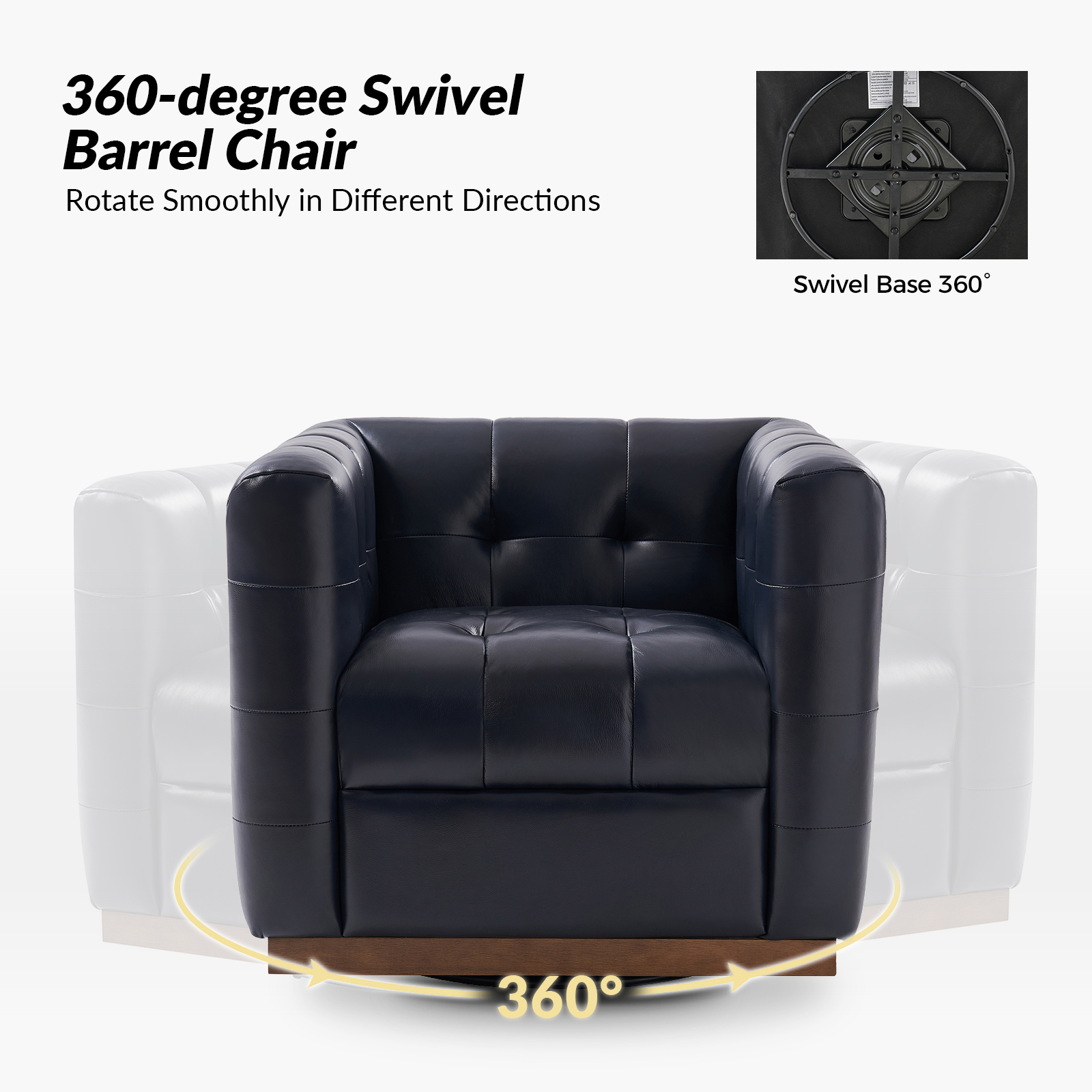 This mid-century modern square swivel barrel chair is an exquisite blend of sophistication and comfort. Upholstered in high-quality genuine leather, it offers a luxurious feel and exceptional durability. The point-tufted design adds a touch of elegance, providing both visual appeal and enhanced support. With a sturdy wooden apron, this chair seamlessly combines contemporary style with enduring quality. Enjoy the versatility of its effortless swivel, designed for practicality and ease of movement.