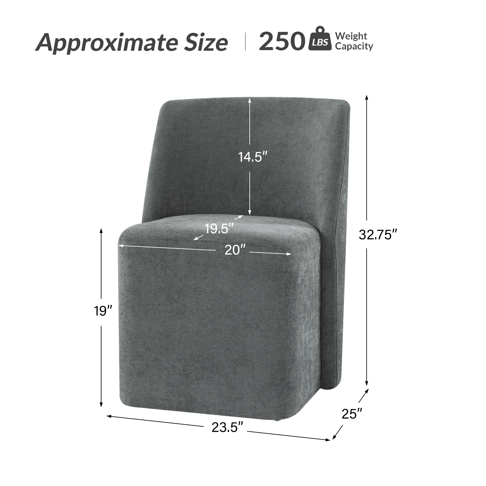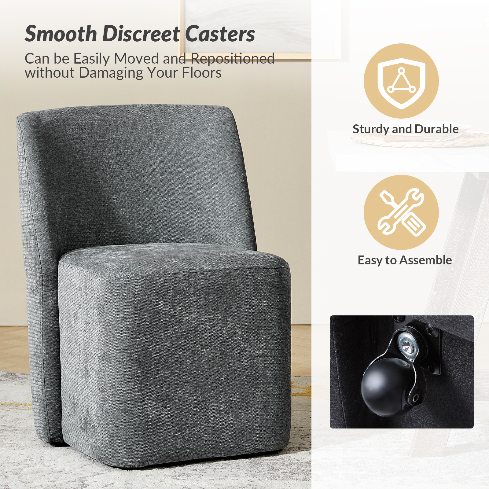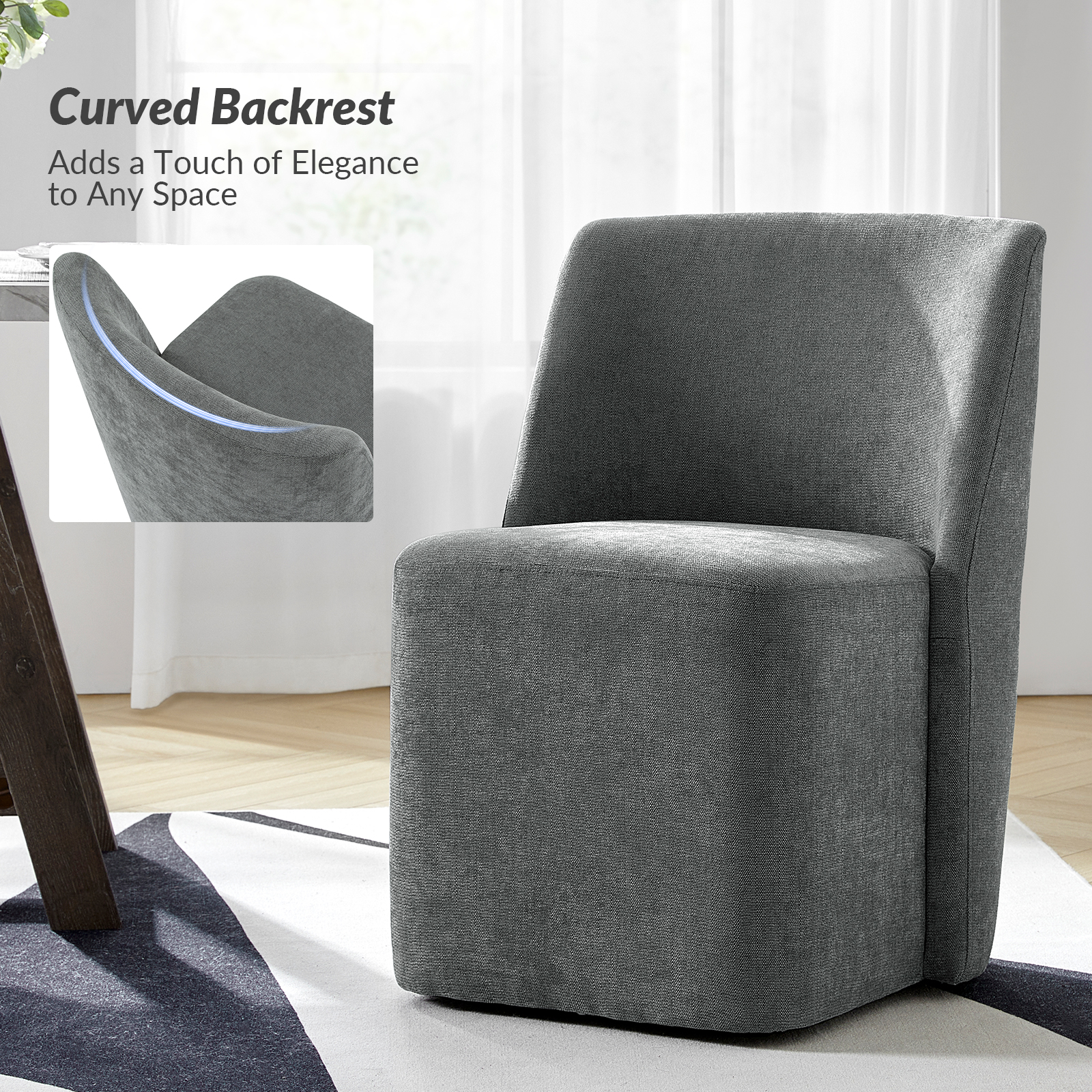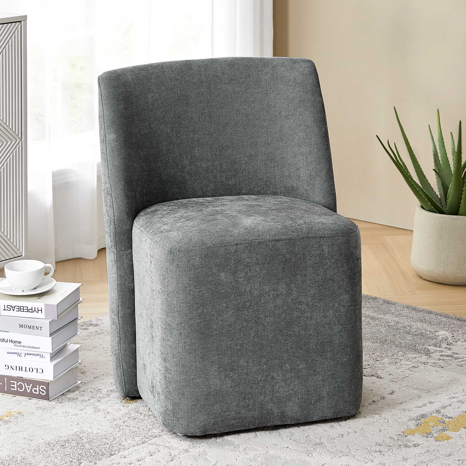 The Astrid Grey Modern Chenille Dining Chair seamlessly combines style and functionality, making it a great addition to your dining or living space. Its sleek, minimalist design features a gracefully curved backrest for exceptional lumbar support. Lightweight and equipped with universal wheels, this chair offers easy mobility and adaptability, allowing you to effortlessly rearrange your seating. It’s not just a dining chair; it can also serve as a stylish dressing stool!