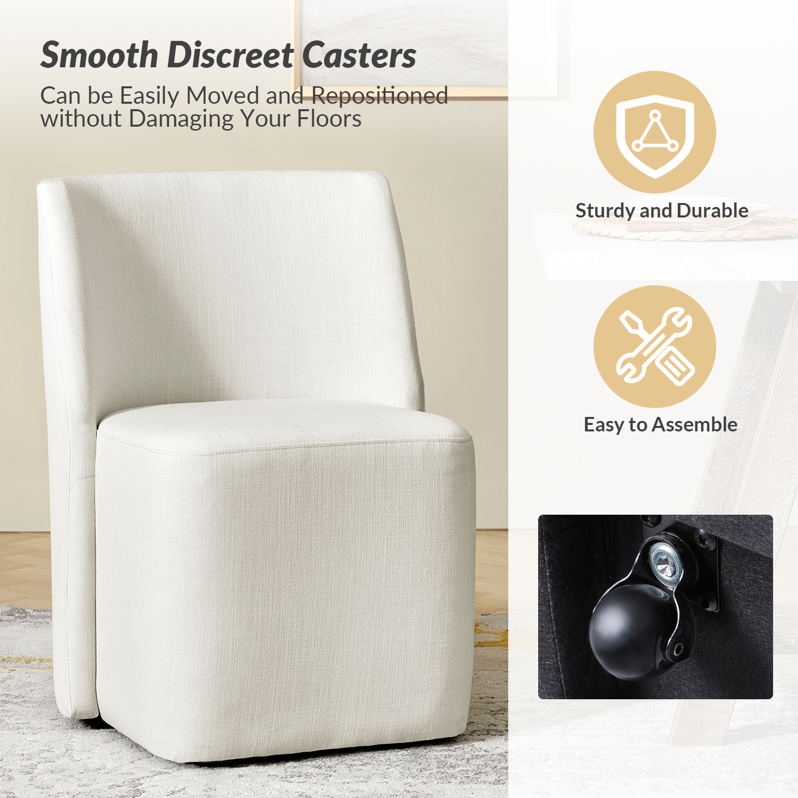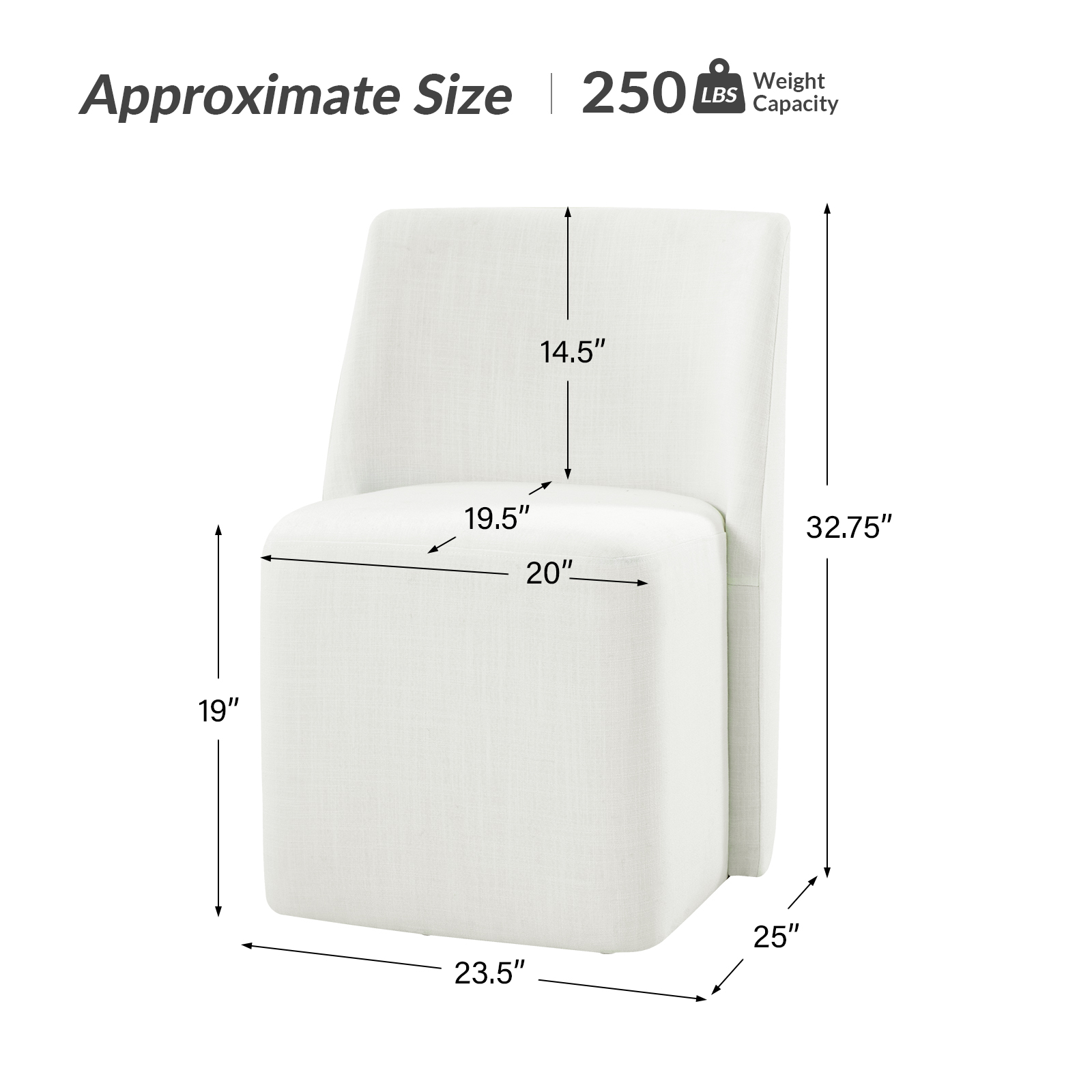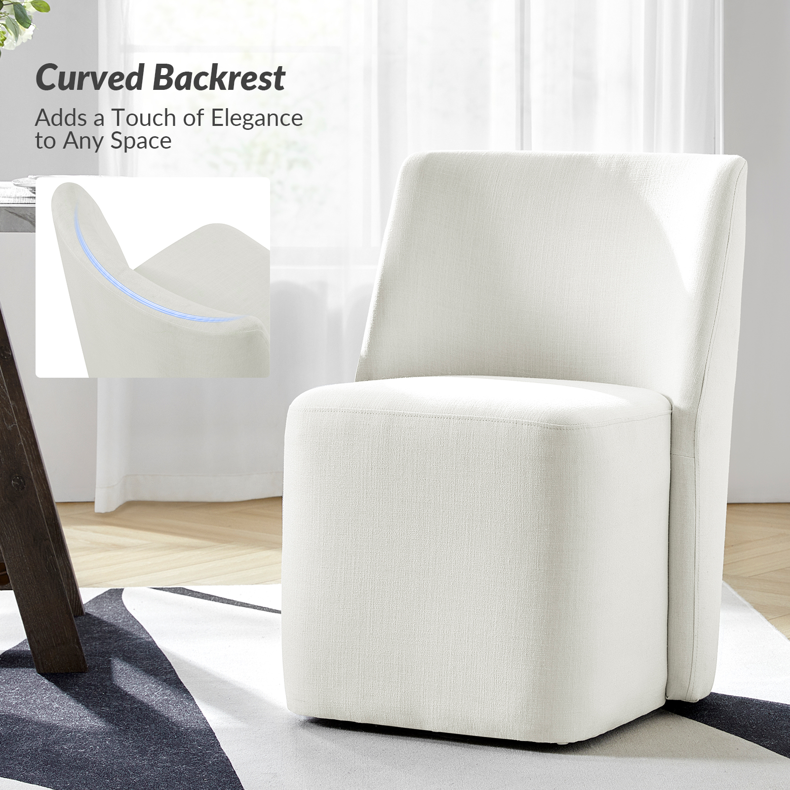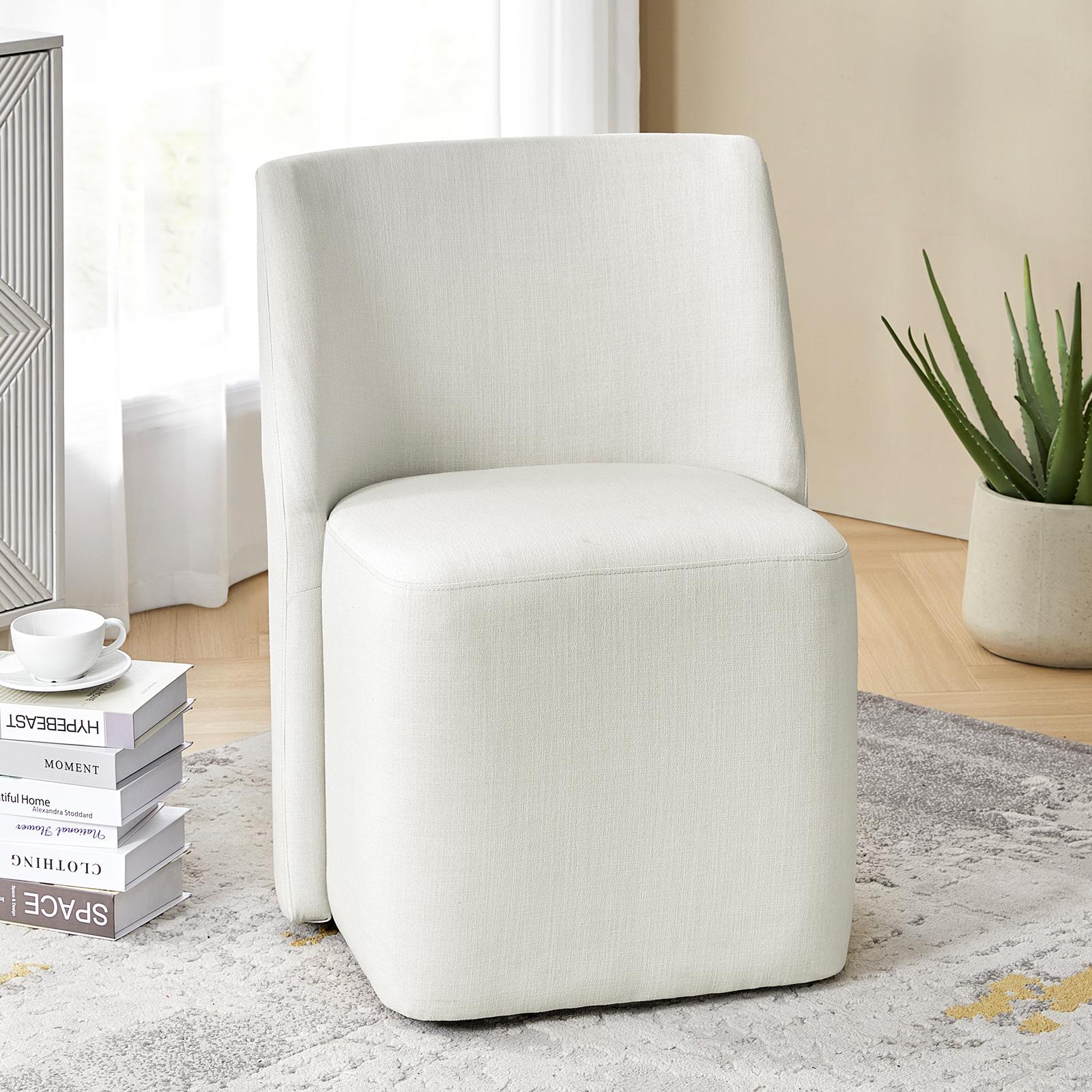 The Astrid White Modern Rolling Linen Dining Chair seamlessly blends style and functionality, making it a versatile addition to your dining or living room. Its sleek, minimalist design is complemented by a gracefully curved backrest, providing durable support and ensuring comfort for extended periods of sitting. Enjoy the flexibility of this lightweight chair, easily moved thanks to its universal wheels, adapting effortlessly to various spaces within your home. It’s not just a dining chair; use it as a stylish dressing stool, too. Crafted with quality materials, it adds a touch of sophistication to any contemporary interior.
