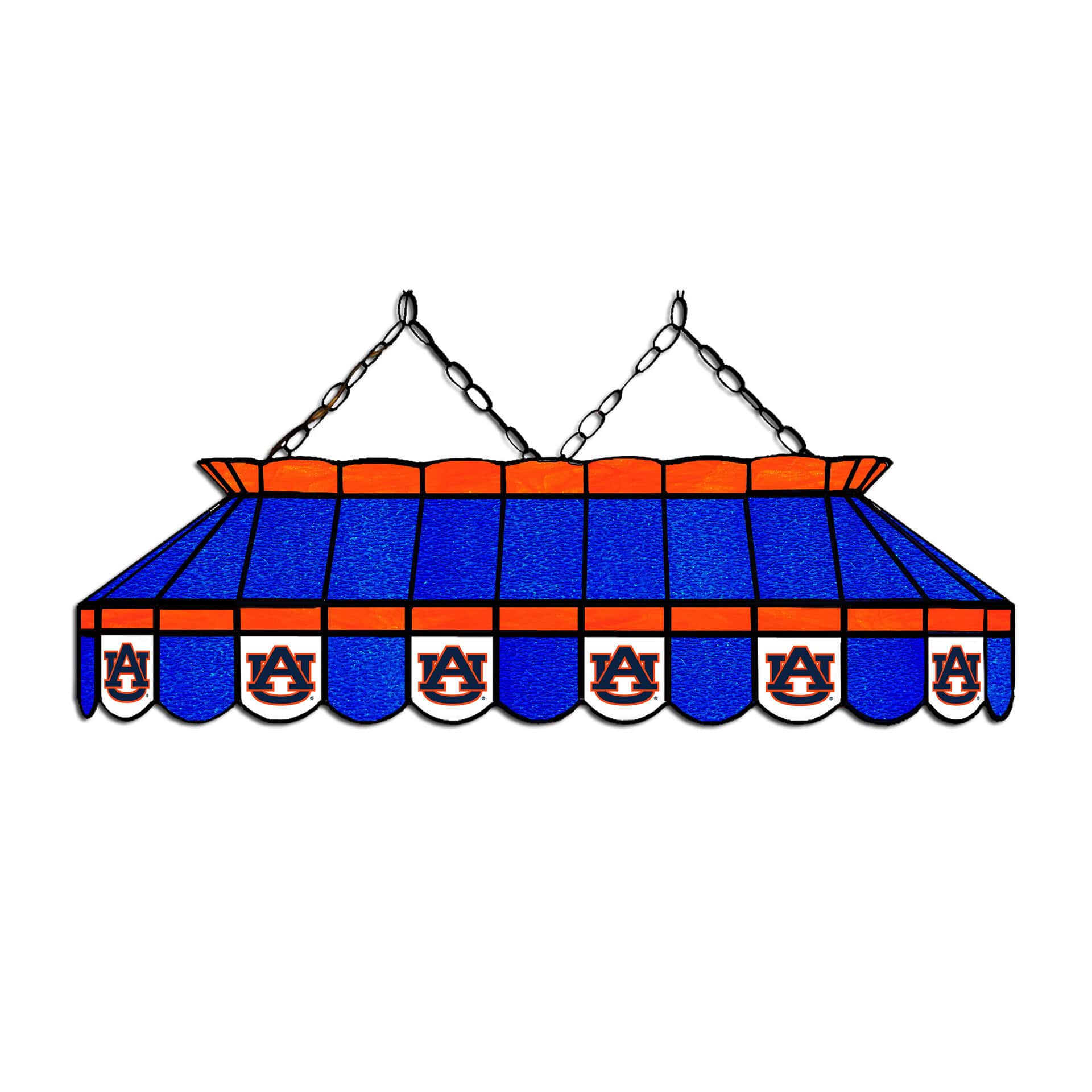 Show off your team pride with the Auburn University 40 inch Stained Glass Billiard Lamp! This officially licensed lamp is the perfect addition to any game room. The hand-cut stained glass features team colors and logos, adding a touch of class and team spirit to your pool table area. There are two licensed logos on each shade, totaling six. The 40-inch width provides excellent lighting across your pool table. Installation is easy, as a hanging chain and ceiling mounting plate are included. This billiard lamp is made in the USA, ensuring quality and durability. Dimensions (LxWxH): 40 x 16 x 16. Product Weight (lbs): 40. Material: Hand cut glass, metal.