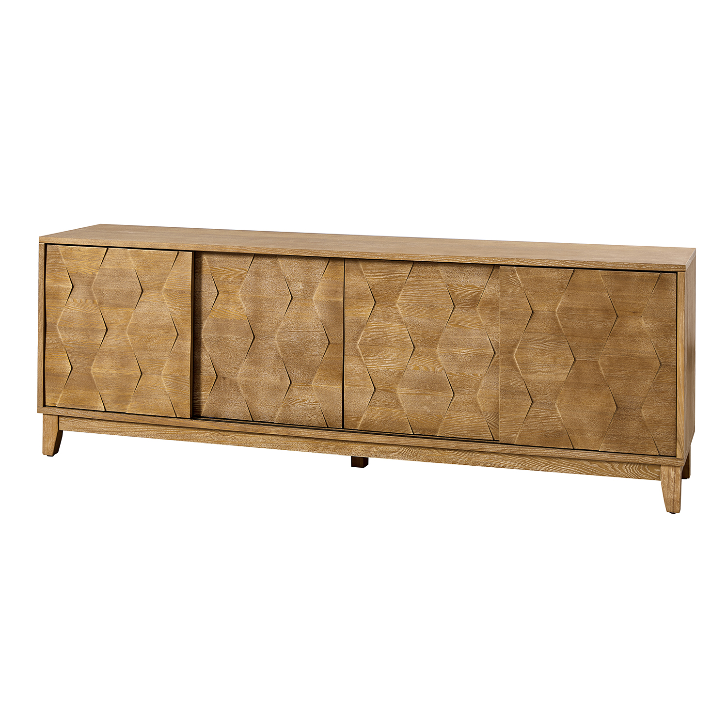 Get ready to amplify your living room with this contemporary TV stand, designed for screens up to 78 inches! It’s the ultimate blend of modern style and everyday practicality. The visually striking hexagonal cabinet doors create a three-dimensional appeal that’s sure to turn heads. Plus, the sliding doors offer seamless convenience and a sleek look.