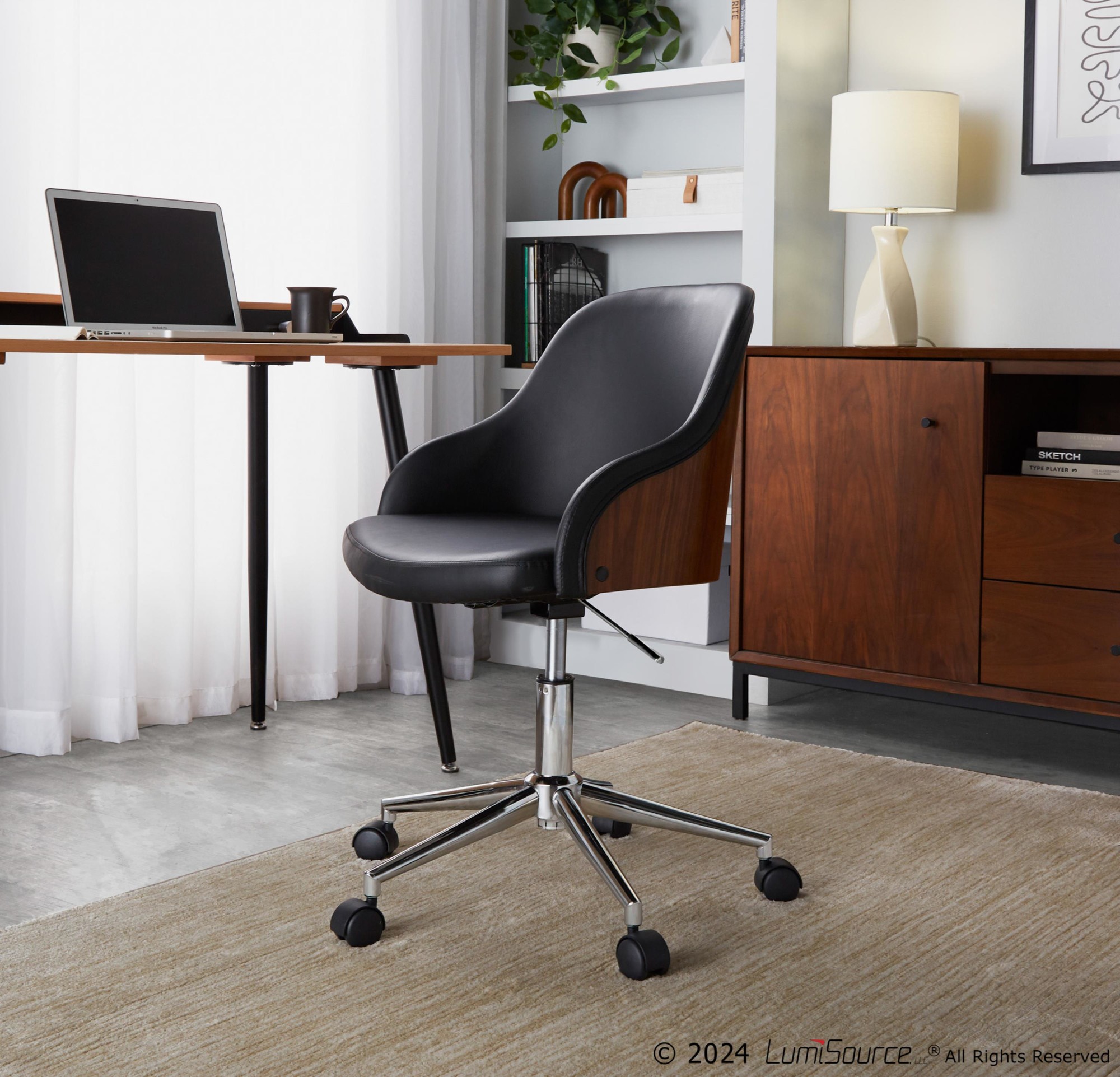 The Bacci Office Chair seamlessly blends heritage design with modern versatility, making it a stylish and functional addition to your home office. Its adjustable five-star base and barrel-style curved wood back offer both comfort and sophistication. Transitioning effortlessly into subtle armrests, this chair adds functional style to any workspace.