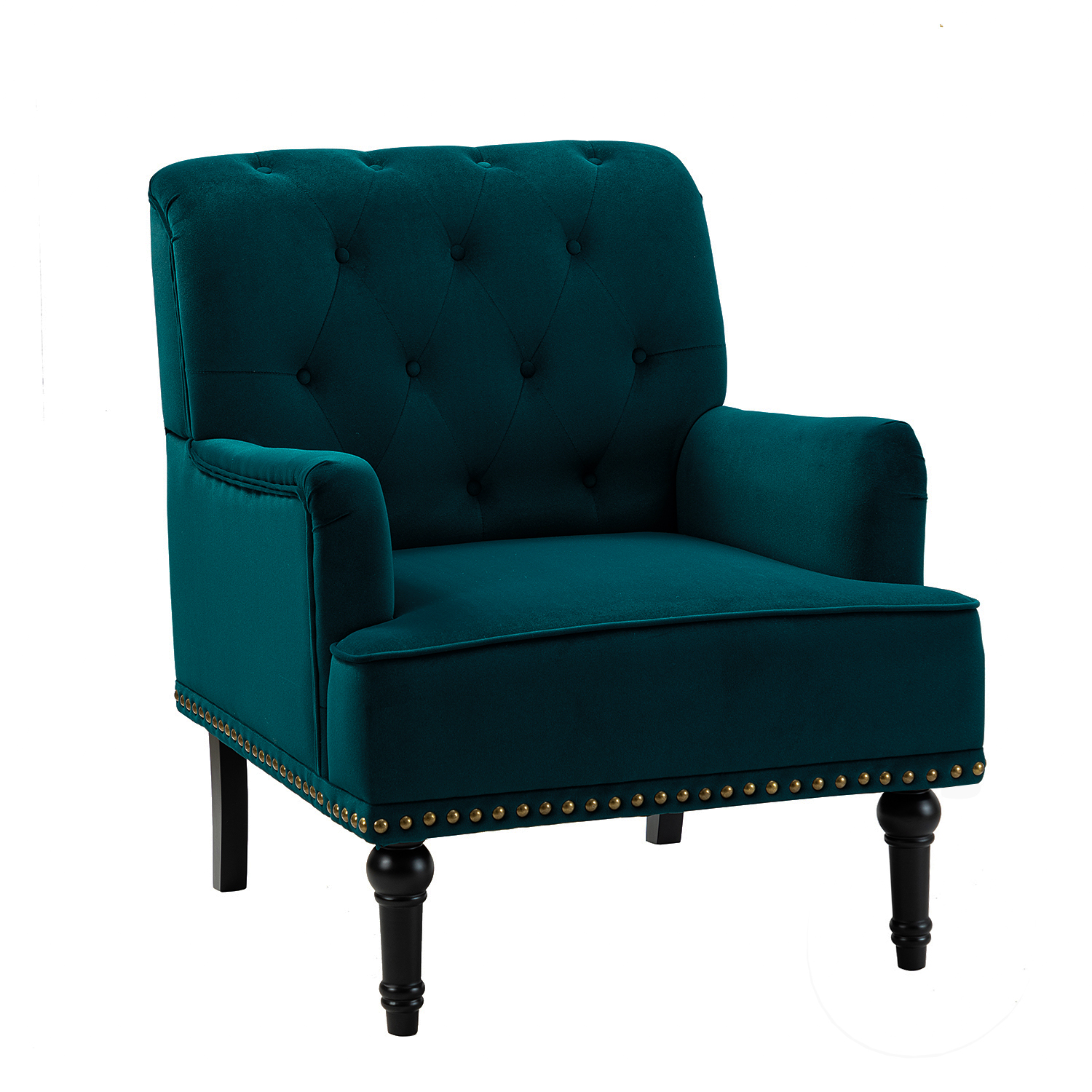 Add a touch of elegance to your space with this stylish accent chair. Its classic design features eye-catching nailhead trim and a button-tufted backrest. The teal velvet fabric is soft and comfortable, making it perfect for relaxing with a book or watching your favorite shows. This chair has a sturdy frame made of solid and manufactured wood, and the S-spring seat provides great support. It’s a versatile piece that works well in living rooms or home offices. The dimensions are 28.5″ (W) x 32″ (D) x 34″ (H) and the weight is 39.68 lbs. Some assembly is required.