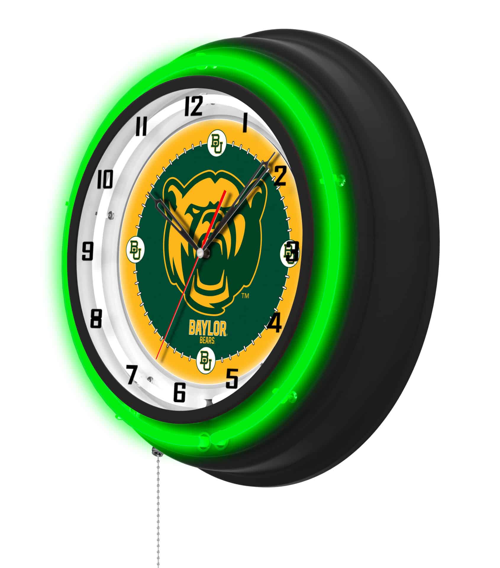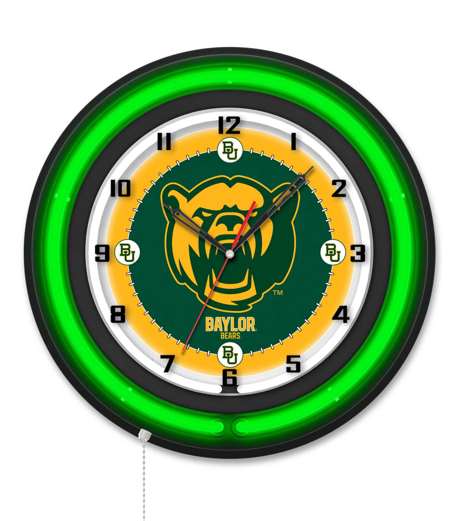 The Baylor University 19-Inch Neon Logo Clock in Black is the ultimate addition to your man cave, showcasing your school pride in a vibrant and stylish way. This clock features a striking black casing with a neon outer ring that highlights the custom printed clock face, illuminated by a brilliant white inner neon ring. With its easy-to-use pull chain for power, this clock is not only functional but also a fantastic decorative piece. The accurate quartz movement ensures precise timekeeping, making it a perfect gift for graduates, sports fans, or even for personal use.