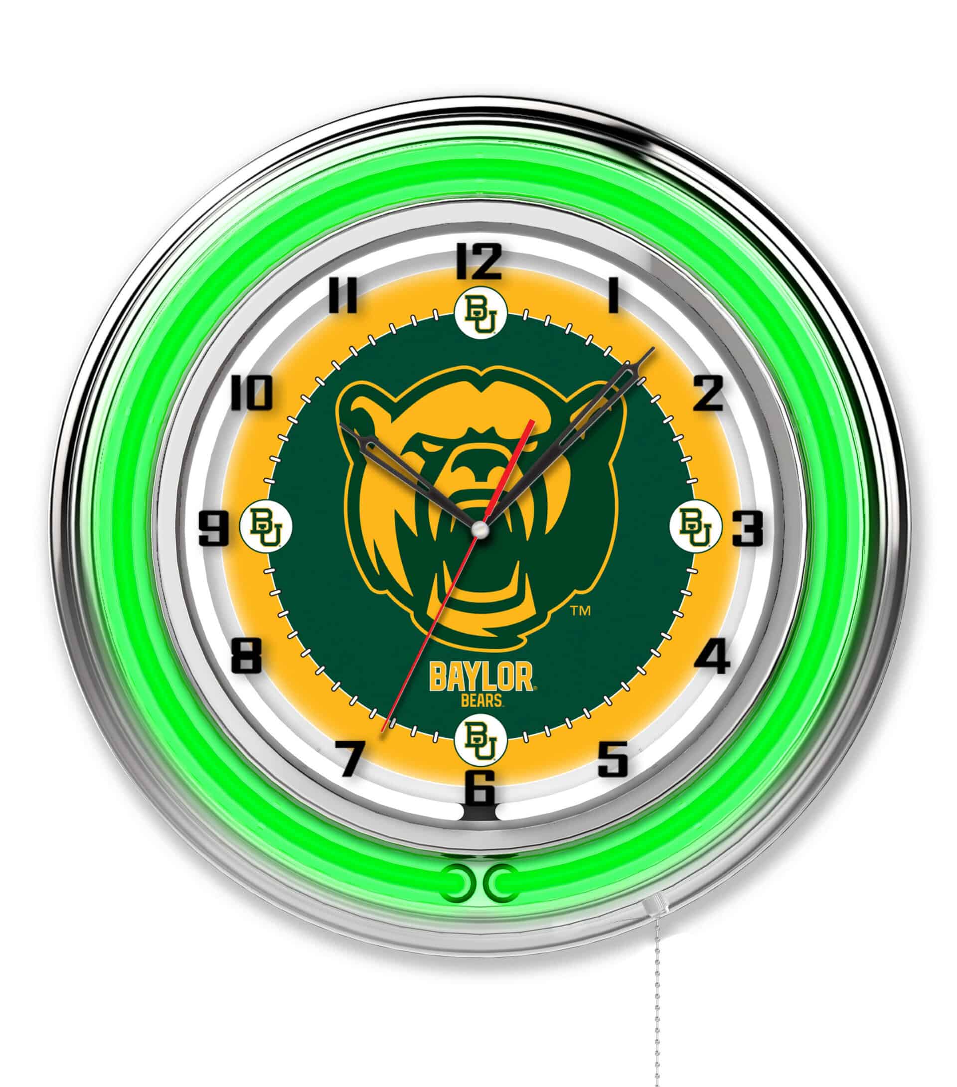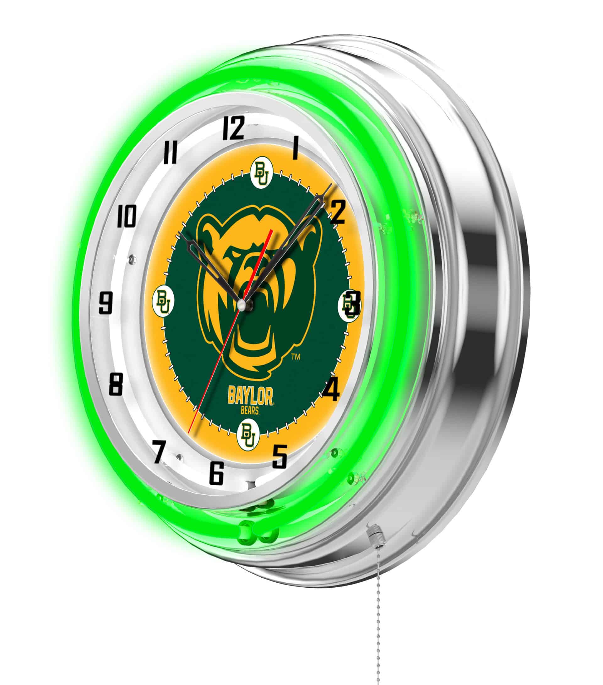 The Baylor University 19-Inch Neon Logo Clock in Chrome is the ultimate addition to any fan’s collection, showcasing vibrant team pride with its striking design. This clock features a chrome casing and a neon outer ring that complements the custom printed clock face, illuminated by a brilliant white inner neon ring. The neon rings are conveniently operated with a pull chain, allowing for easy on and off. Powered by a UL Listed transformer and standard 120V outlet, it ensures accurate timekeeping with quartz movement, requiring only a single AA battery (not included). Perfect as a gift for graduates, sports enthusiasts, or for personal enjoyment, this clock is a stylish way to celebrate your team loyalty.