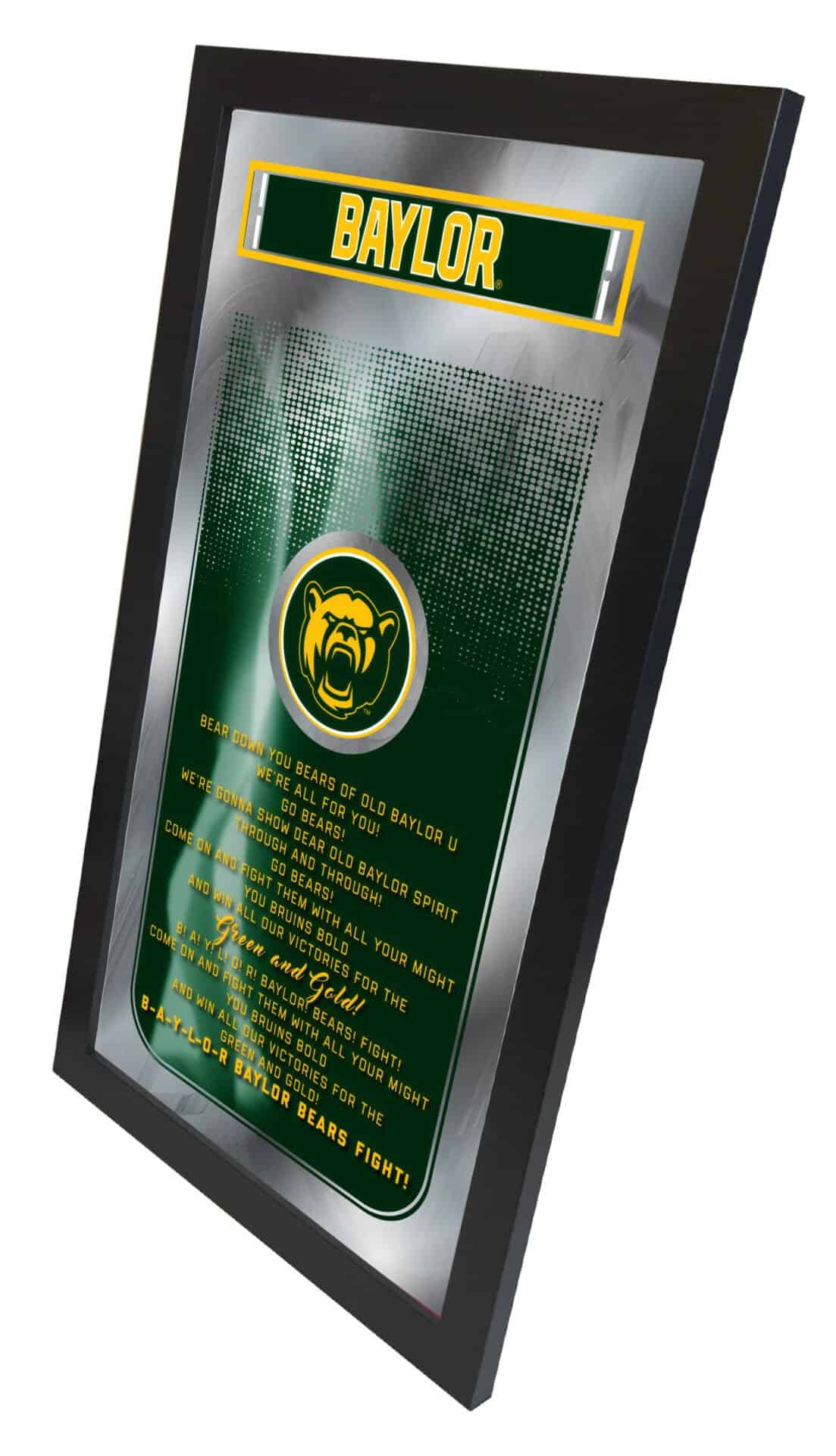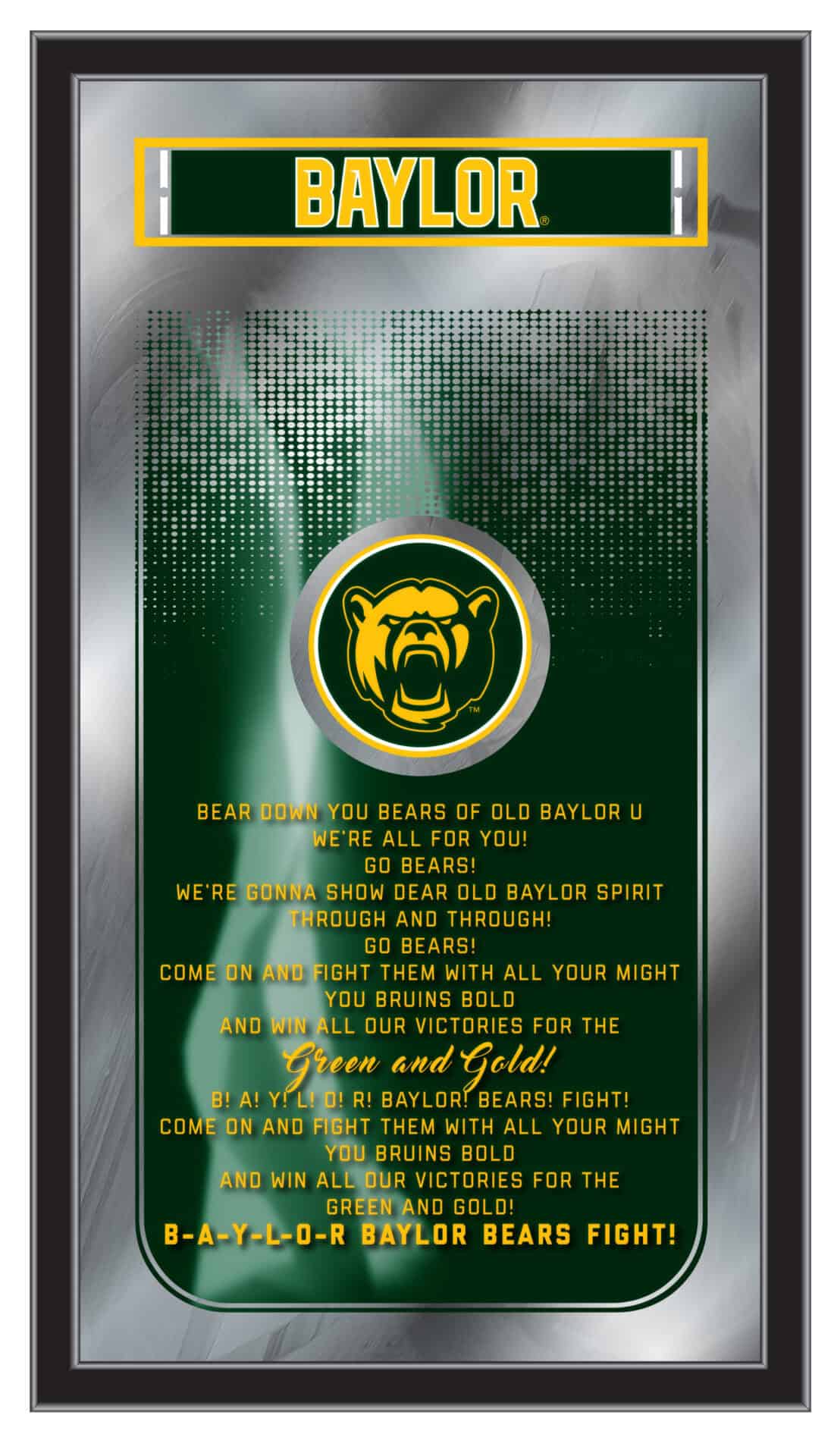 The Baylor University 26×15 Fight Song Wall Mirror is the perfect way to showcase your school spirit. Featuring vibrant, full-color artwork that proudly displays your school’s logo and fight song verses, this mirror adds a touch of elegance to any space. The design includes a 1/8″ thick glass that enhances the colors and is framed with a sleek black wood frame. It’s ideal for your office, garage, or any room in the house, making it a great gift for graduates, sports fans, or yourself.