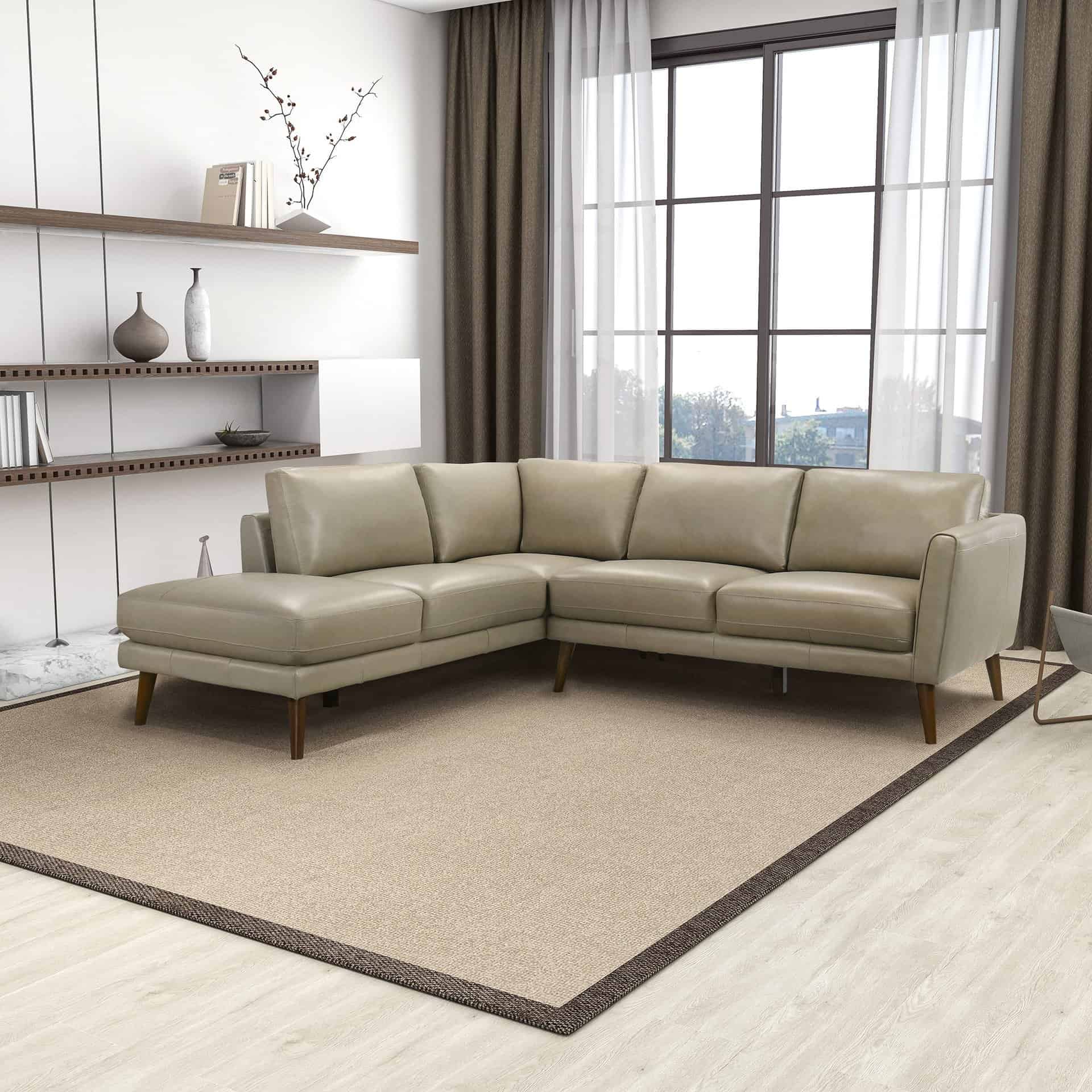 The Beige Leather Sectional Sofa with Left Facing Chaise is the perfect blend of comfort and style, making it an excellent addition to any man cave or living space. Inspired by Mid-Century Modern design, this sectional features plush, high-density foam cushions that provide exceptional comfort, ensuring it quickly becomes your favorite spot to relax. Upholstered in genuine leather, this sectional is as durable as it is elegant and can be assembled in just minutes. Its sleek design and high-quality craftsmanship make it a standout piece for your living room.