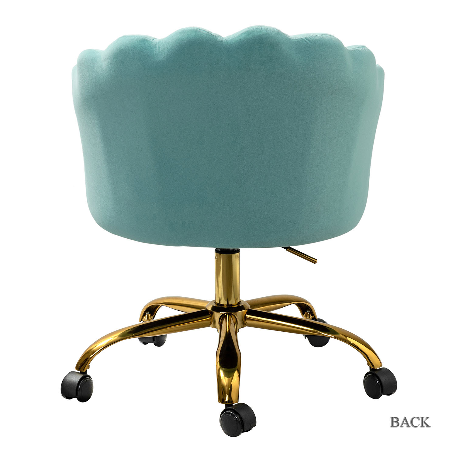 Add style to your workspace with this modern office chair. The sage velvet upholstery brings a touch of elegance to any room. The flower-shaped back and tufted details add a tailored, chic look. Enjoy comfort and support with the foam-filled seat. Move easily with the golden finish metal base and 360-degree wheels. The adjustable height lets you customize your space. This chair is perfect for any home office. It is also durable, supports up to 250 pounds, and has a seat size of 21″ x 18.5″ x 16.5-19.5″. Assembly is required.