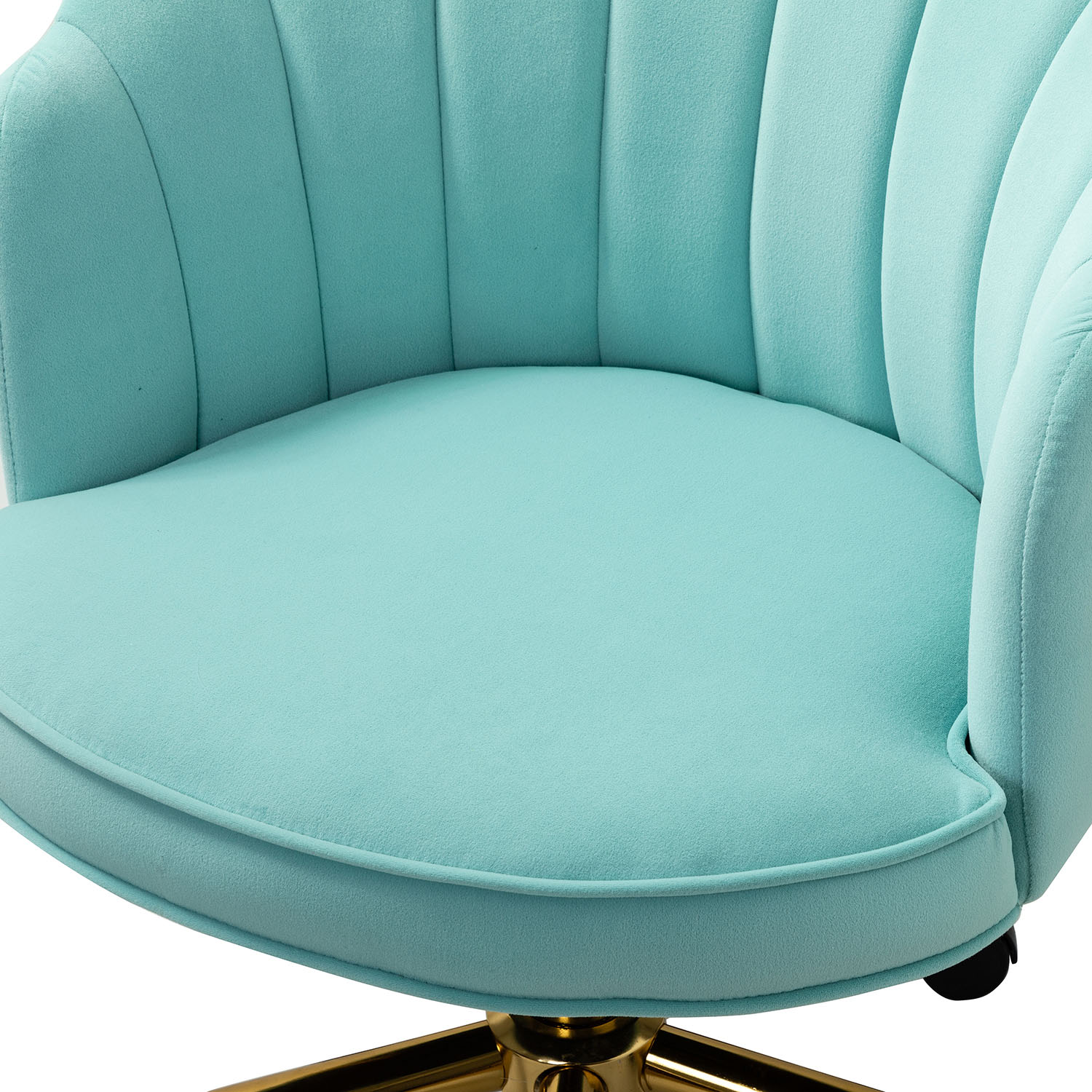 This modern swivel office chair seamlessly blends functionality with contemporary elegance, making it a stylish and practical addition to any office or home workspace. The chair features vibrant velvet fabric upholstery, a chic flower-shaped back, and comfortable foam filling, providing both support and flair. Its sturdy metal base with a golden finish and 360-degree swivel wheels ensures smooth movement and height adjustability, tailoring to your professional needs.