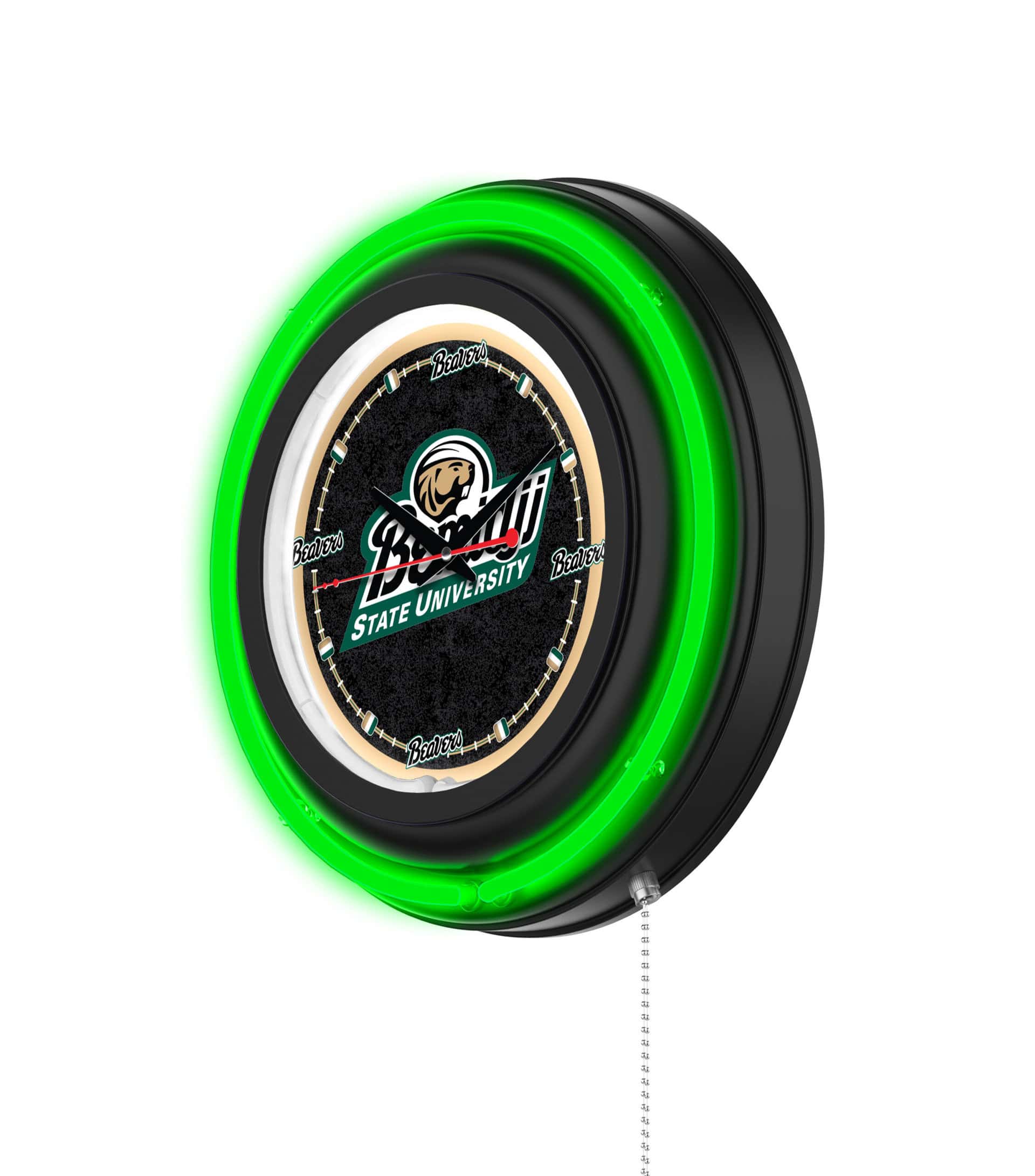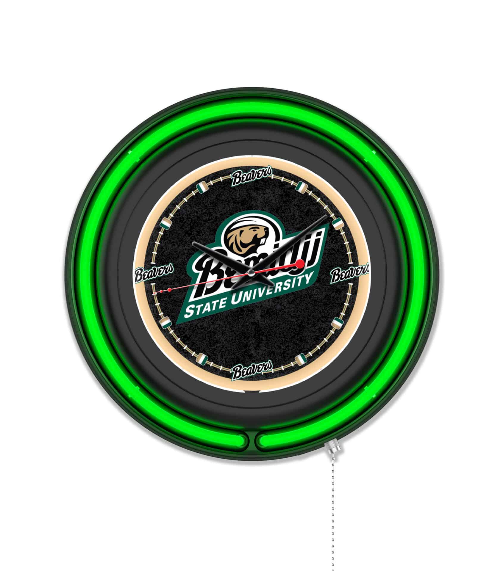 The Bemidji State University 15-Inch Neon Logo Clock in Black is the perfect addition to any man cave, showcasing school pride while providing functionality. Featuring a striking black casing and a vibrant neon outer ring specific to your team’s colors, this clock is illuminated by a brilliant white inner neon ring, ensuring visibility in any setting. The neon rings can be easily turned on and off with a convenient pull chain, and it is powered by a UL Listed transformer that plugs into a standard 120V outlet. With accurate quartz movement, this clock not only looks great but also keeps perfect time, powered by a single AA battery (not included). Ideal as a gift for graduates or sports enthusiasts, this clock combines style and practicality.
