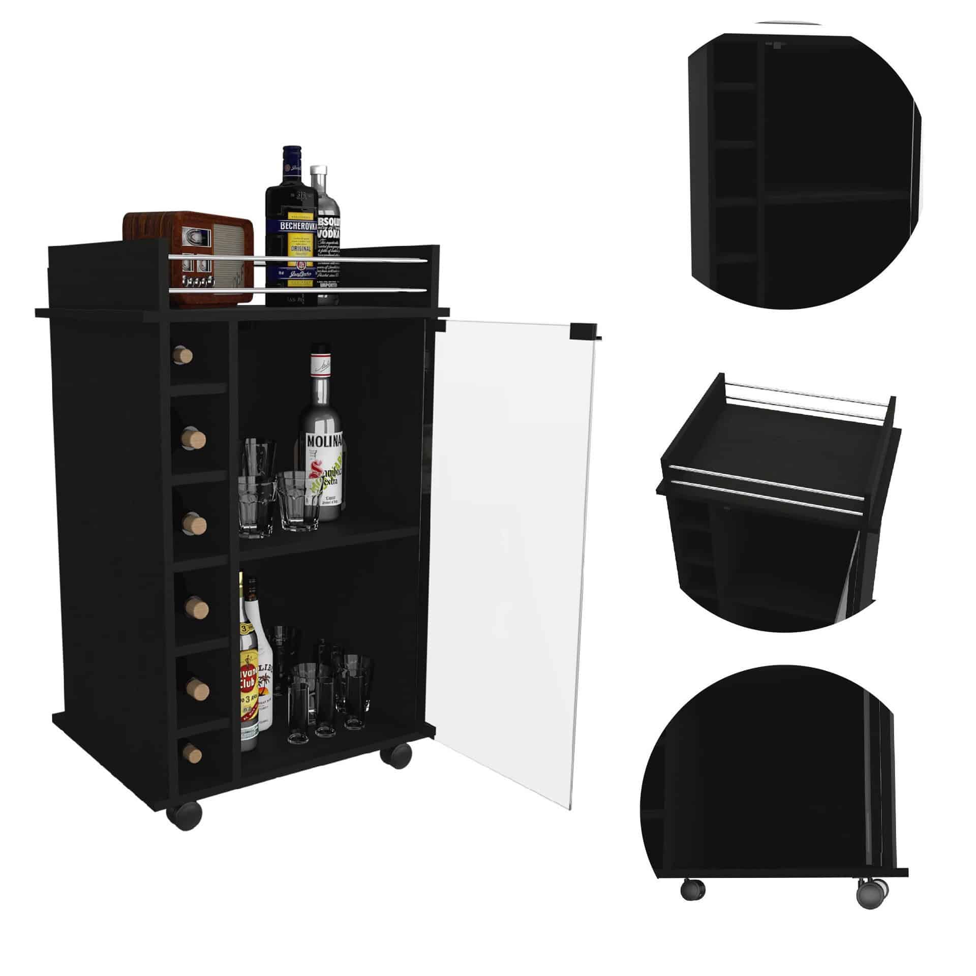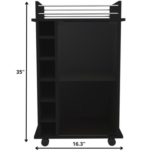 This black rolling bar cart with wine storage effortlessly combines style and functionality. Designed with a sleek black finish and a sturdy frame made of manufactured wood, this bar cart is both modern and practical. Its freestanding structure allows for easy placement in any room, while the rectangular shape adds a touch of elegance. Featuring shelves and a display stand, it provides ample space for storing wine bottles (up to 6) and other bar essentials. The built-in storage cabinets are perfect for organizing your glassware, while the smooth laminate top offers a durable surface for serving drinks and snacks. Convenient wheels make it easy to move the cart from room to room, ensuring effortless entertaining. Upgrade your home bar with this functional and stylish piece.
