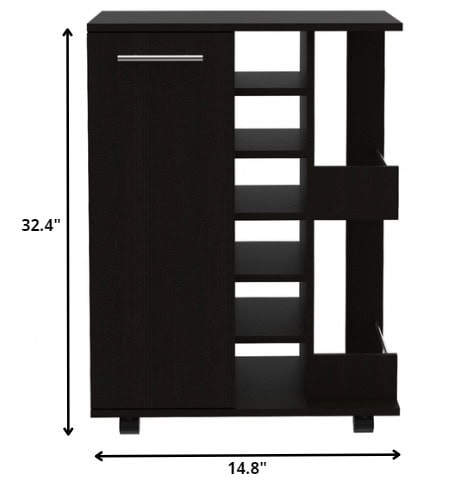 This sleek and stylish black rolling bar cart is the perfect addition to your contemporary home decor. Featuring a modern design, this bar cart enhances the look of any space while offering functionality and practicality. The freestanding cart includes a spacious display stand cabinet with shelves, ideal for showcasing your favorite barware and spirits. Built with durable high-quality particle board, this bar cart ensures long-lasting use. Its mobility is enhanced with wheels, making it easy to move around as needed. Additionally, the cart features a dedicated wine storage section that holds up to 6 bottles, perfect for wine enthusiasts. Elevate your entertaining experience with this versatile and durable bar cart.