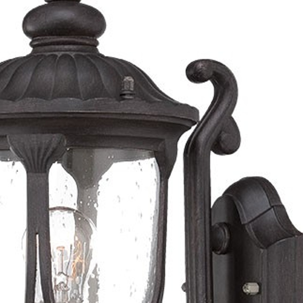 Elevate the look of your home with this Black Traditional Cast Aluminum Glass Lantern Wall Light. Featuring a durable cast aluminum construction and clear seeded bubble glass panels, this wall light combines functionality with timeless style. The traditional design includes a curved shield-shaped wall bracket, a two-tier lantern top, and a thin frame that houses clear glass panels to allow the bulb to shine through. Perfect for enhancing the ambiance of your front door, backyard, or shed area, this light fixture is easy to install and built to last.