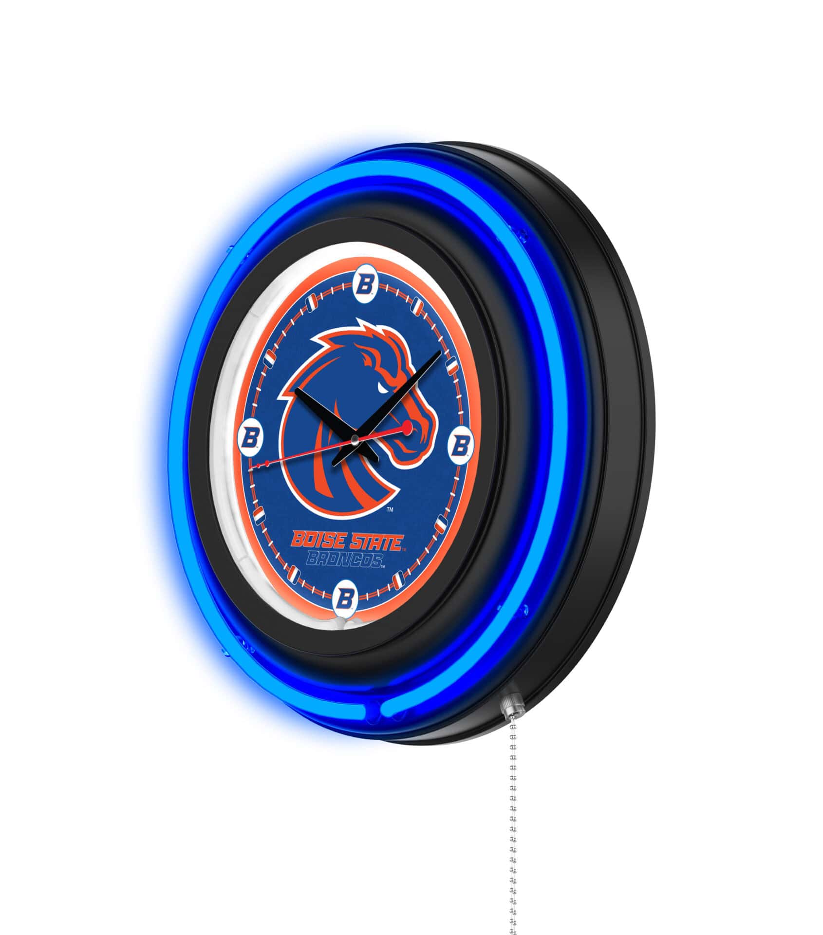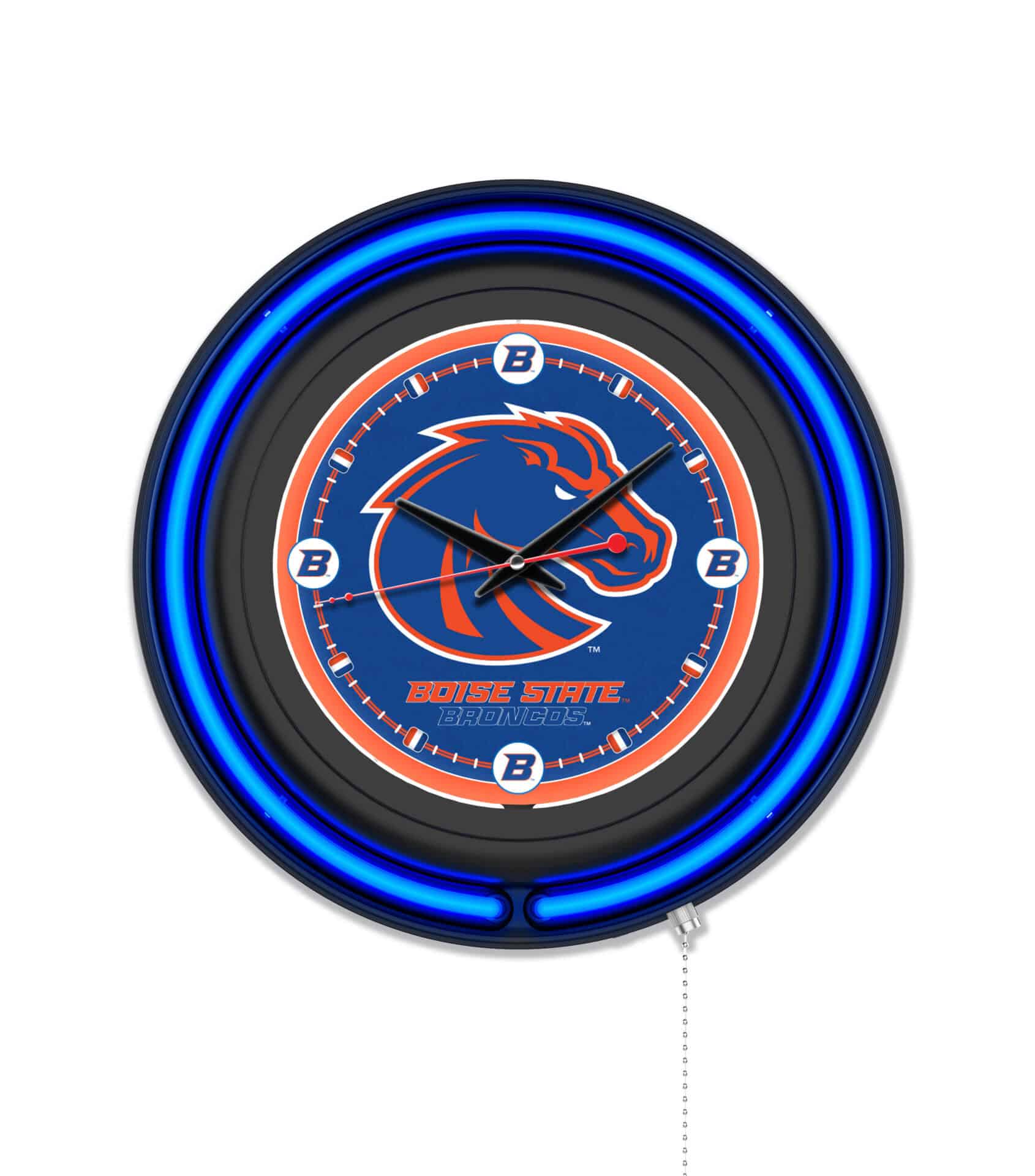 The Boise State University 15-Inch Neon Logo Clock in Black is an eye-catching addition to any man cave, showcasing your school pride in a vibrant and stylish way. Featuring a sleek black casing, this clock is highlighted by a team color-specific neon outer ring and a brilliant white inner neon ring that illuminates the custom printed clock face. The neon rings can be easily turned on and off with a pull chain, and the clock is powered by a UL Listed power transformer compatible with standard 120V outlets. With accurate quartz movement, this clock ensures precise timekeeping while being powered by a single AA battery (not included). Perfect as a gift for graduates, sports enthusiasts, or for personal use, this clock combines functionality with a bold display of school spirit.
