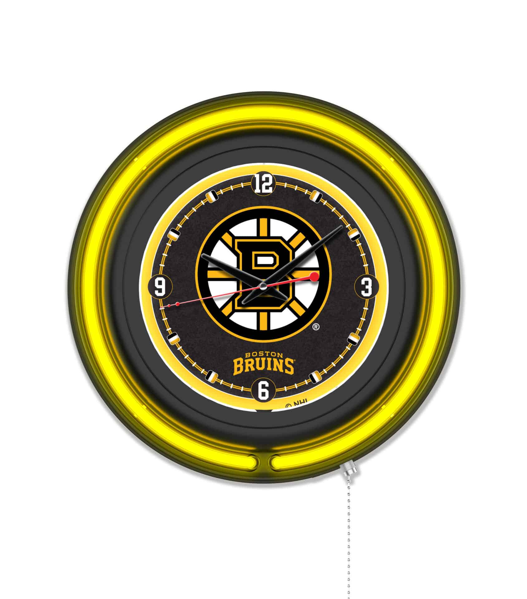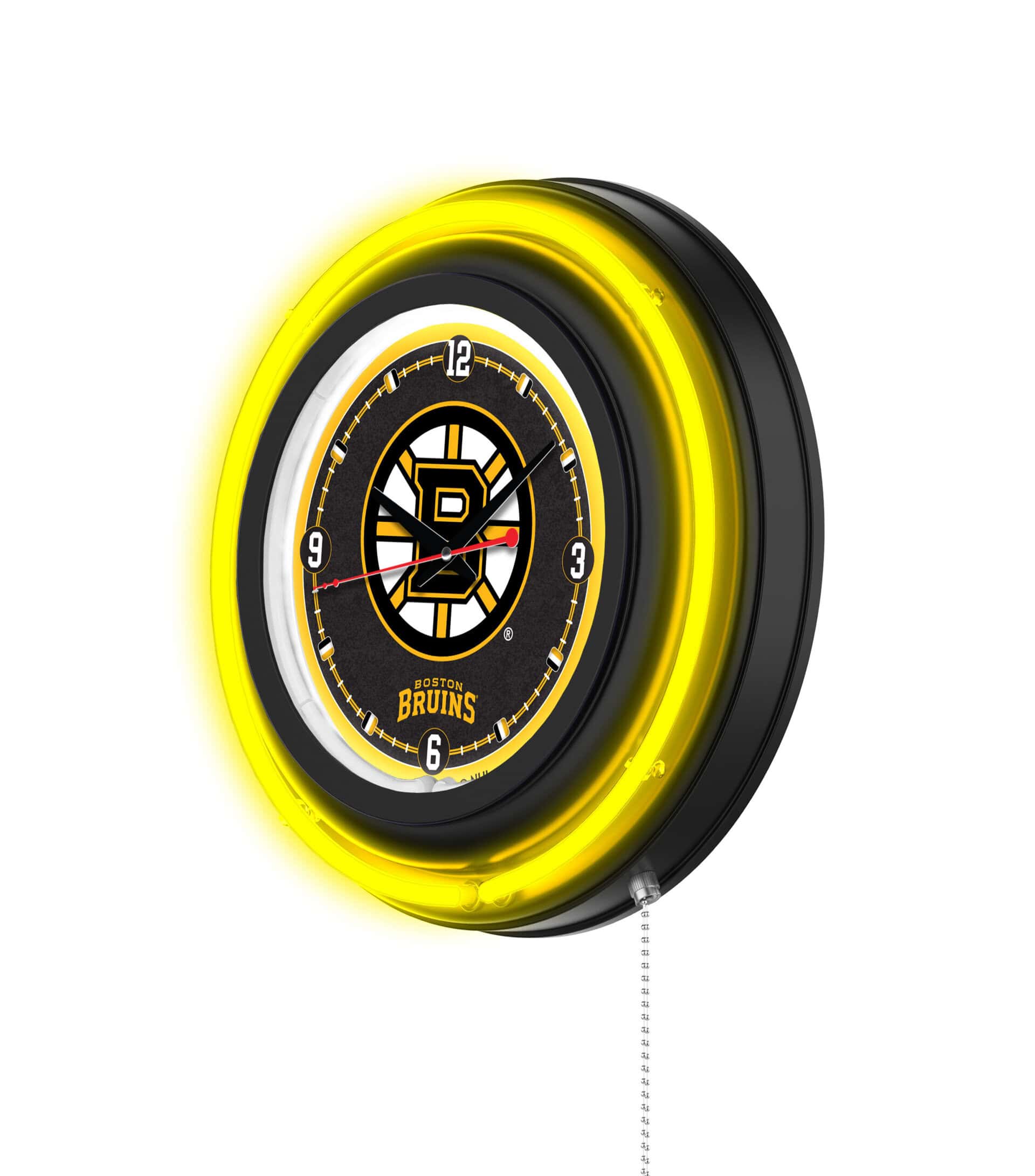 The Boston Bruins 15-Inch Neon Logo Clock in Black is the ultimate addition to your man cave, showcasing your team pride with vibrant neon accents. Featuring a sleek black casing and a striking neon outer ring in team colors, this clock not only tells time but enhances your decor. The clock face is illuminated by a brilliant white inner neon ring, creating a stunning visual effect. With a convenient pull chain for easy on/off operation, this clock is powered by a UL Listed transformer, ensuring durability and safety. The accurate quartz movement keeps perfect time, requiring just a single AA battery (not included). Ideal for gifting or personal use, this clock is a must-have for any sports enthusiast.