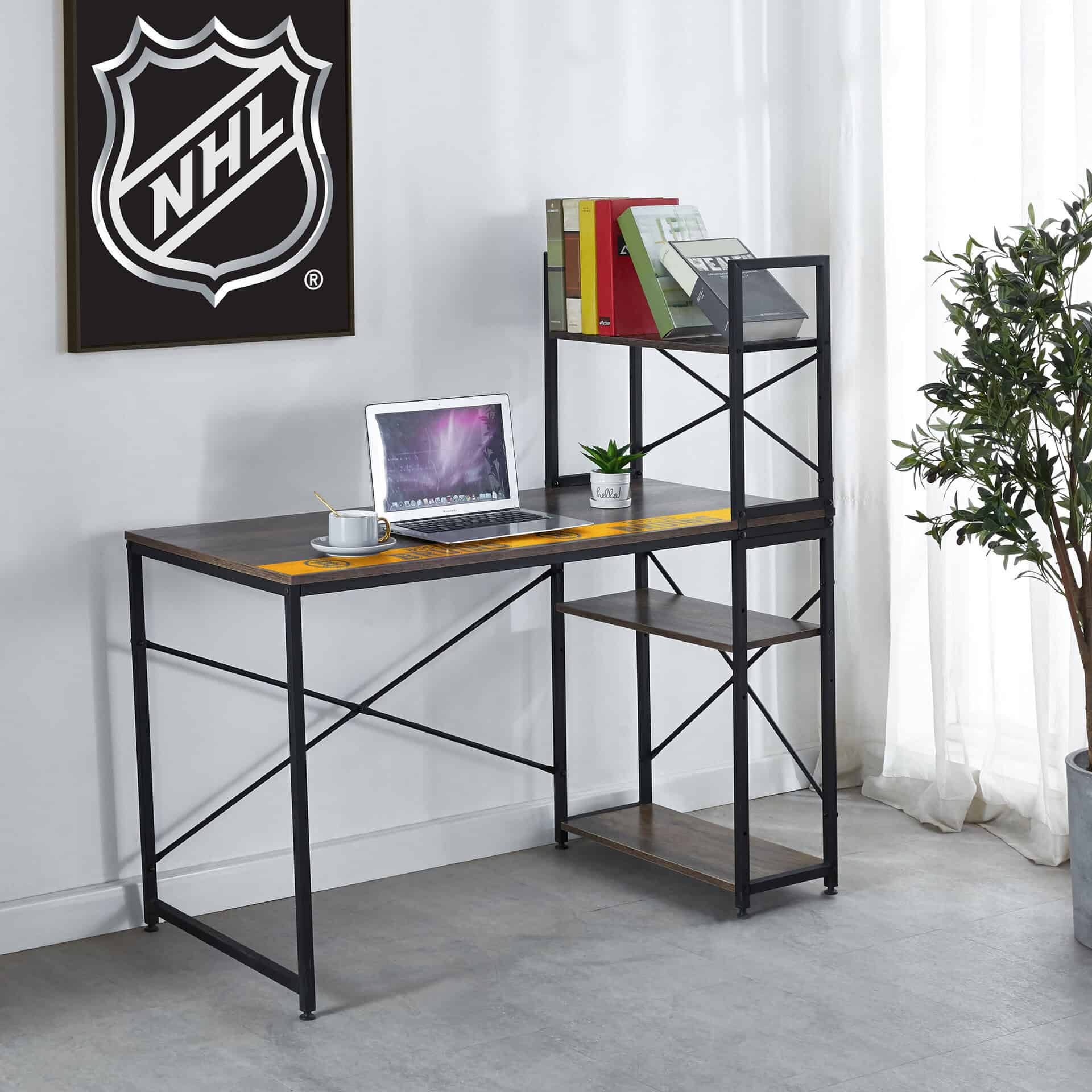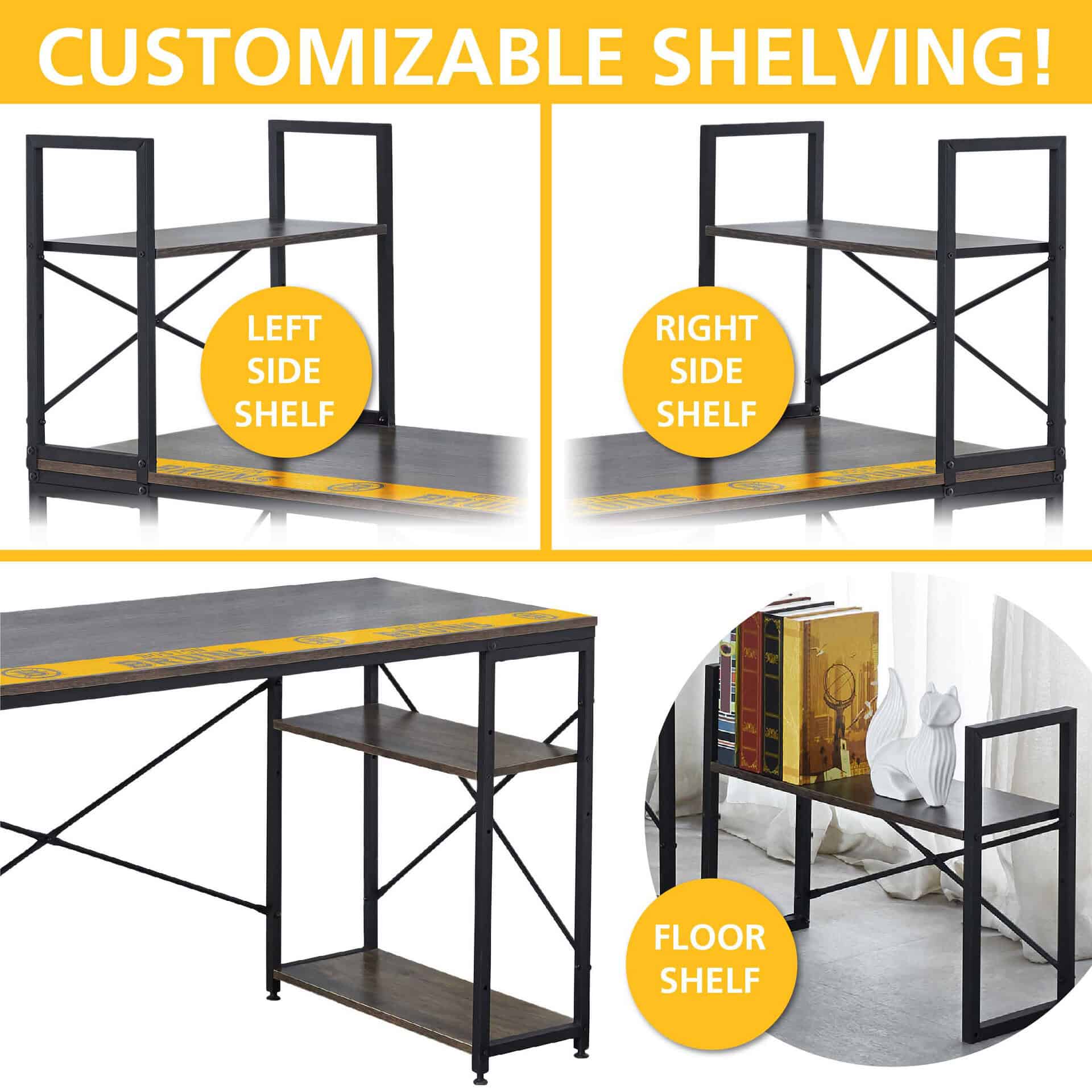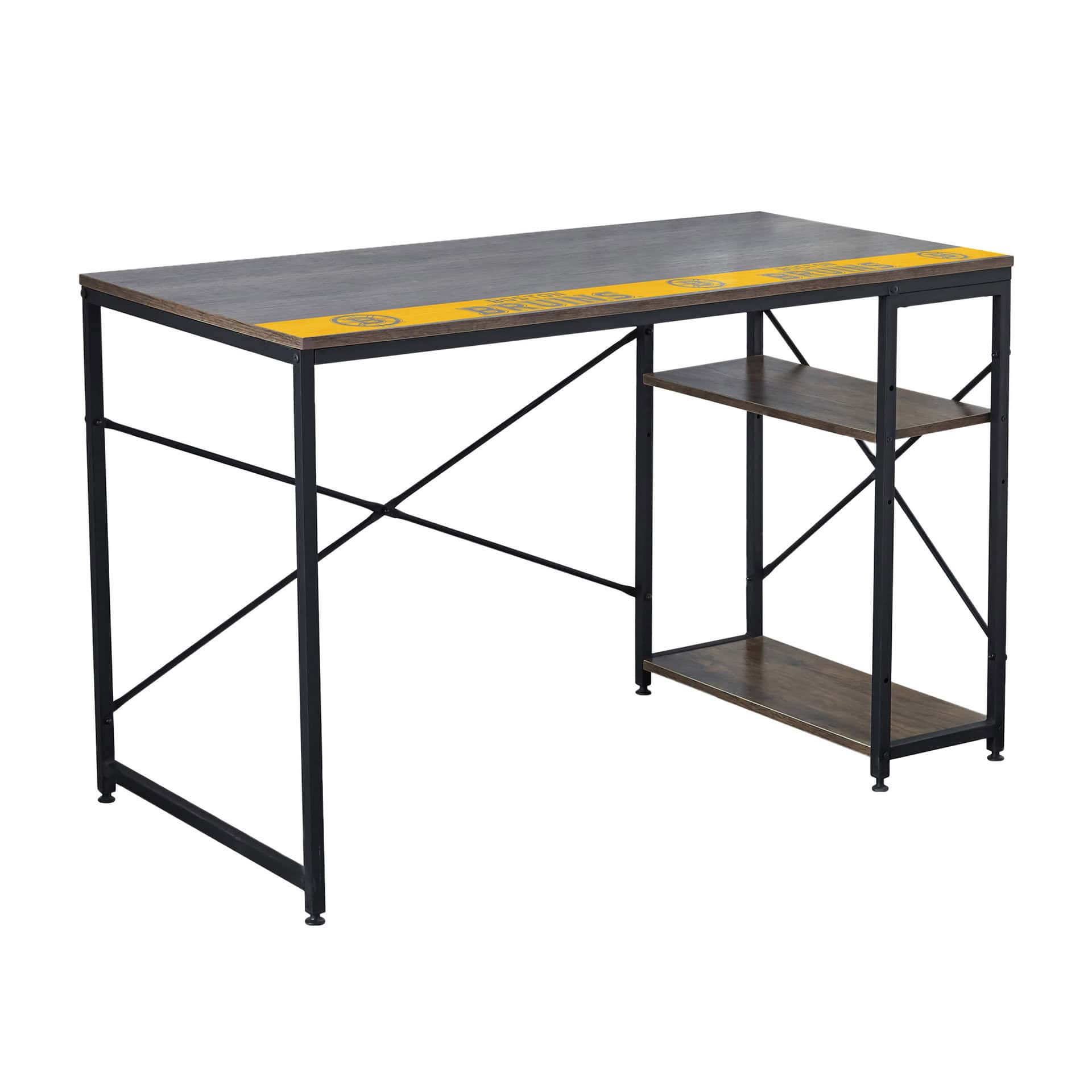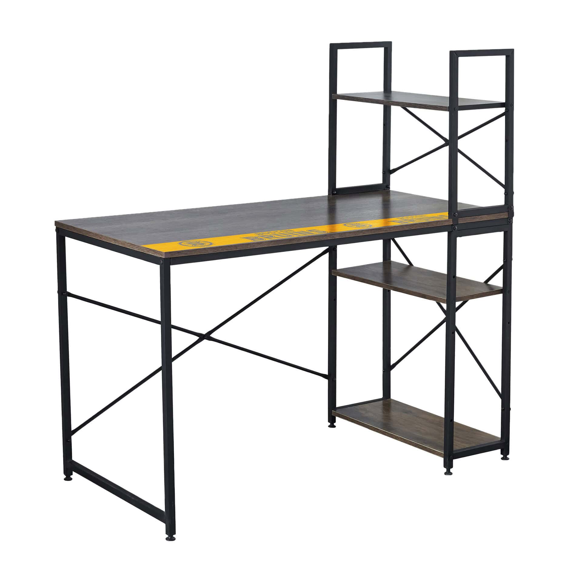 This space-saving office desk allows you to customize your workspace while showing off your team pride. Its unique shelf design system offers ample storage and organization options, both above and below the desk surface. The industrial-inspired look, combined with a reclaimed wood laminate desktop, complements various room decors, making it ideal for writing or as a computer workstation.
