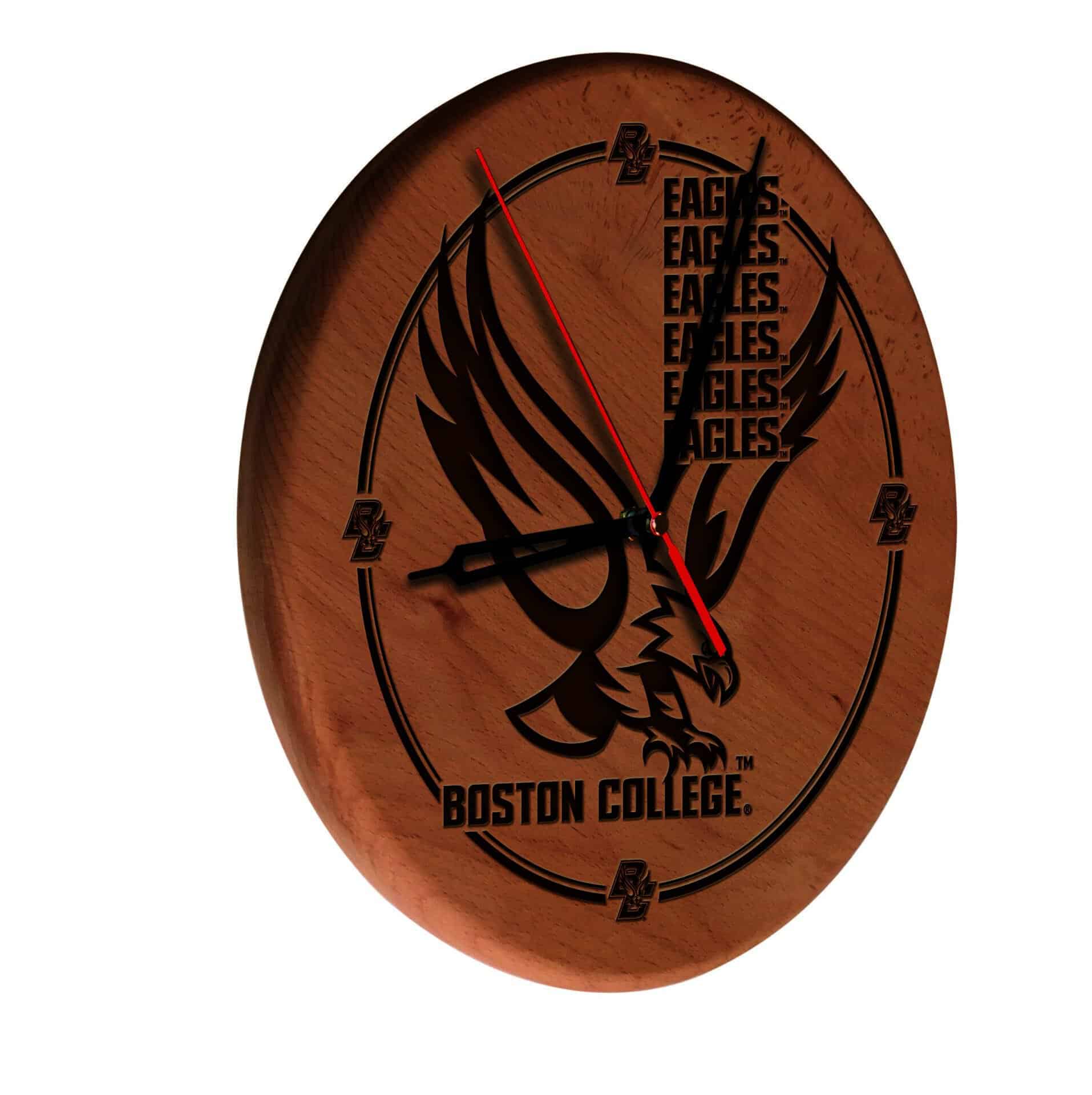 The Boston College 13-Inch Solid Wood Engraved Clock in Natural is an excellent addition to any man cave, showcasing your school pride while providing functional timekeeping. This officially licensed clock features laser engraved graphics that highlight your favorite institution, making it a perfect gift for graduates, sports fans, or even for personal use. The clock’s accurate quartz movement ensures reliable timekeeping, powered by a single AA battery (not included). Designed with a recessed keyhole hanger, it hangs flat against the wall, giving your space a polished look.