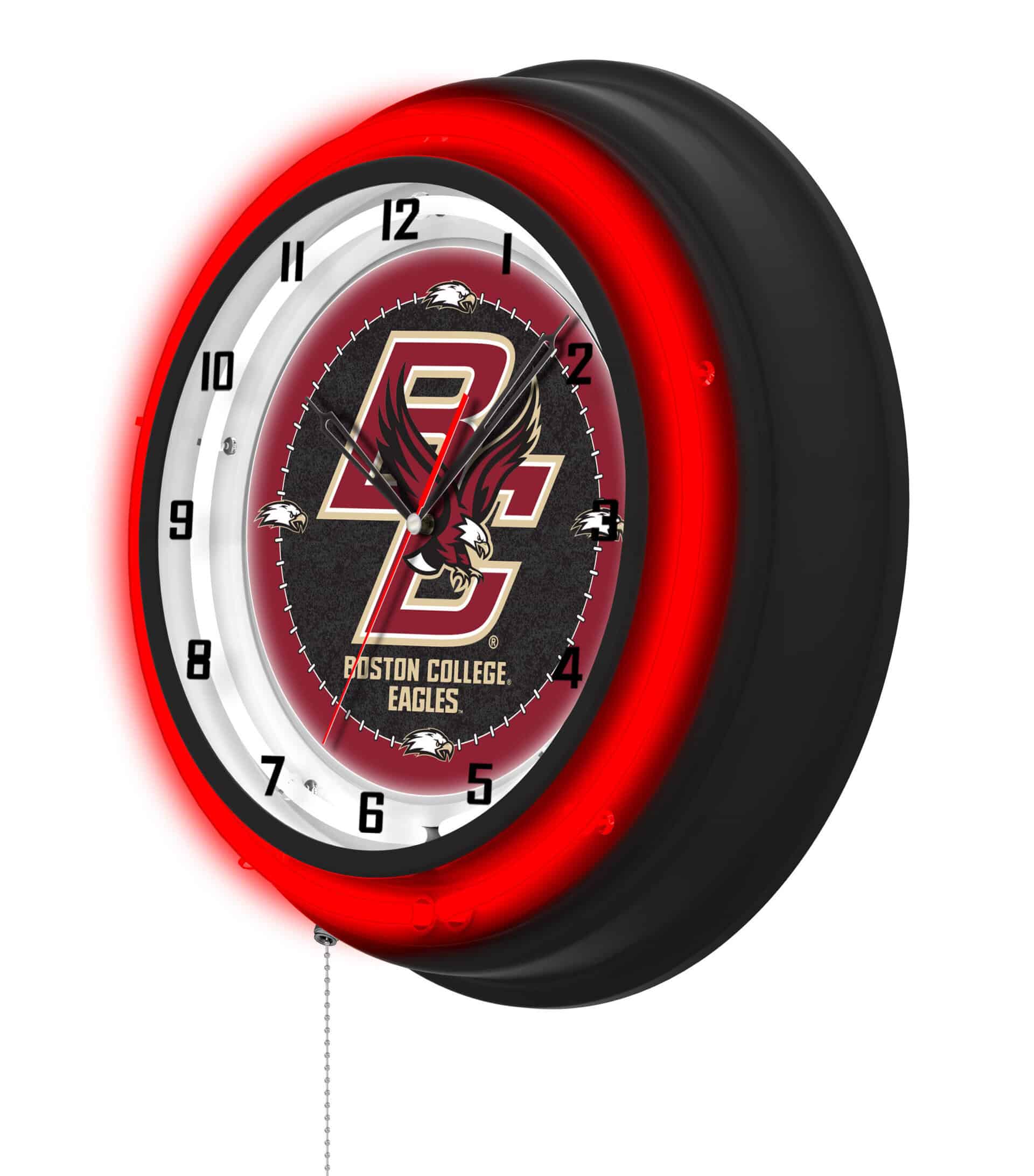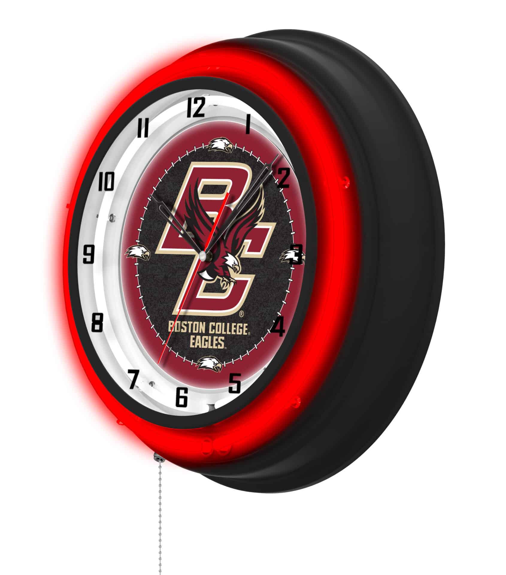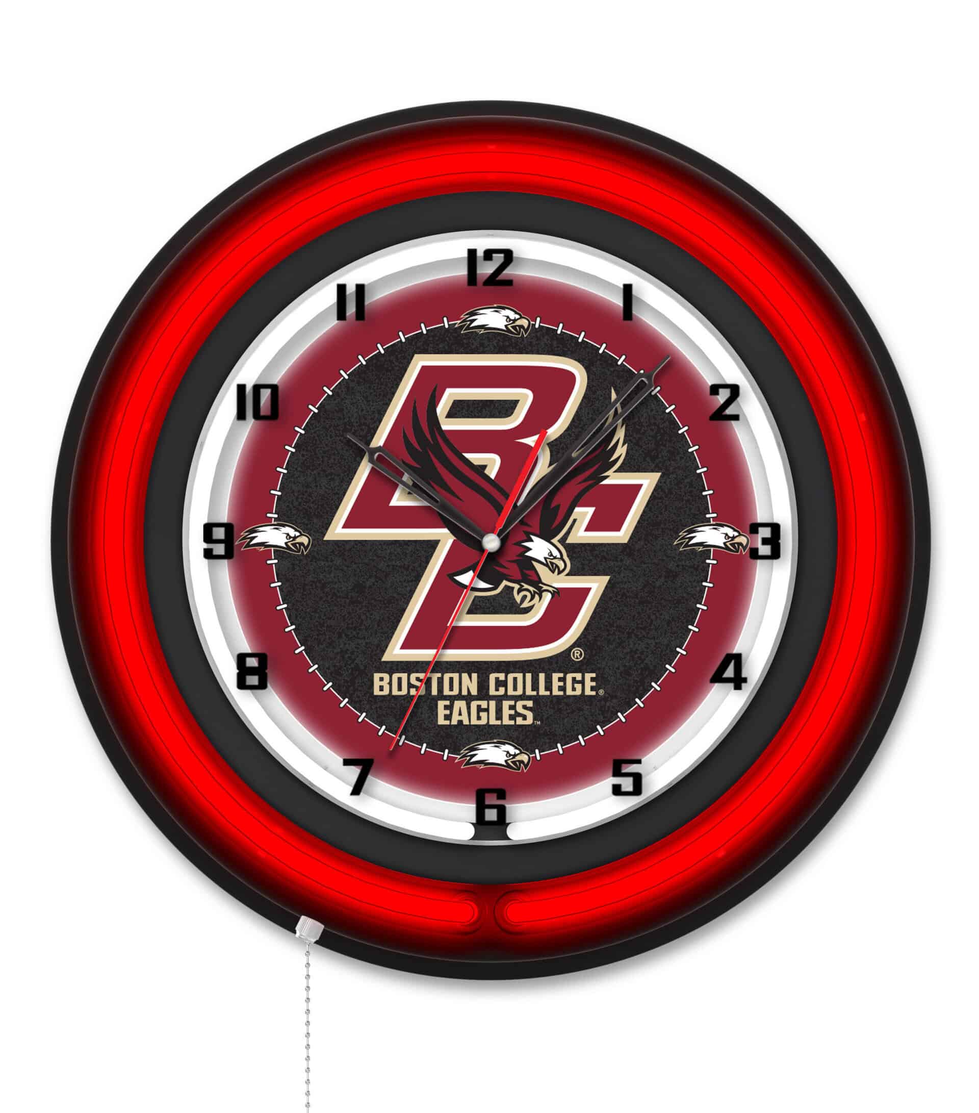 The Boston College 19-Inch Neon Logo Clock in Black is a stunning addition to any man cave, showcasing vibrant school pride with its unique design. Featuring a sleek black casing, this clock is illuminated by a brilliant white inner neon ring and a team color-specific outer neon ring. The neon lights can be easily turned on and off with a convenient pull chain, while the clock’s accurate quartz movement ensures you always know the time. Perfect as a gift for graduates or sports enthusiasts, this clock combines functionality with style.