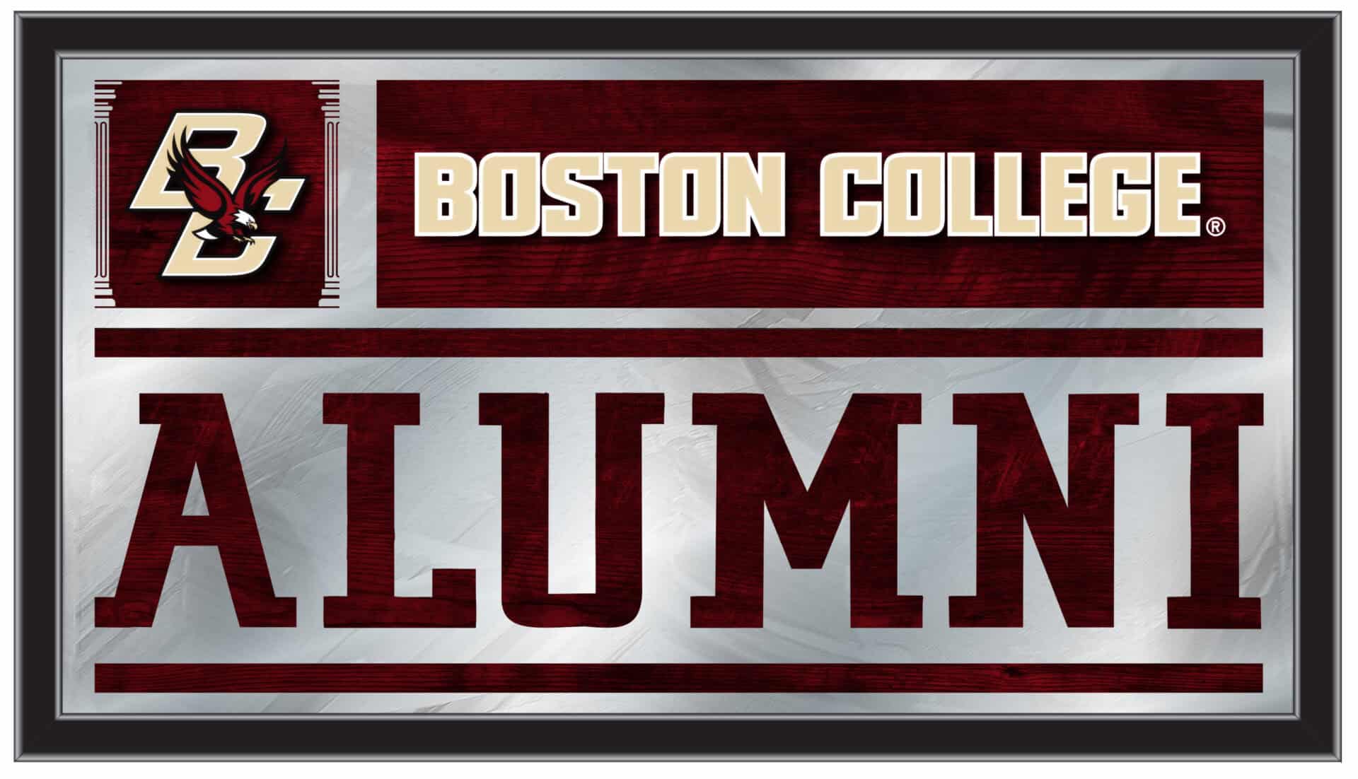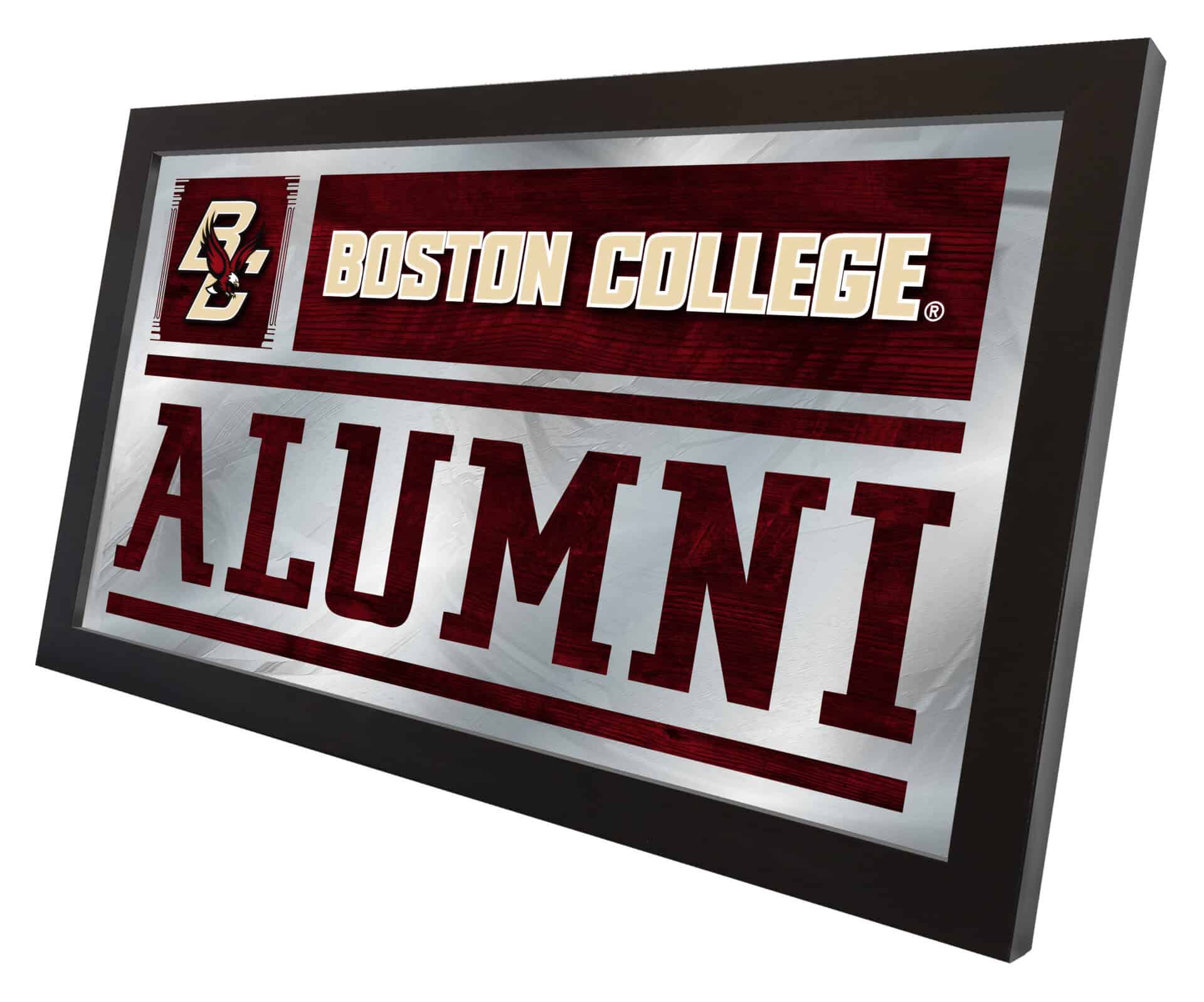 Show your school pride with the Boston College 26×15 Alumni Wall Mirror. This mirror features a simple yet elegant design that showcases your school colors through the vibrant, full-color artwork on 1/8″ thick glass, complemented by mirrored accents. The mirror is framed in a stylish black wood frame with saw tooth hangers, making it perfect for any room in your home, office, or garage. Whether you’re treating yourself or gifting a recent graduate, this mirror is a great way to celebrate your alma mater.